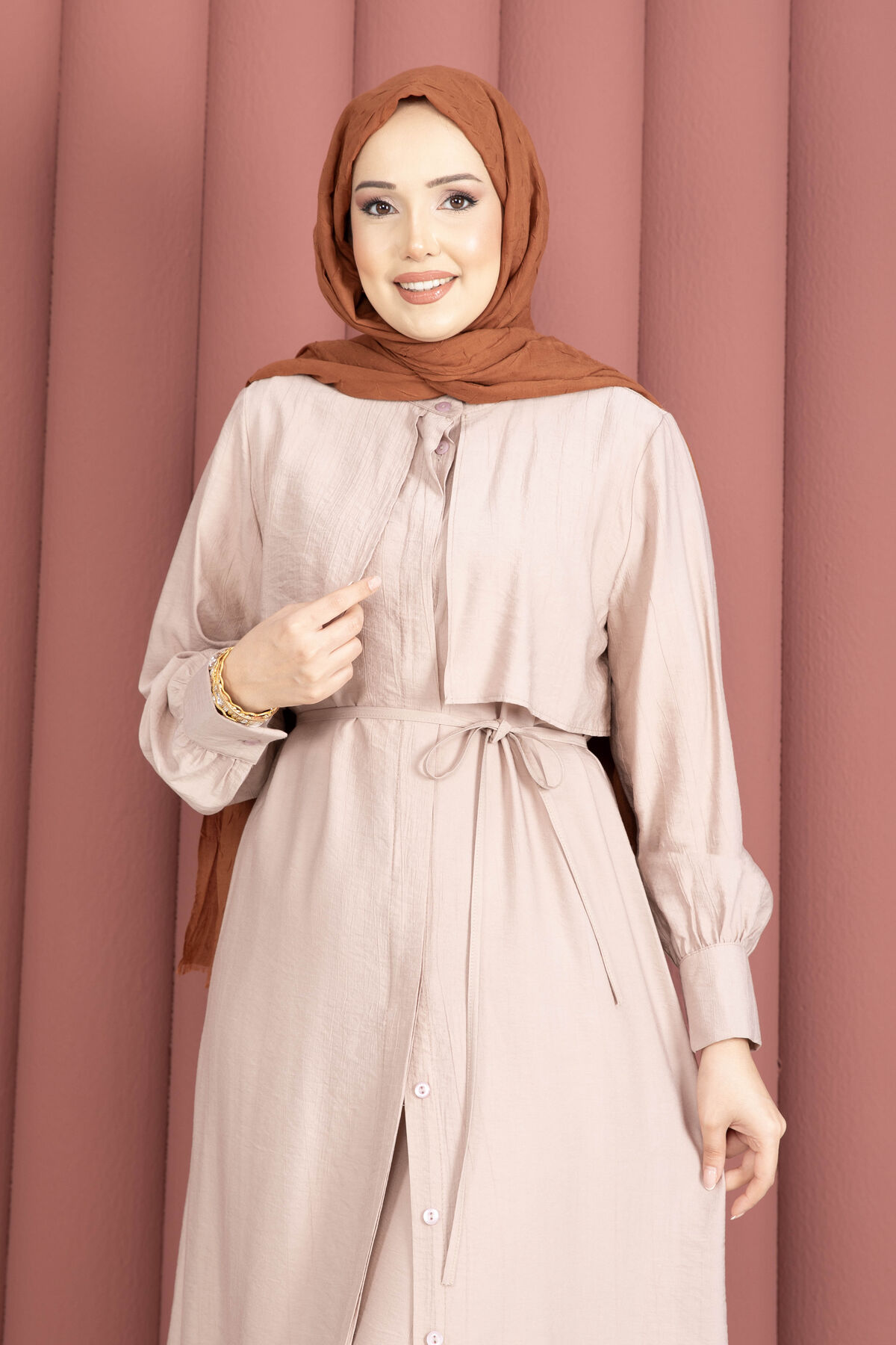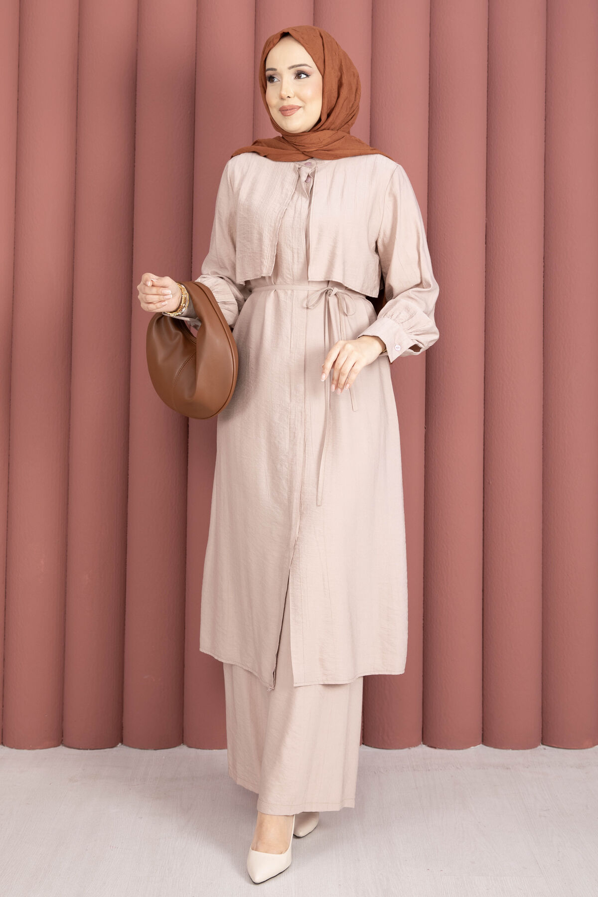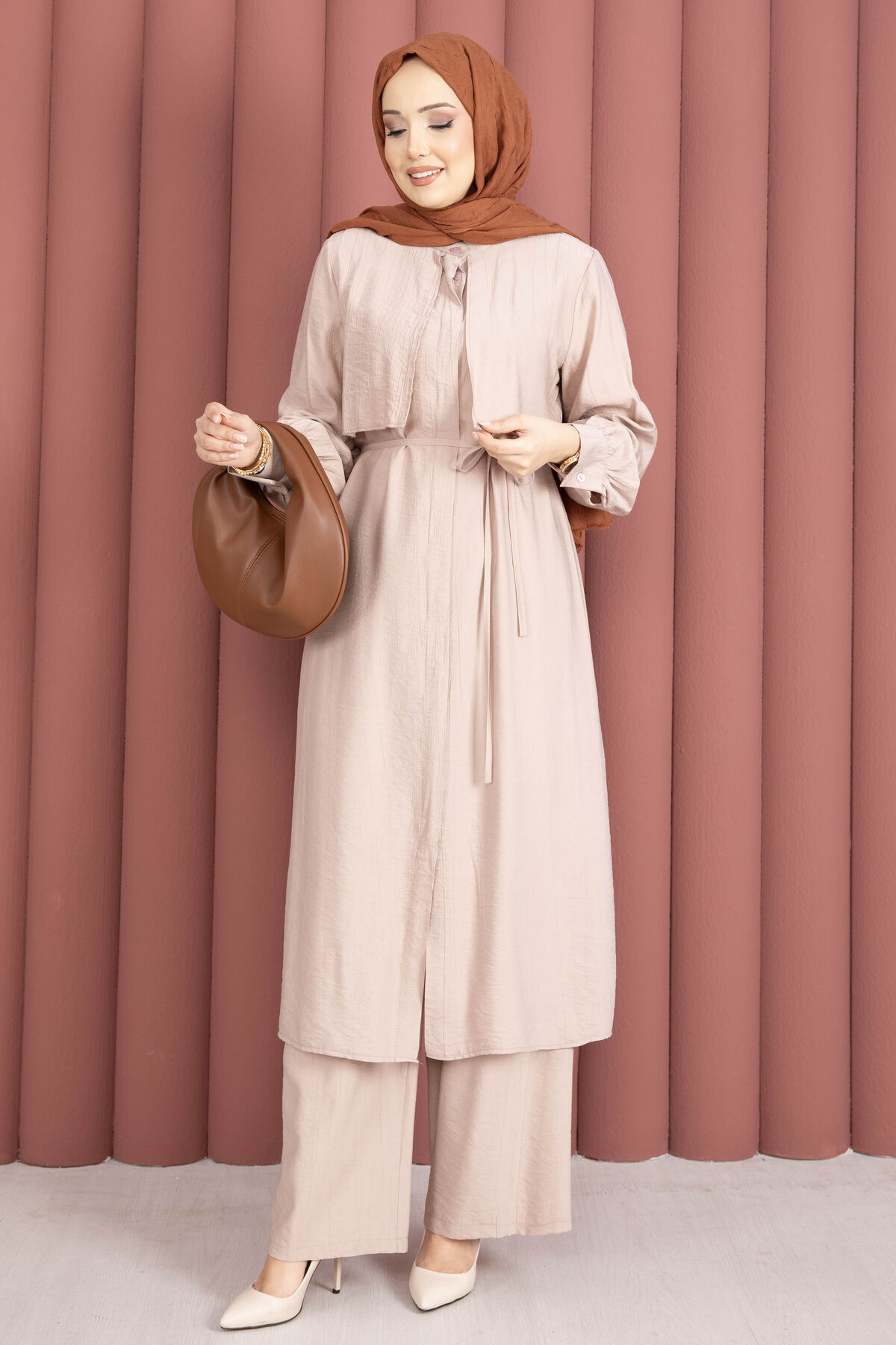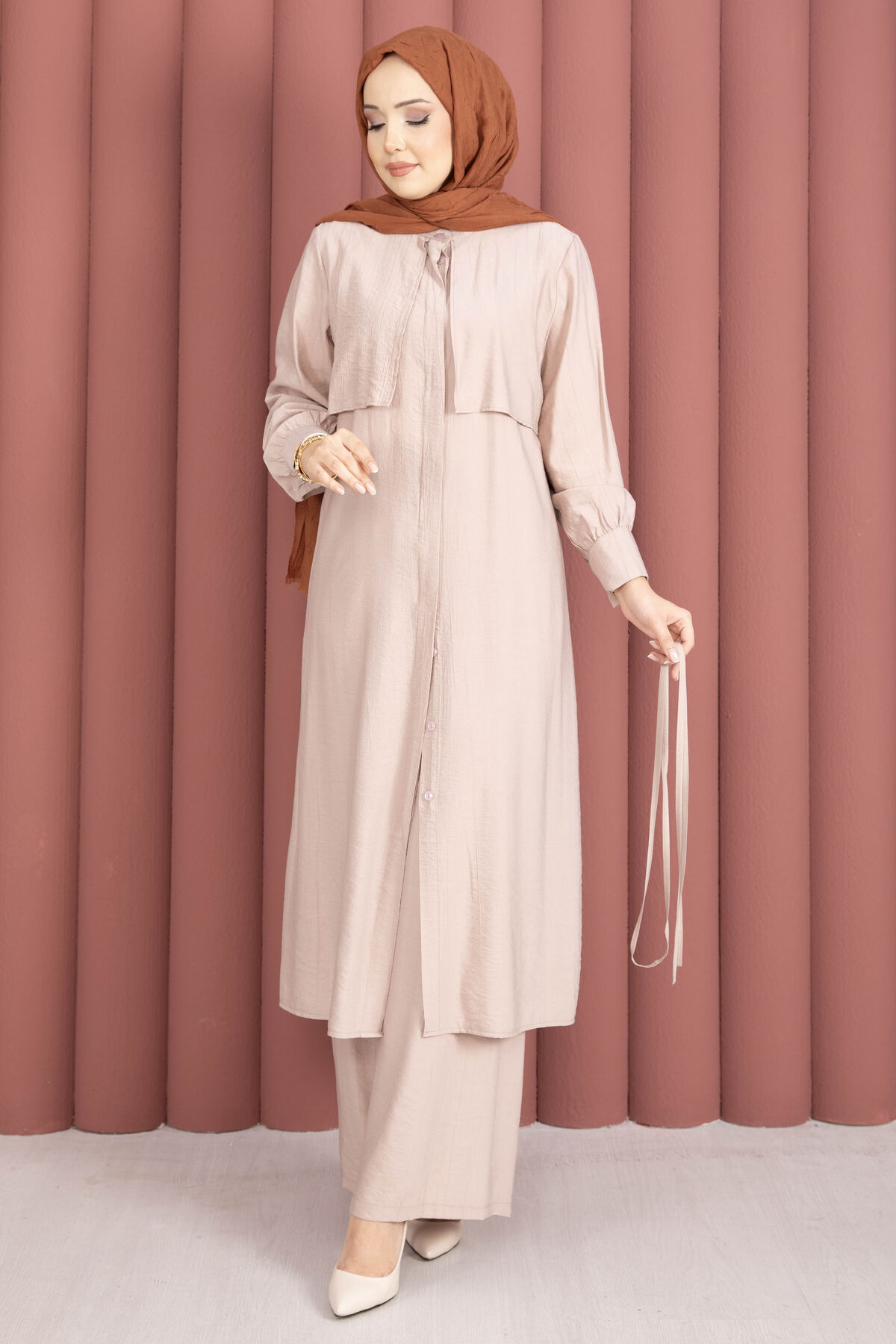 Tunik formu, seyyar kuşak detayı ile isteğe göre bel vurgusu yapılabilen esnek bir kullanım sunar. Ön kısmındaki gizli düğme kapama sayesinde sade ve temiz bir görünüm elde edilir. Pantolon ise lastikli beli ile gün boyu konfor sağlarken, düz ve zarif kesimiyle takımı tamamlar.