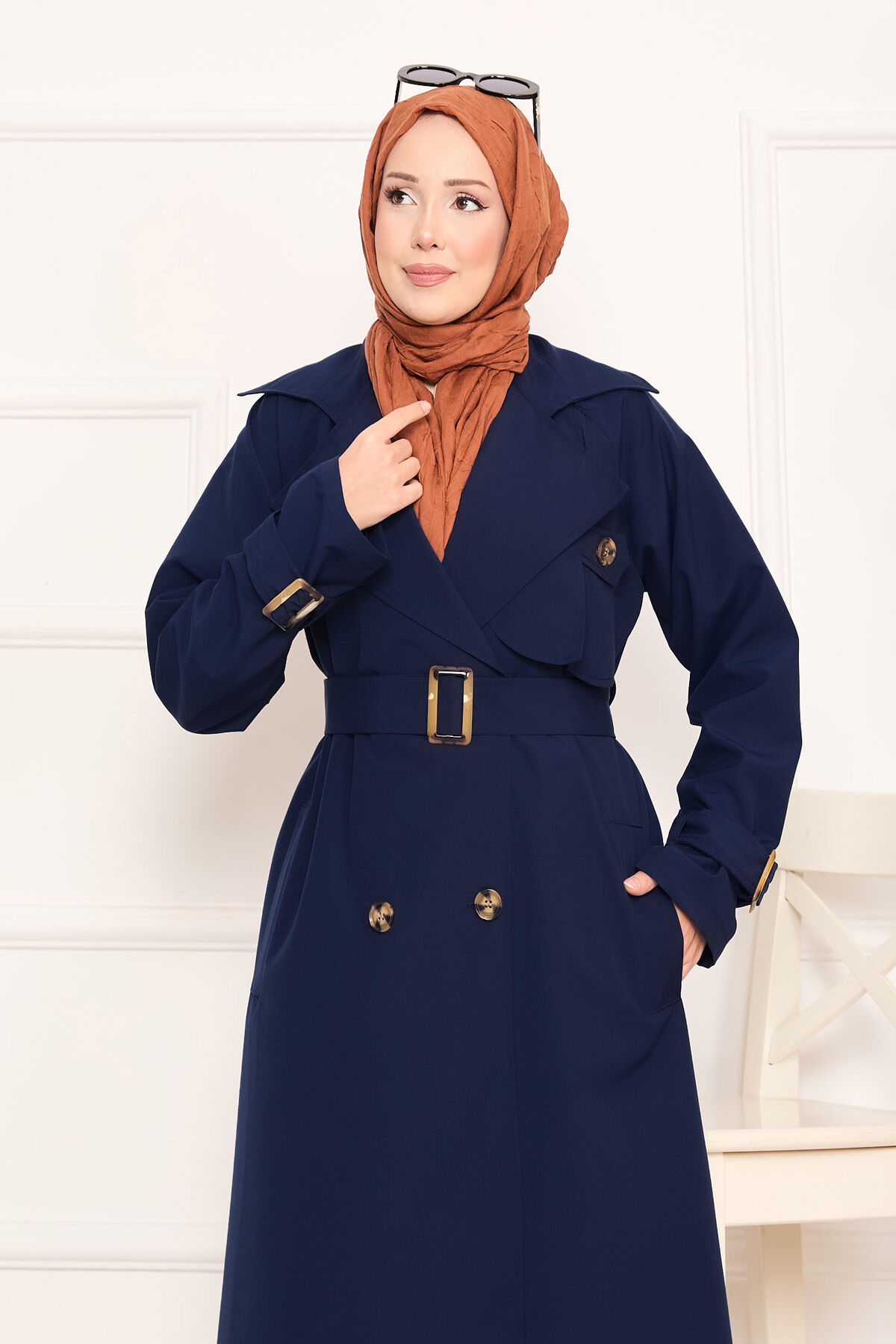 Aller Detaylı Seyyar Kuşaklı Tesettür Trençkot Lacivert