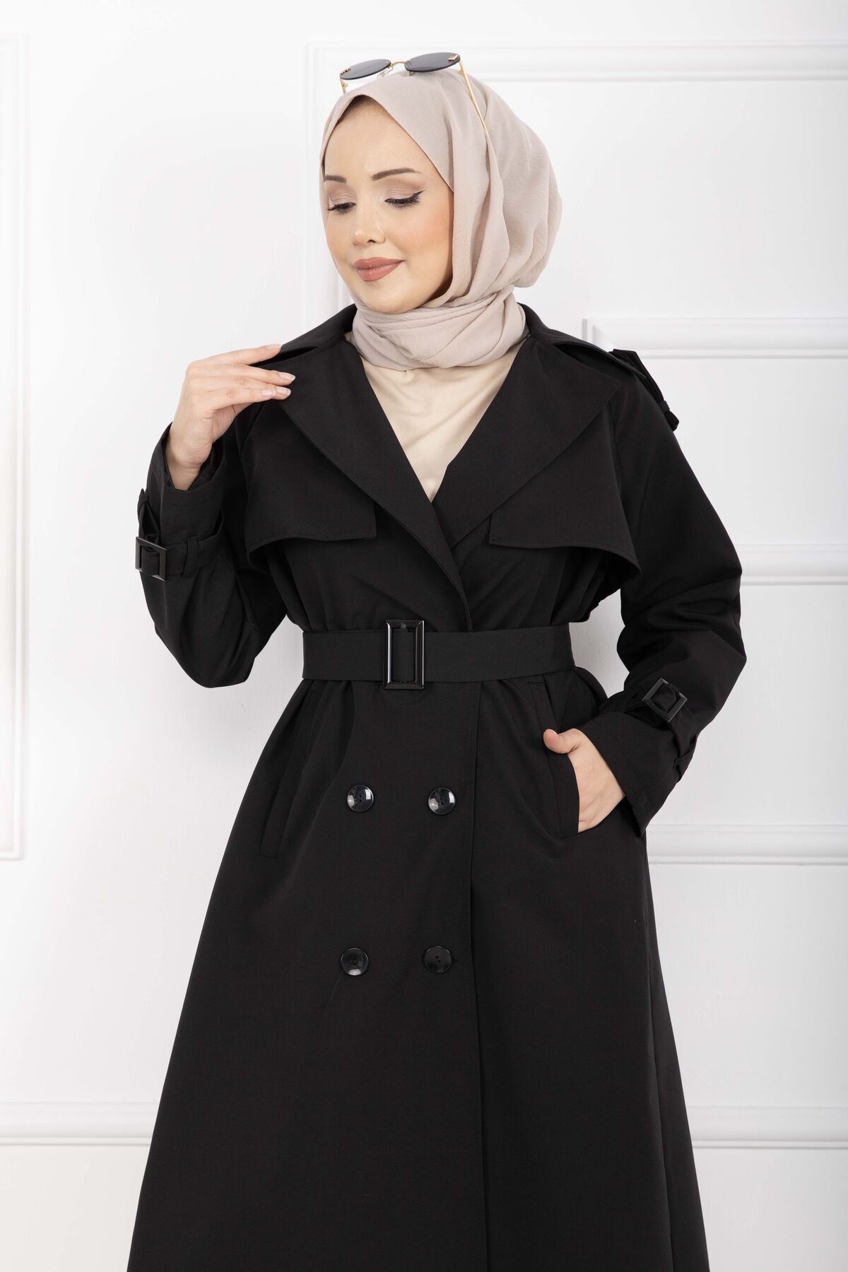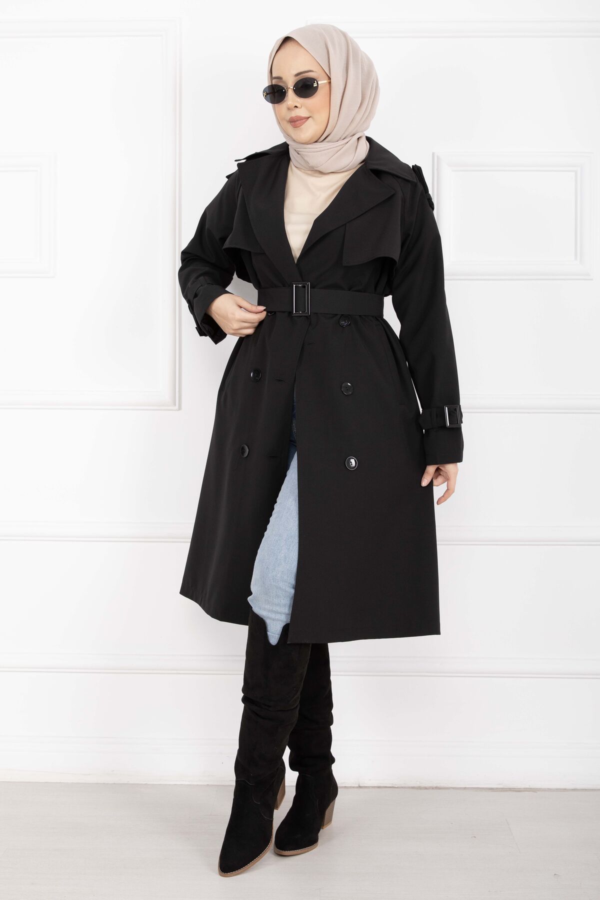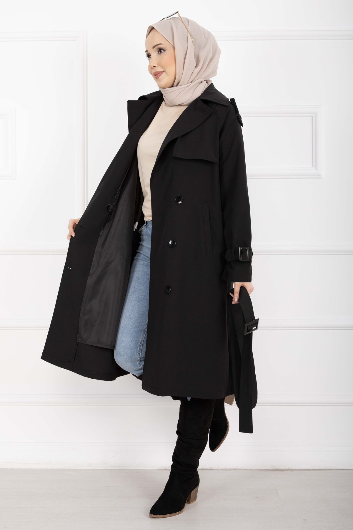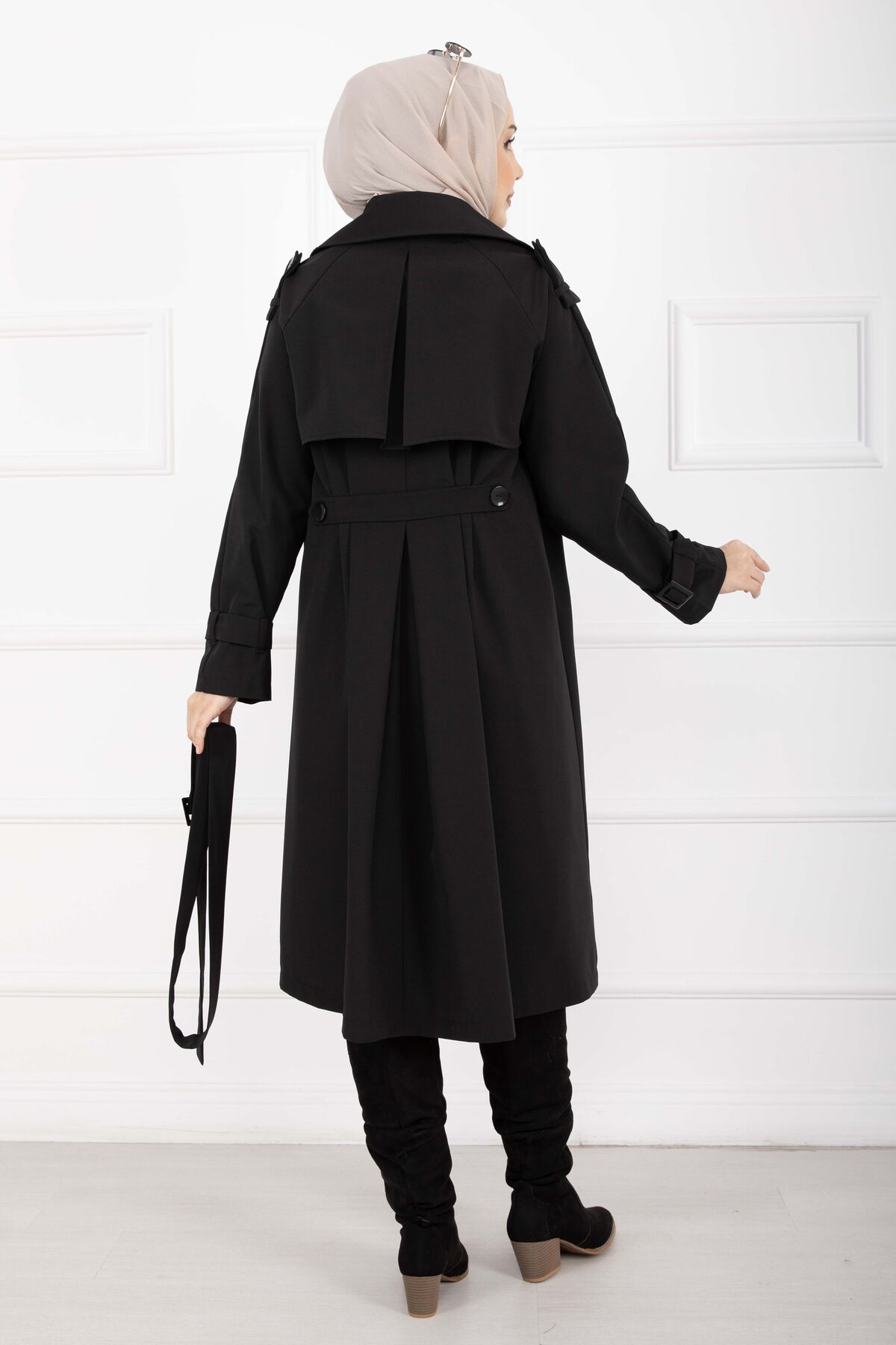 Allerli Seyyar Kuşaklı Premium Trençkot Siyah