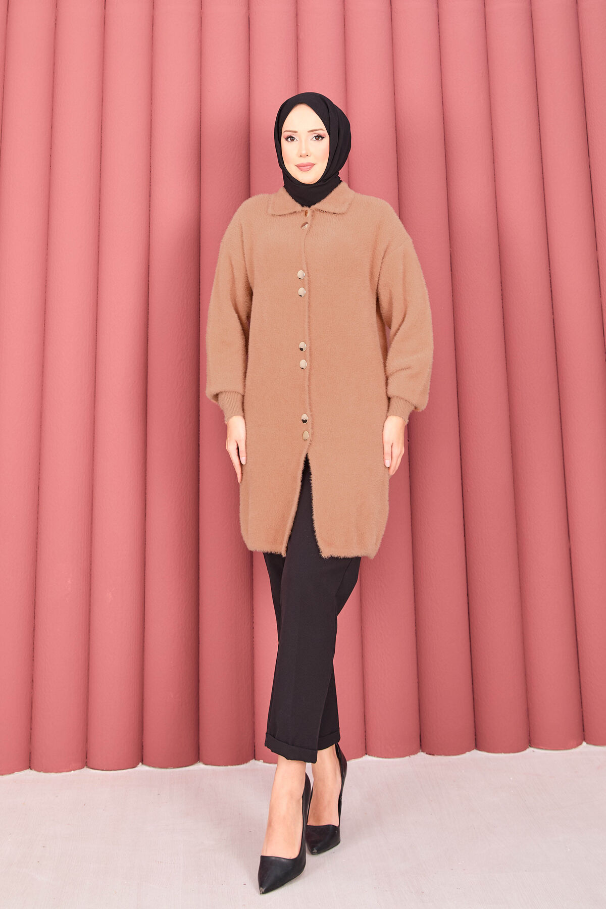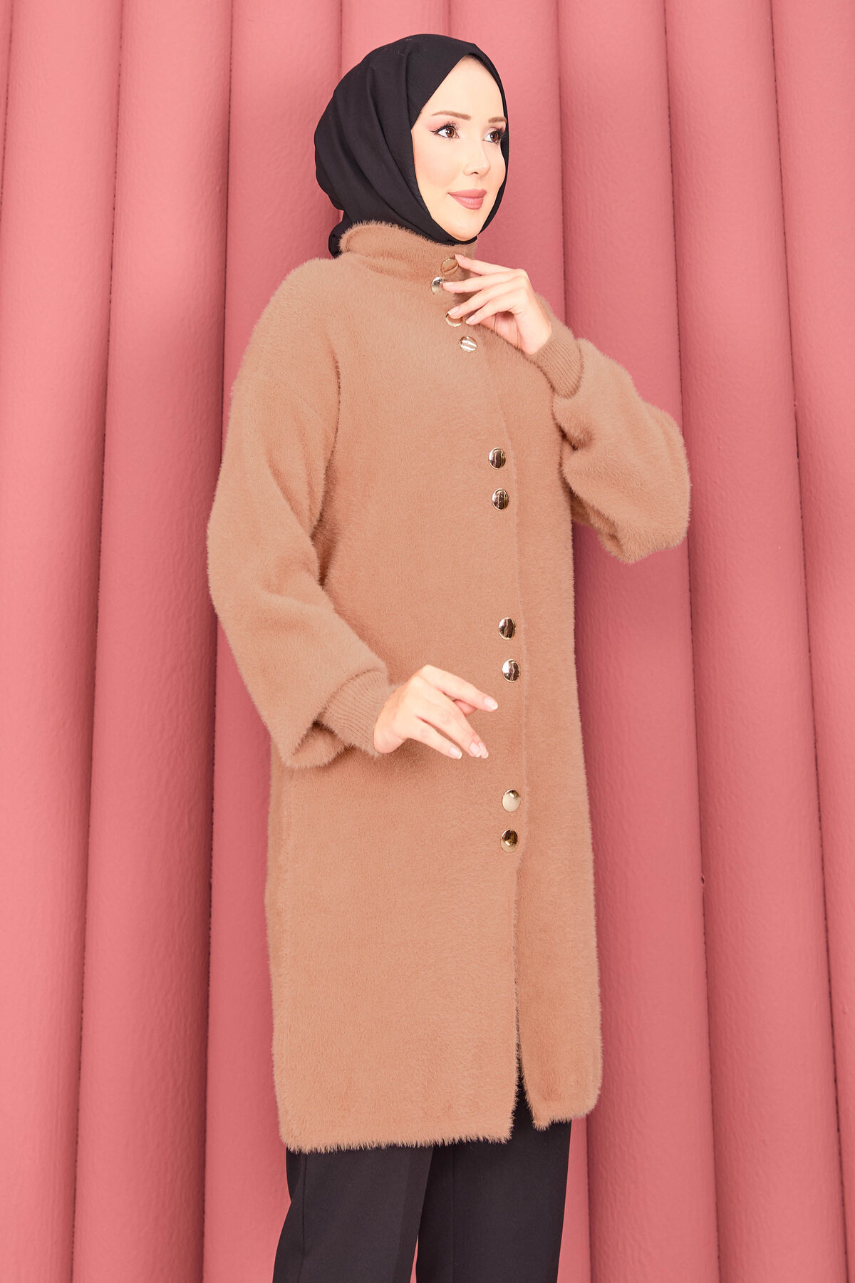 Altın Düğmeli Tesettür Angora Hırka Camel