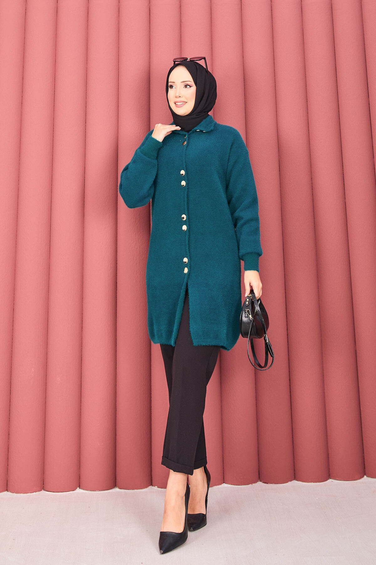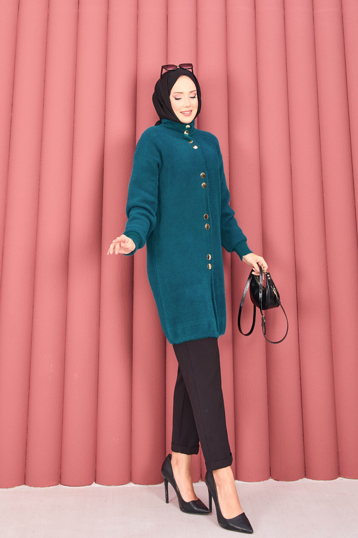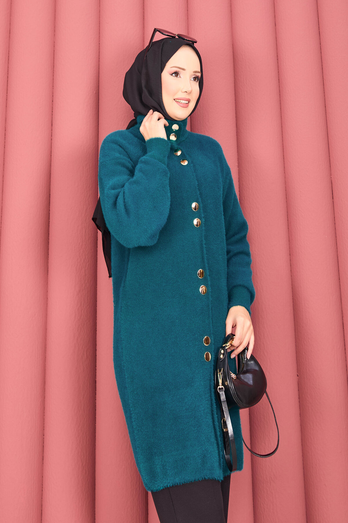 Altın Düğmeli Tesettür Angora Hırka Petrol