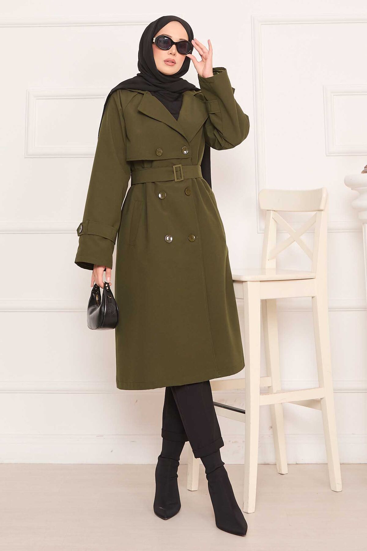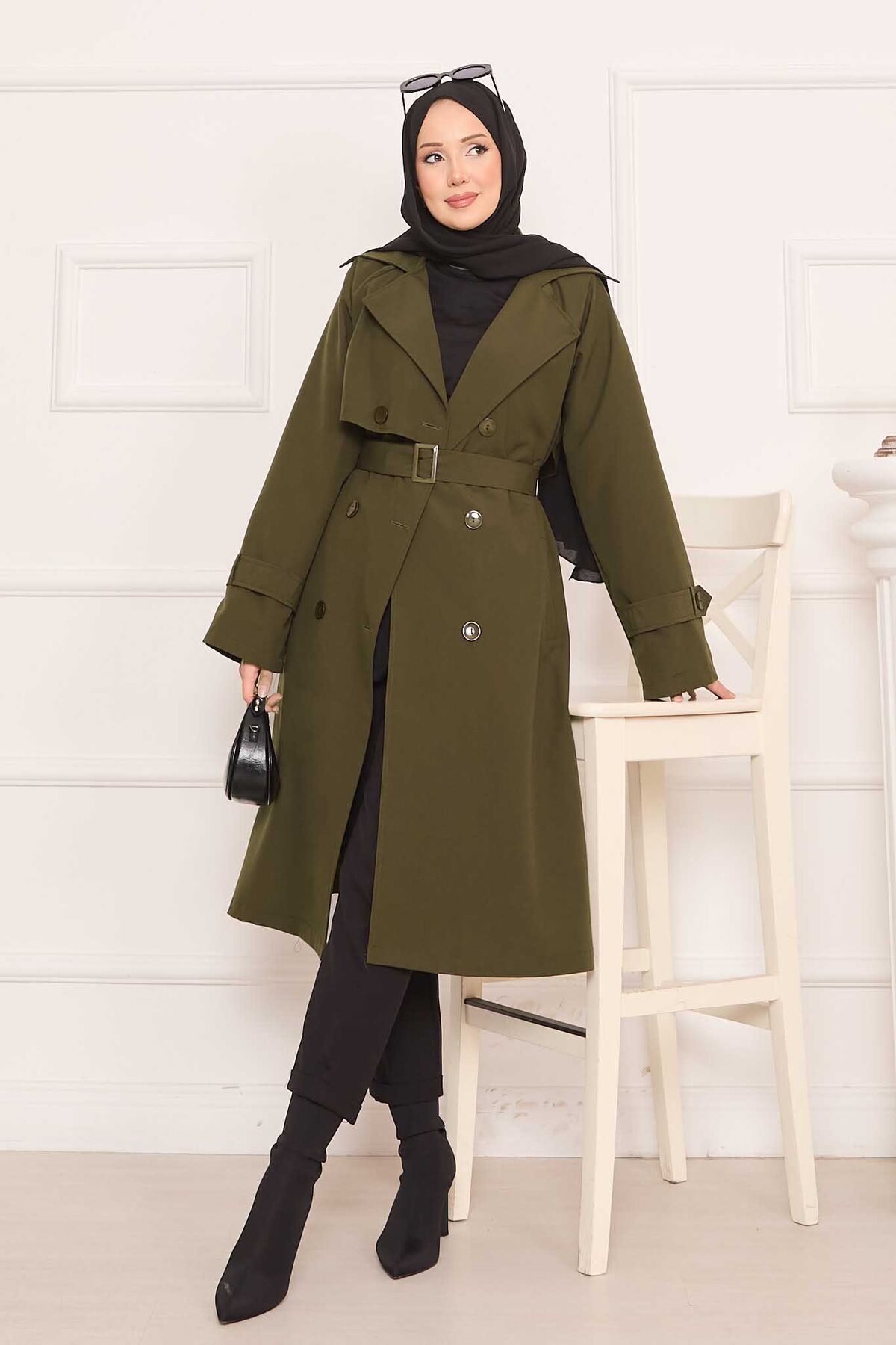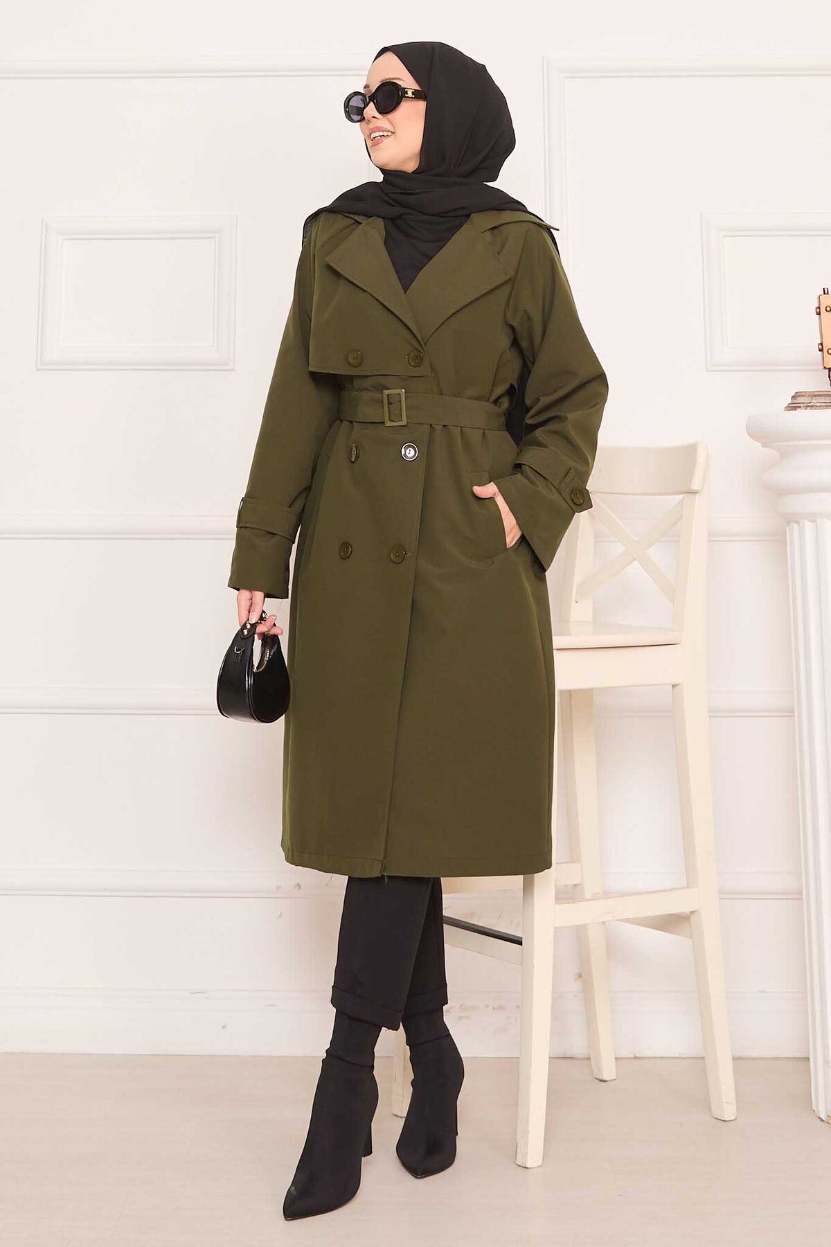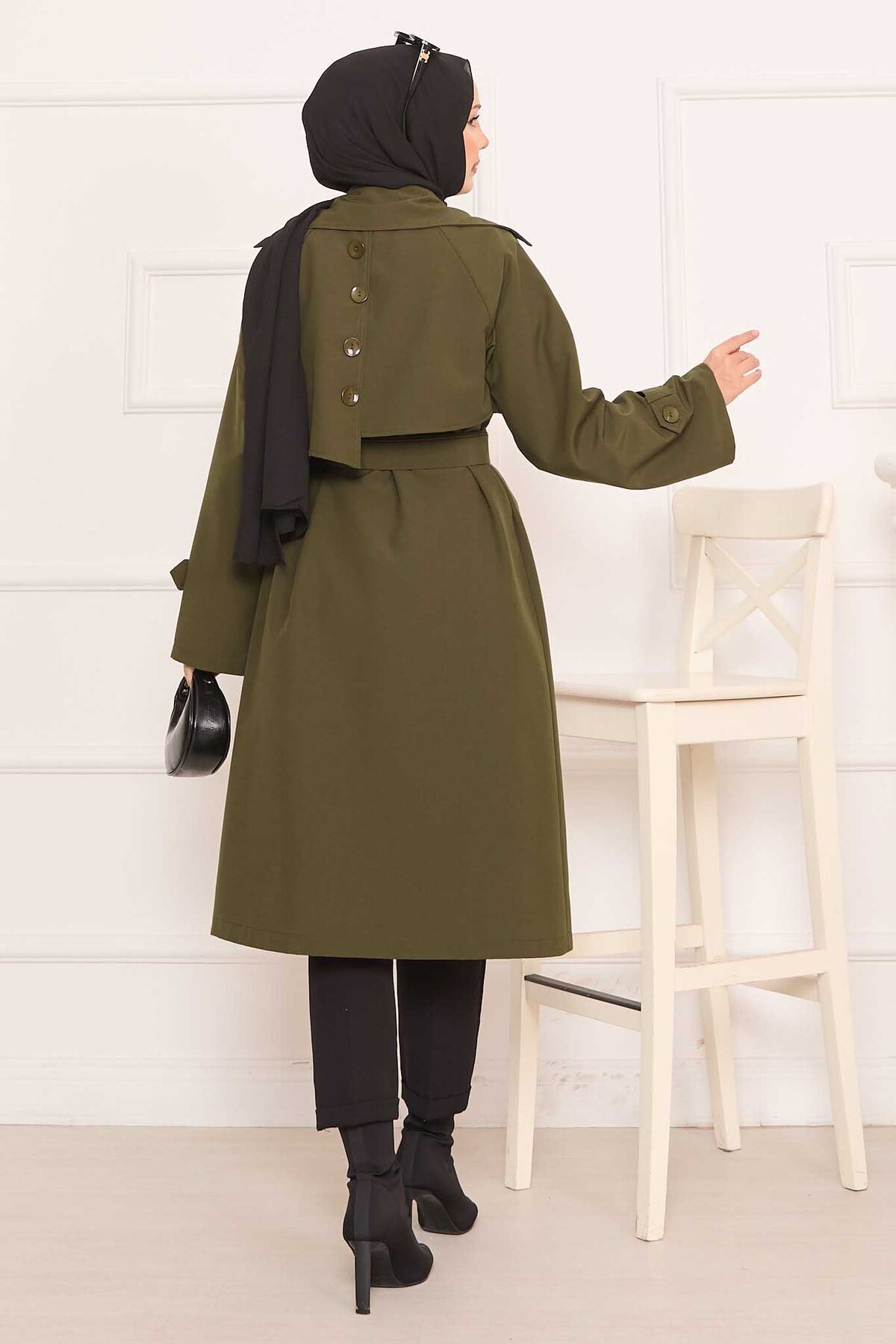 Arkası Düğme Detaylı Seyyar Kuşaklı Tesettür Trençkot Haki
