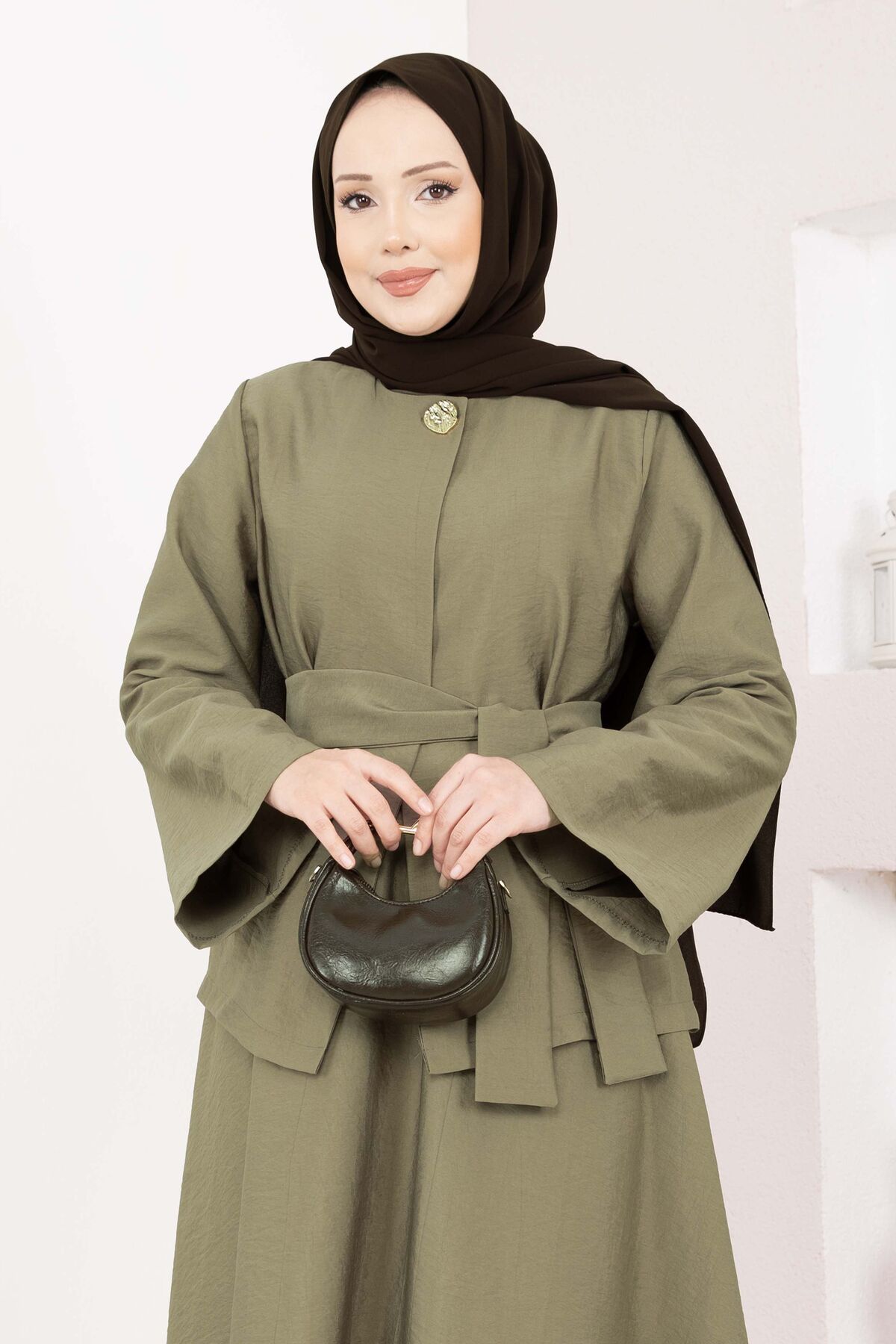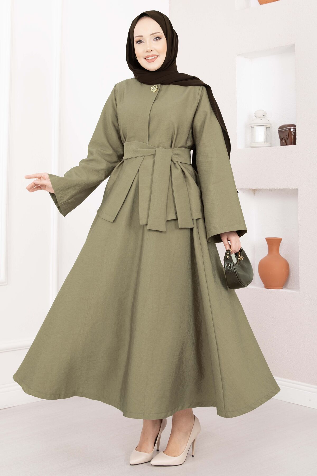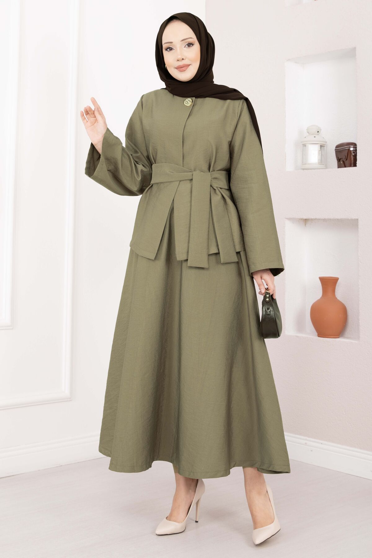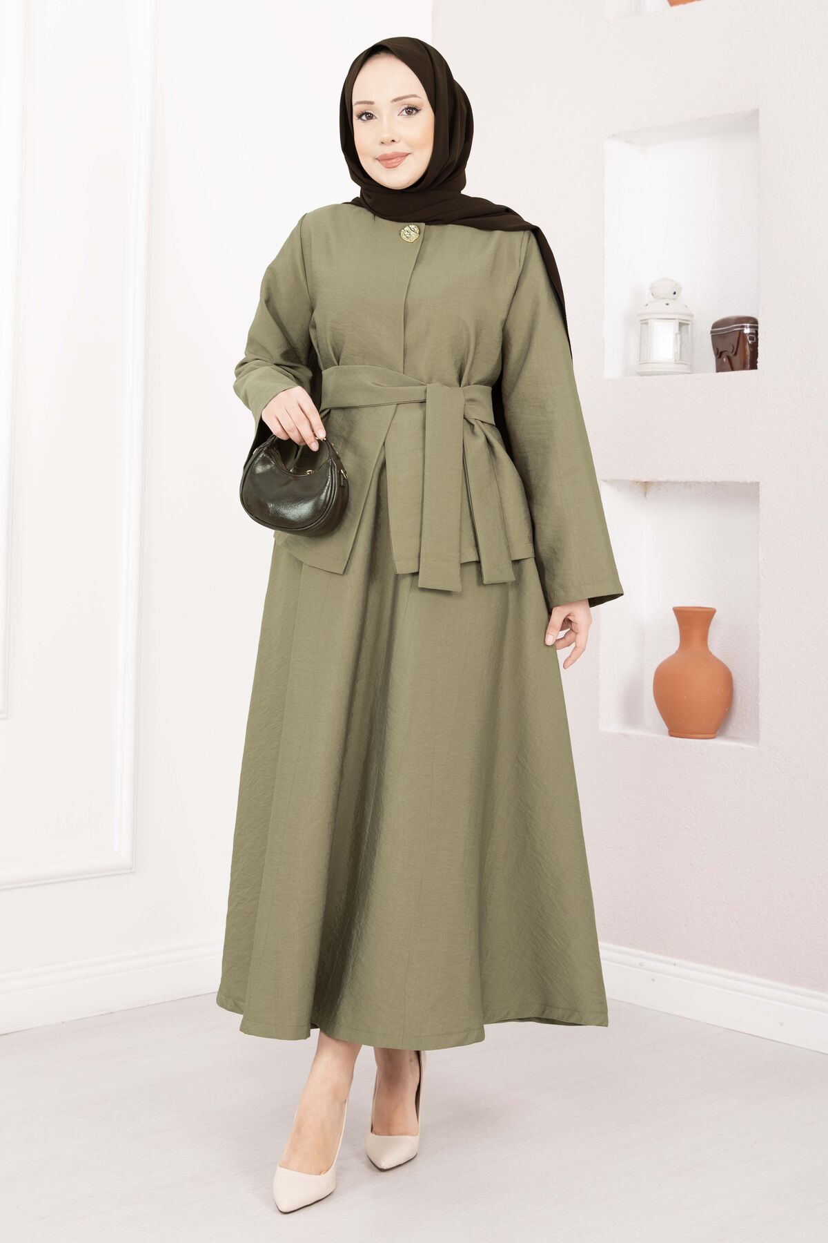Asimetrik Gold Düğmeli Kemerli Etek & Ceket Takım Haki