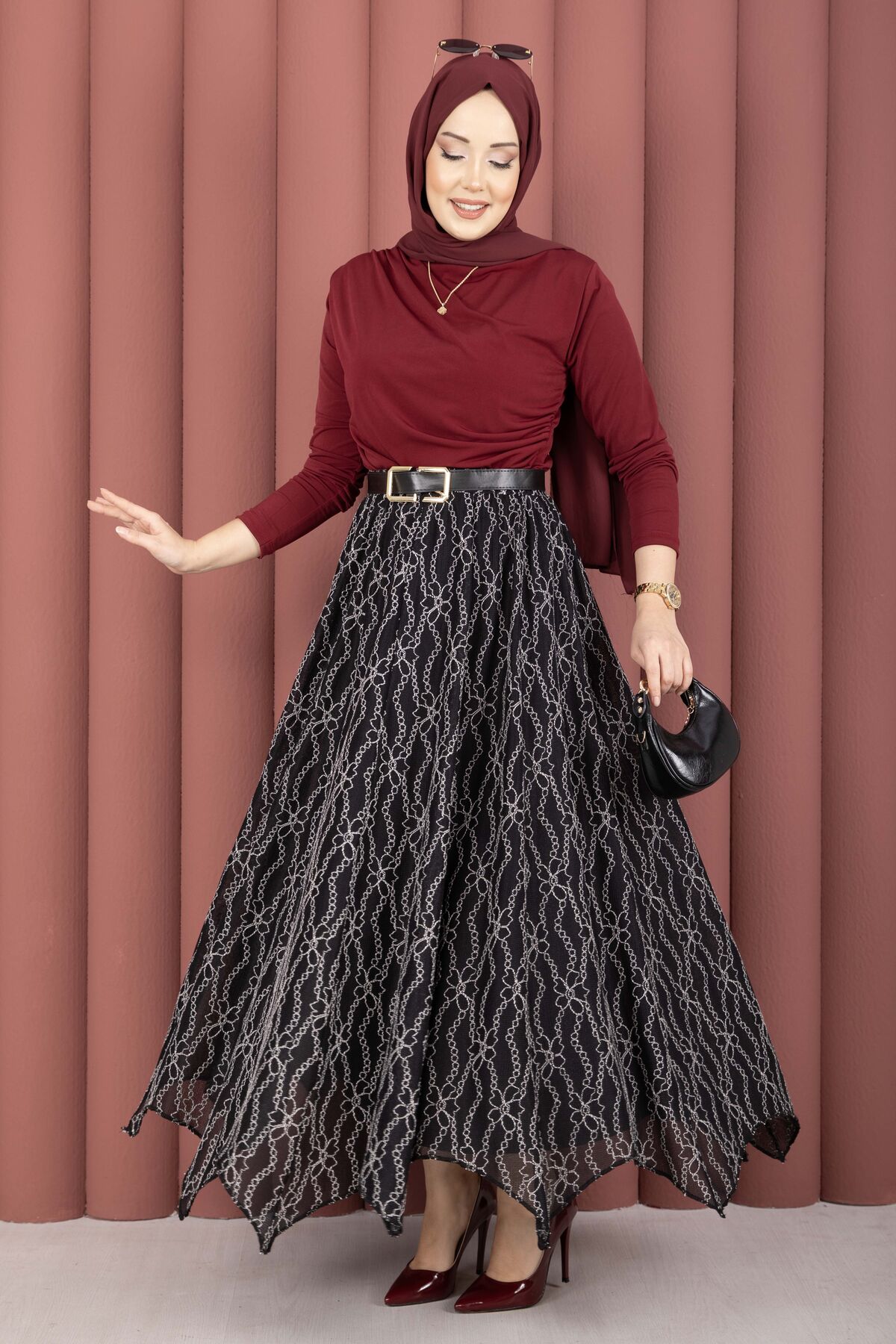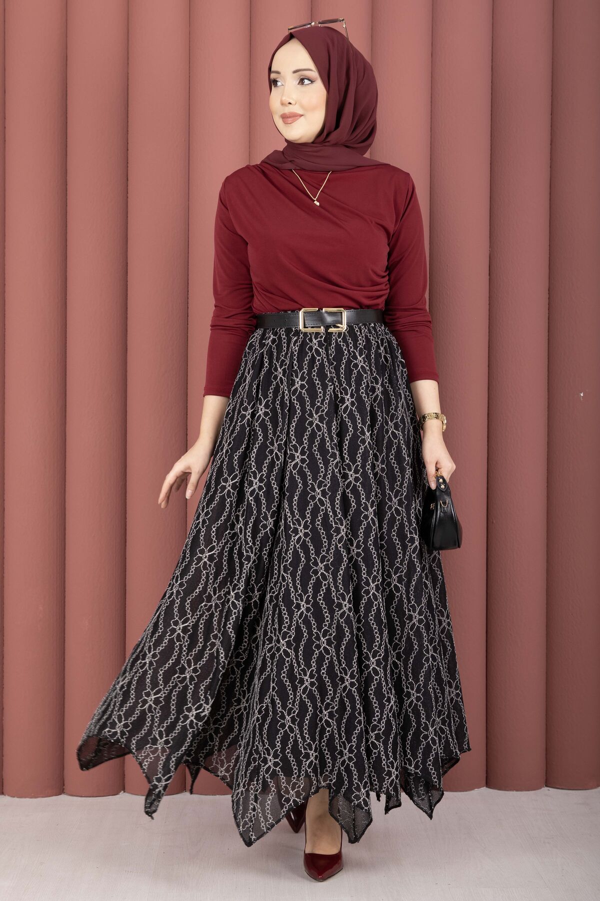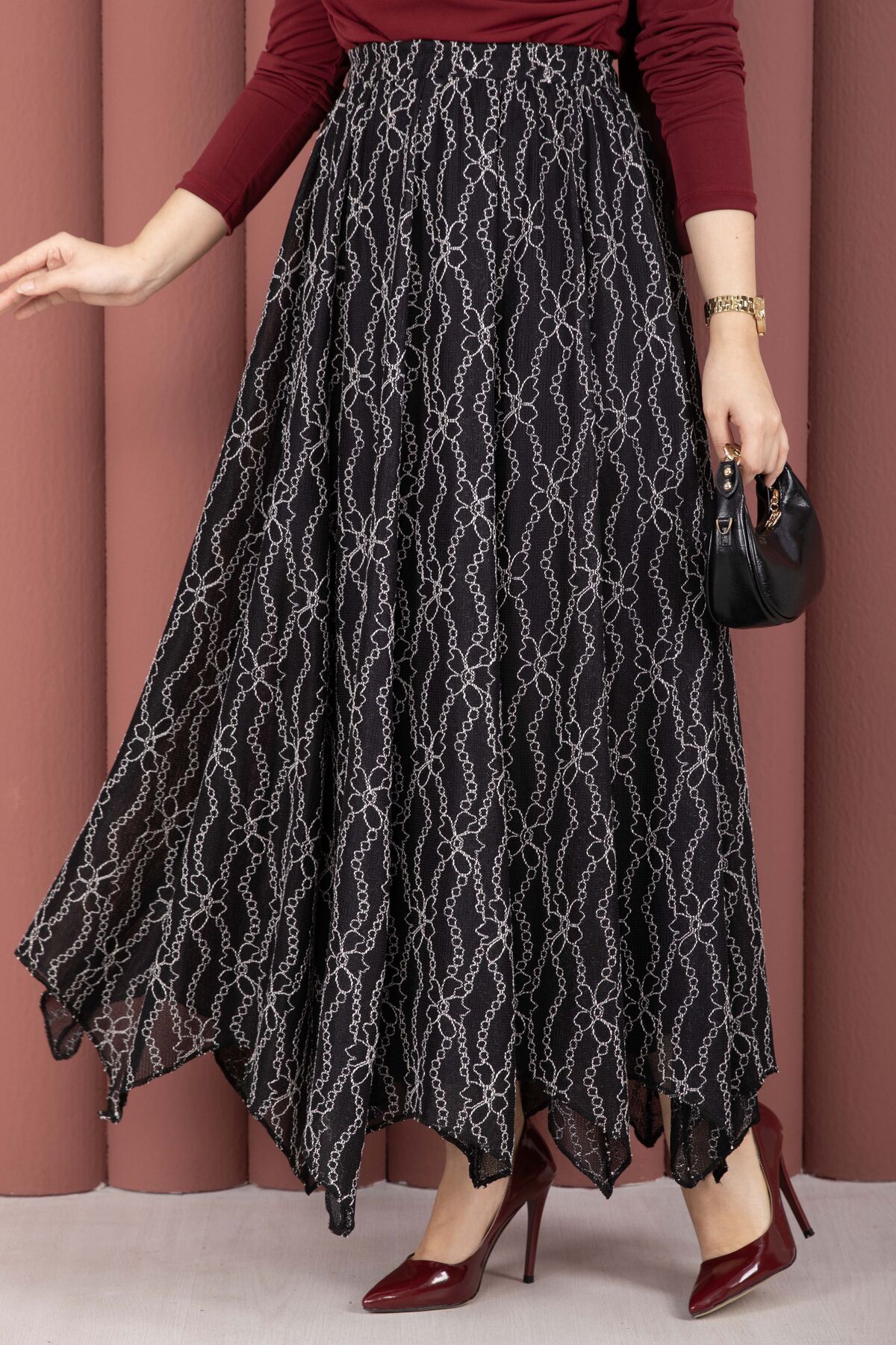 Asimetrik Kesim Dantel Desenli Etek Siyah
