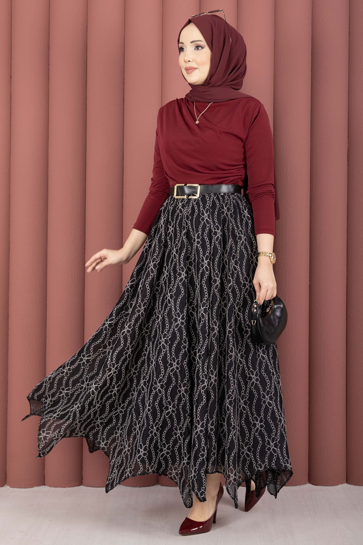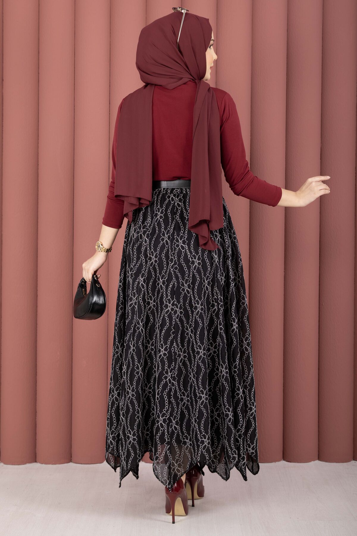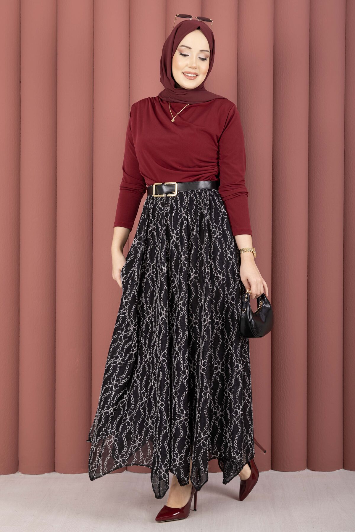 Asimetrik Kesim Dantel Desenli Etek Siyah
