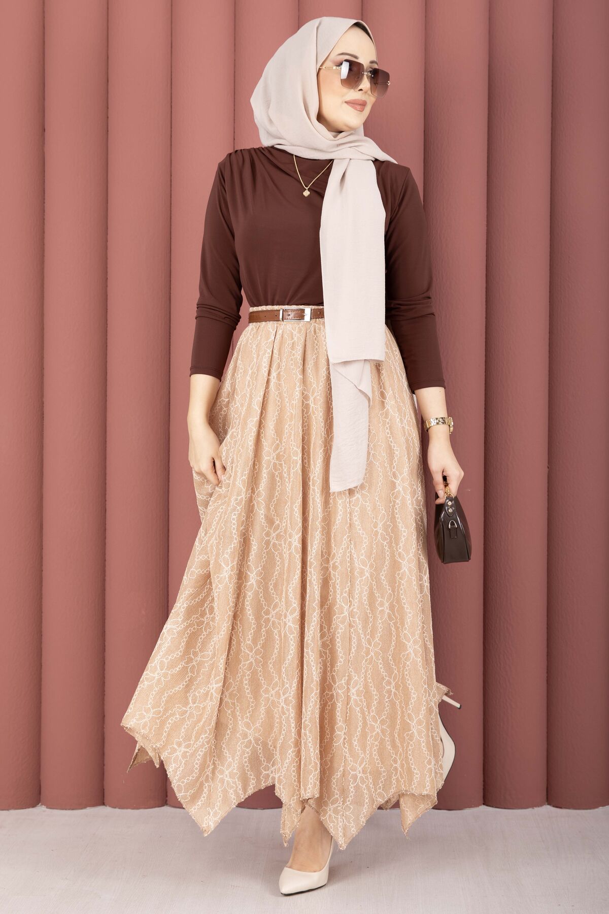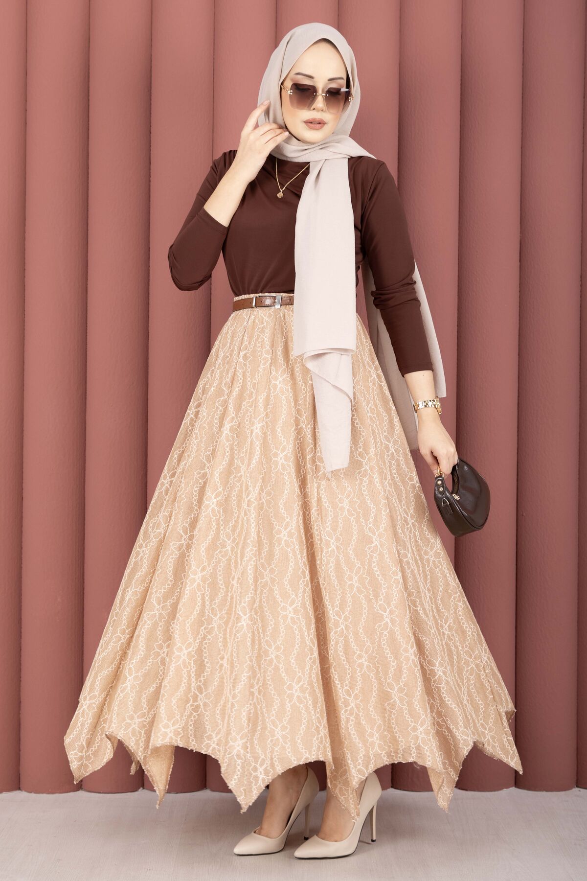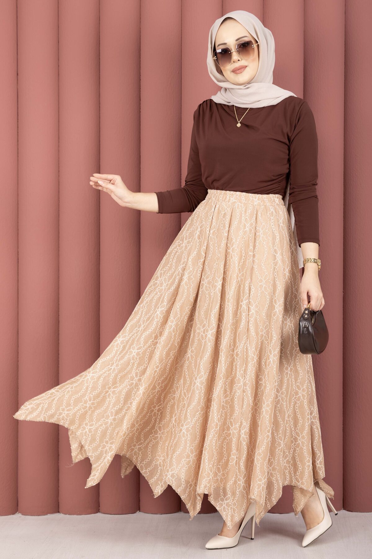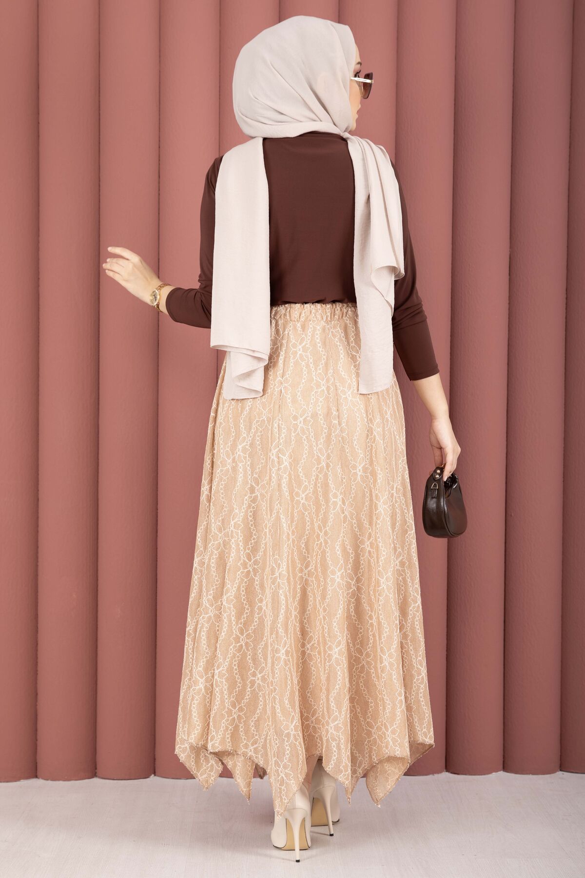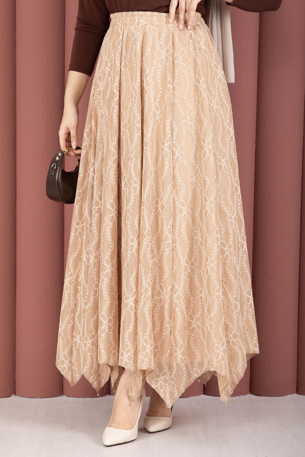 Asimetrik Kesim Dantel Desenli Etek Vizon