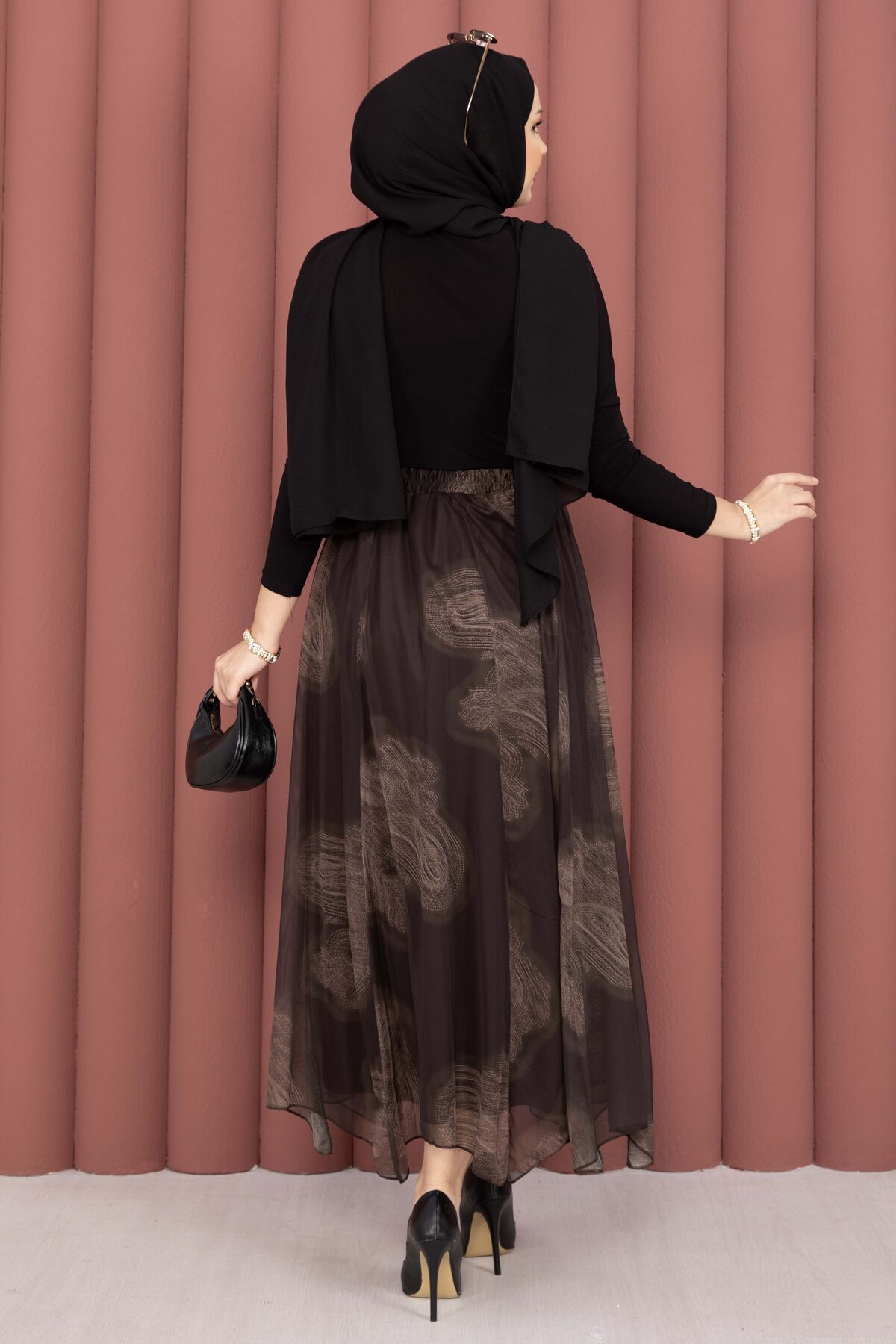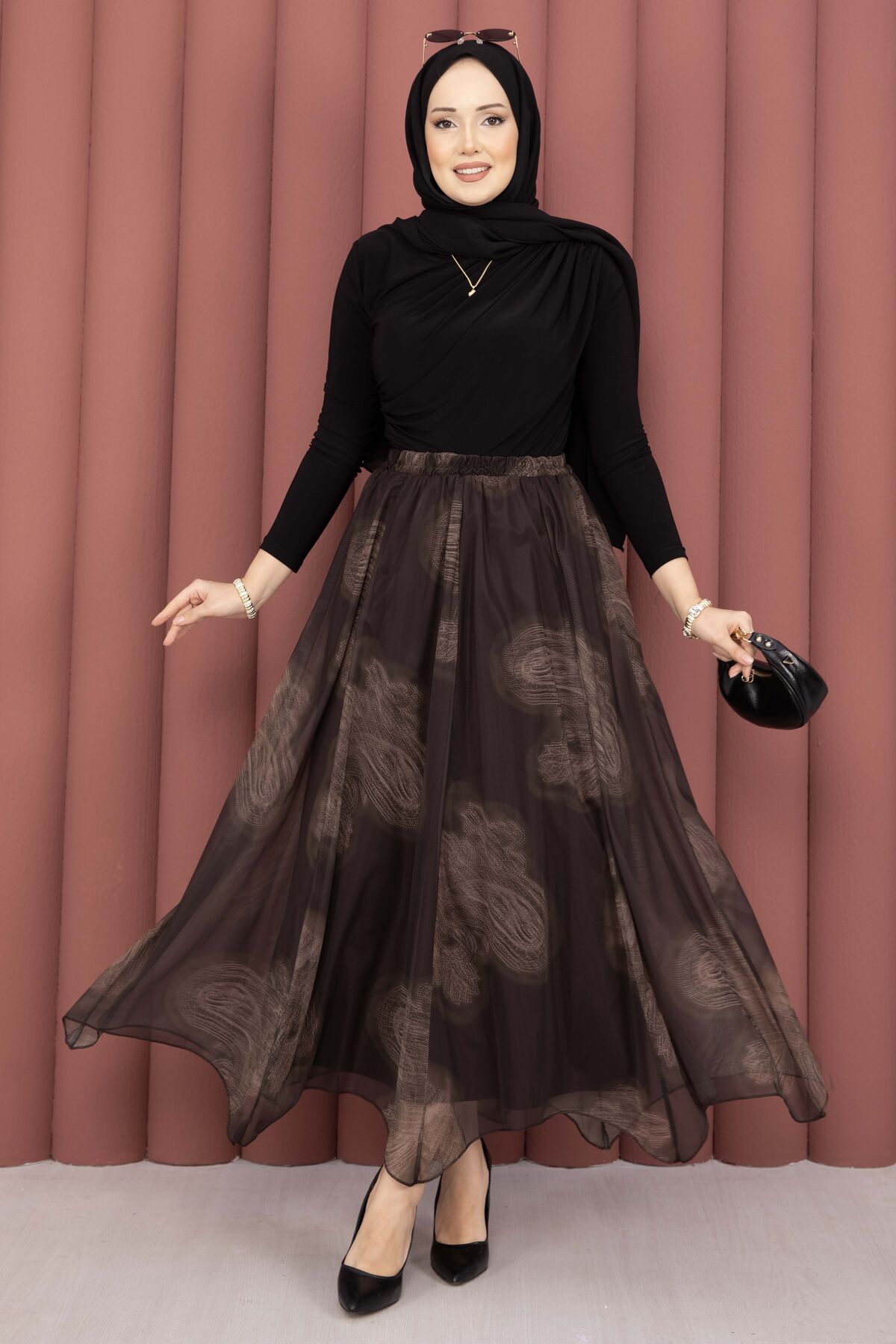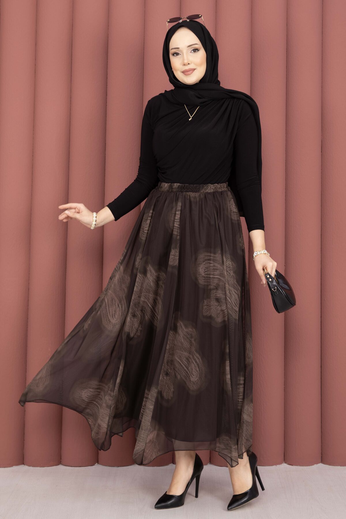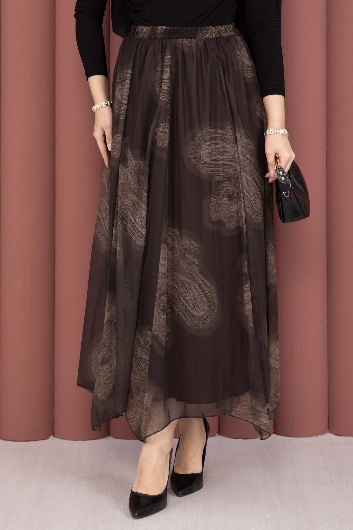 Asimetrik Kesim Desenli Tül Etek Kahve