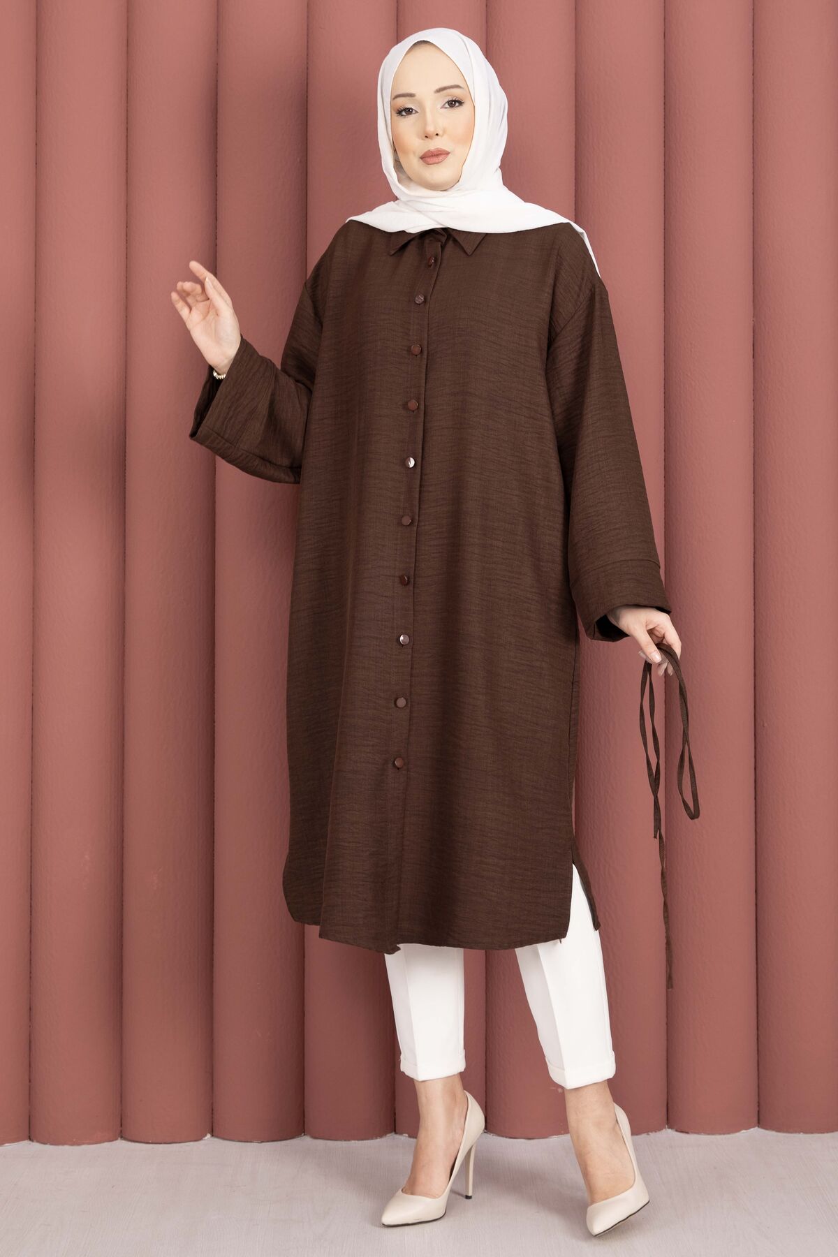 Bağcıklı Boydan Düğmeli Tunik Gömlek