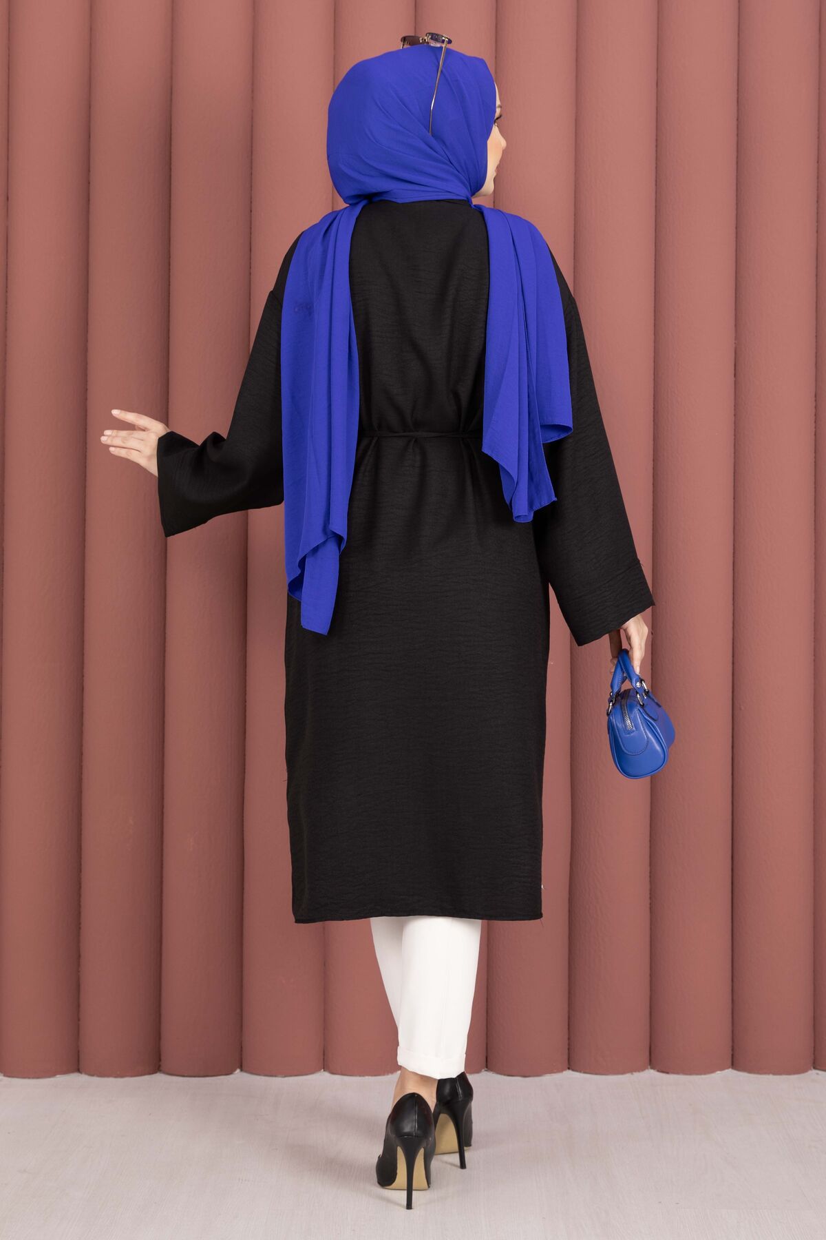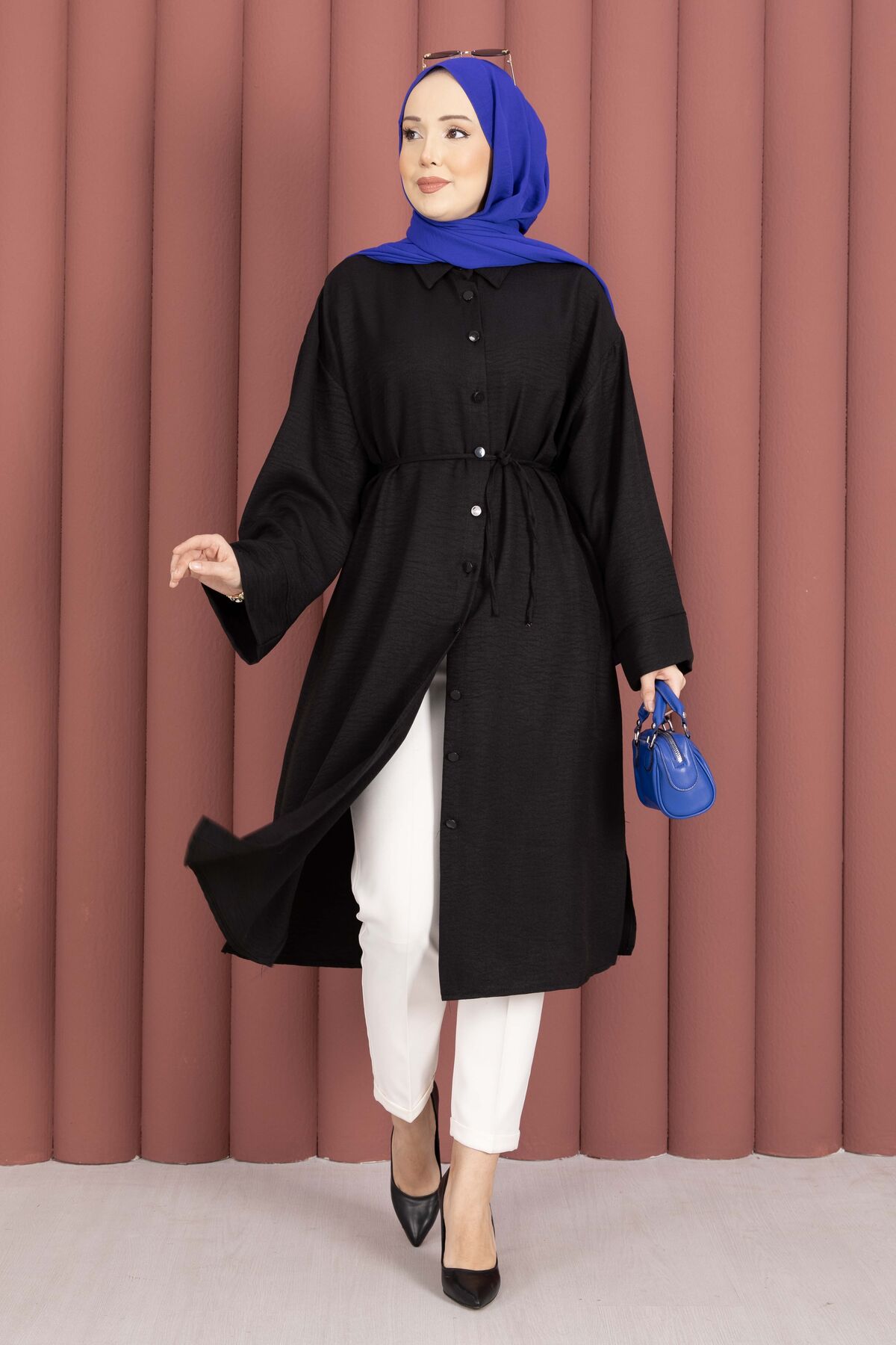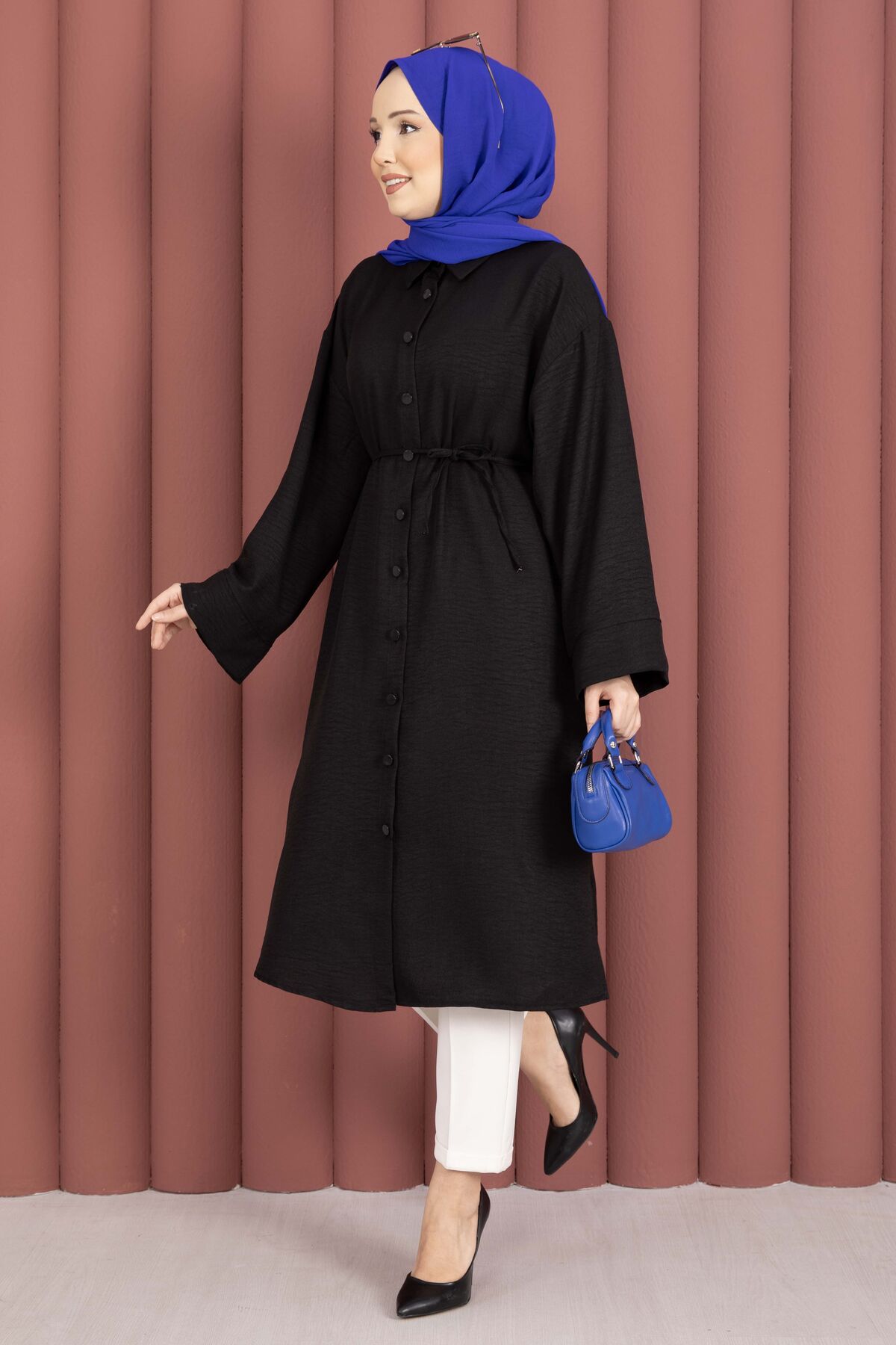 Bağcıklı Boydan Düğmeli Tunik Gömlek Siyah