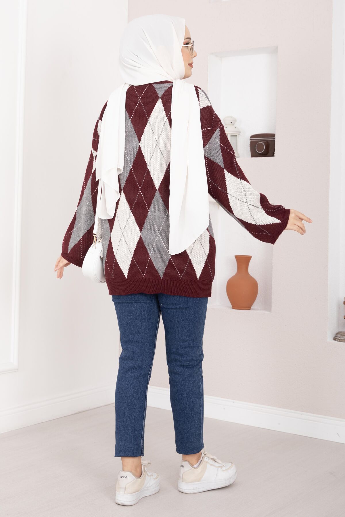 Baklava Desen Oversize Triko Kazak Bordo