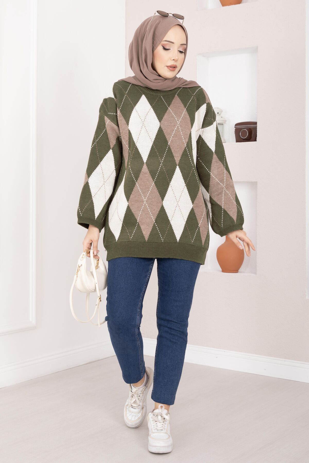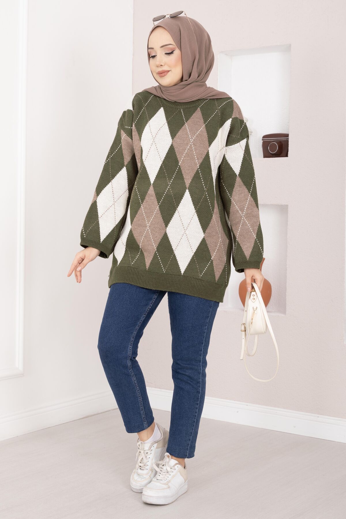 Baklava Desen Oversize Triko Kazak Haki