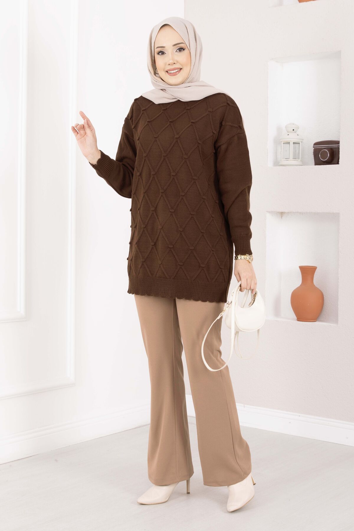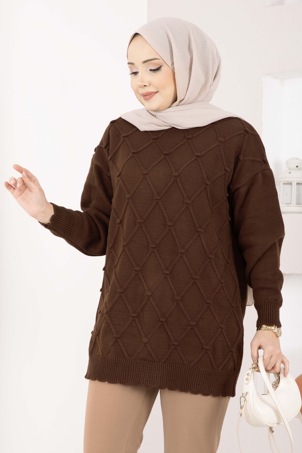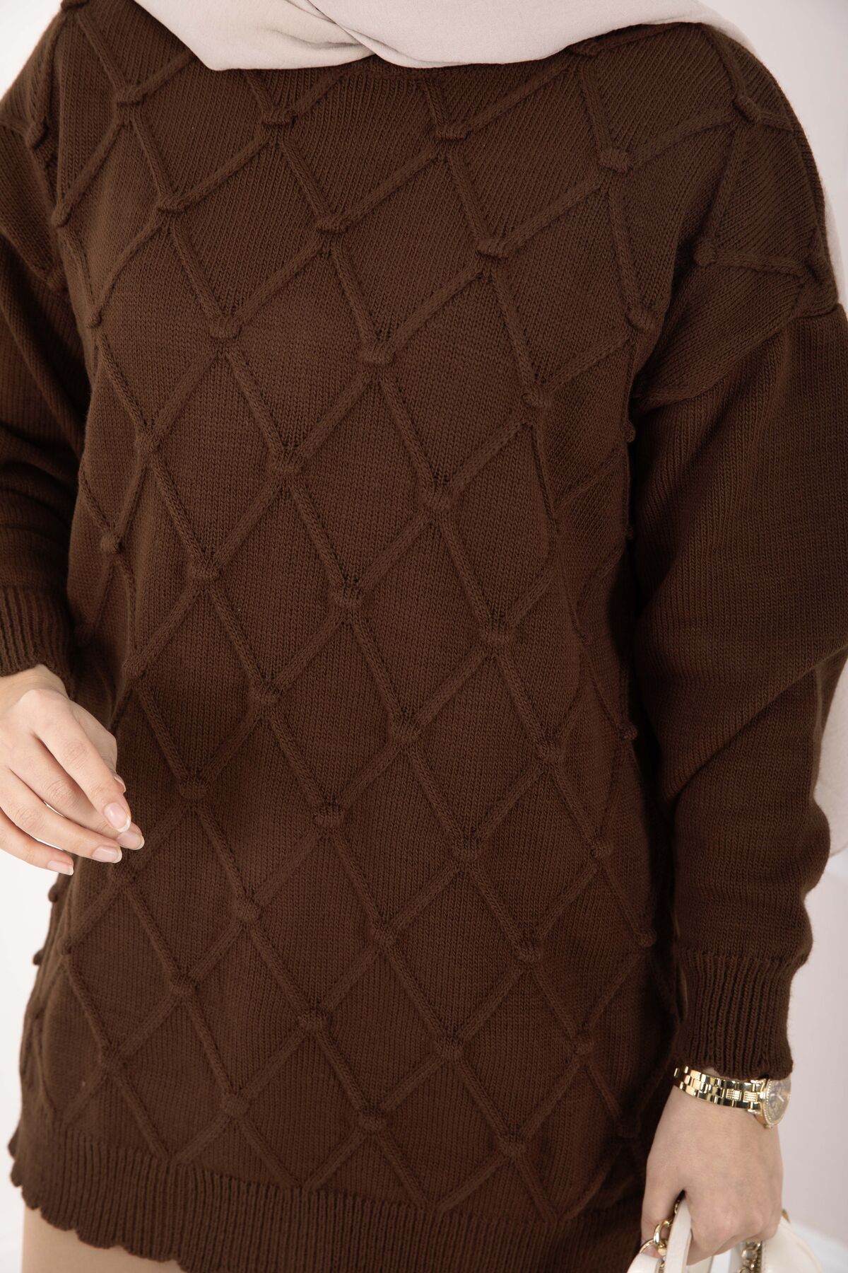 Baklava Desen Ponpon Detaylı Triko Kazak Kahve