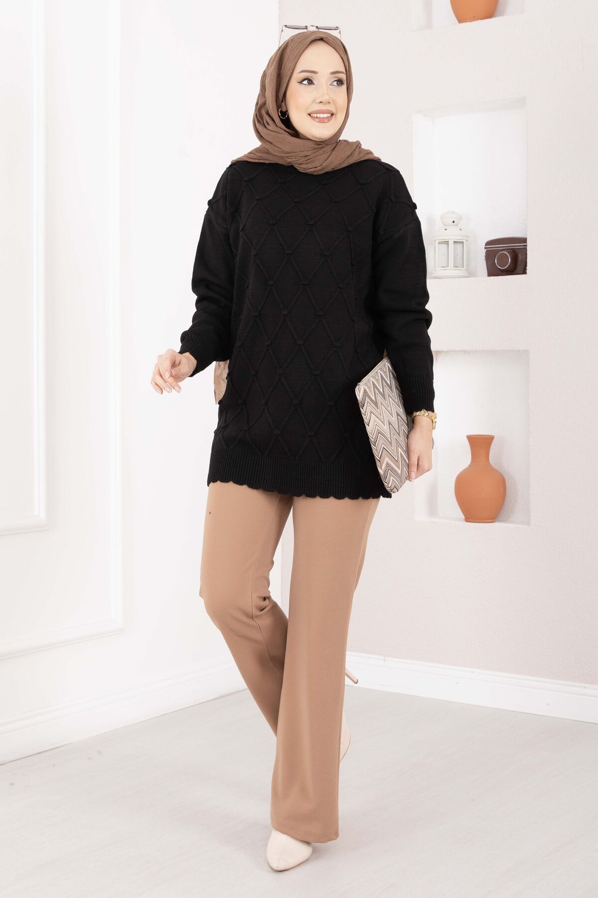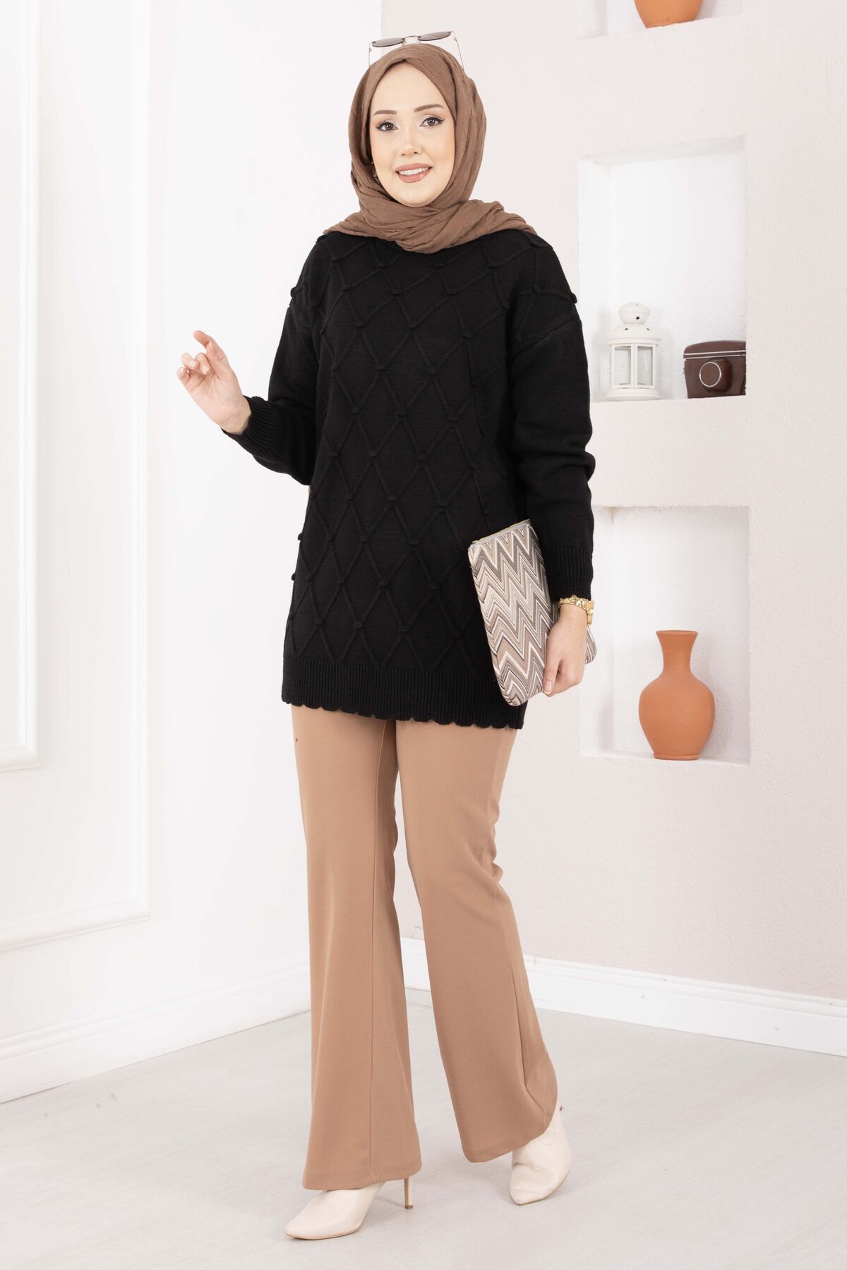 Modern ve şık tasarımıyla öne çıkan Baklava Desen Ponpon Detaylı Triko Kazak, baklava deseni ve ponpon detaylarıyla kombinlerinize hareketli ve zarif bir hava katar. Yumuşak dokulu triko yapısı sayesinde gün boyu konfor sunar. Günlük şıklıktan ofis kombinlerine kadar pek çok farklı tarzla rahatlıkla uyum sağlar.