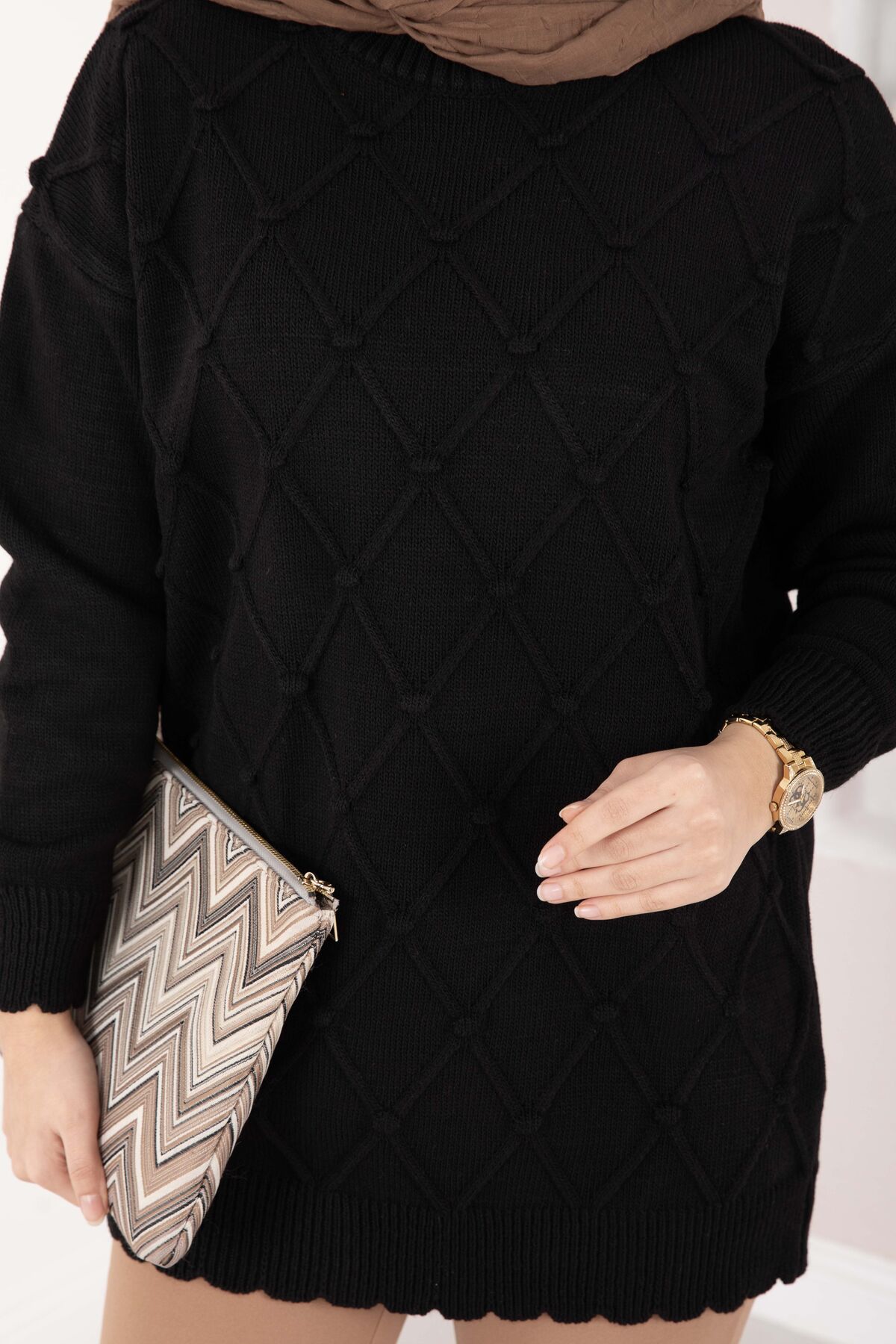 Baklava Desen Ponpon Detaylı Triko Kazak Siyah