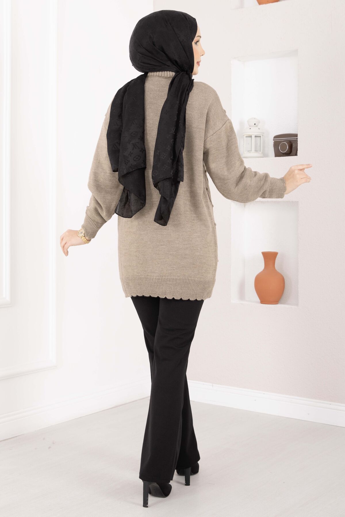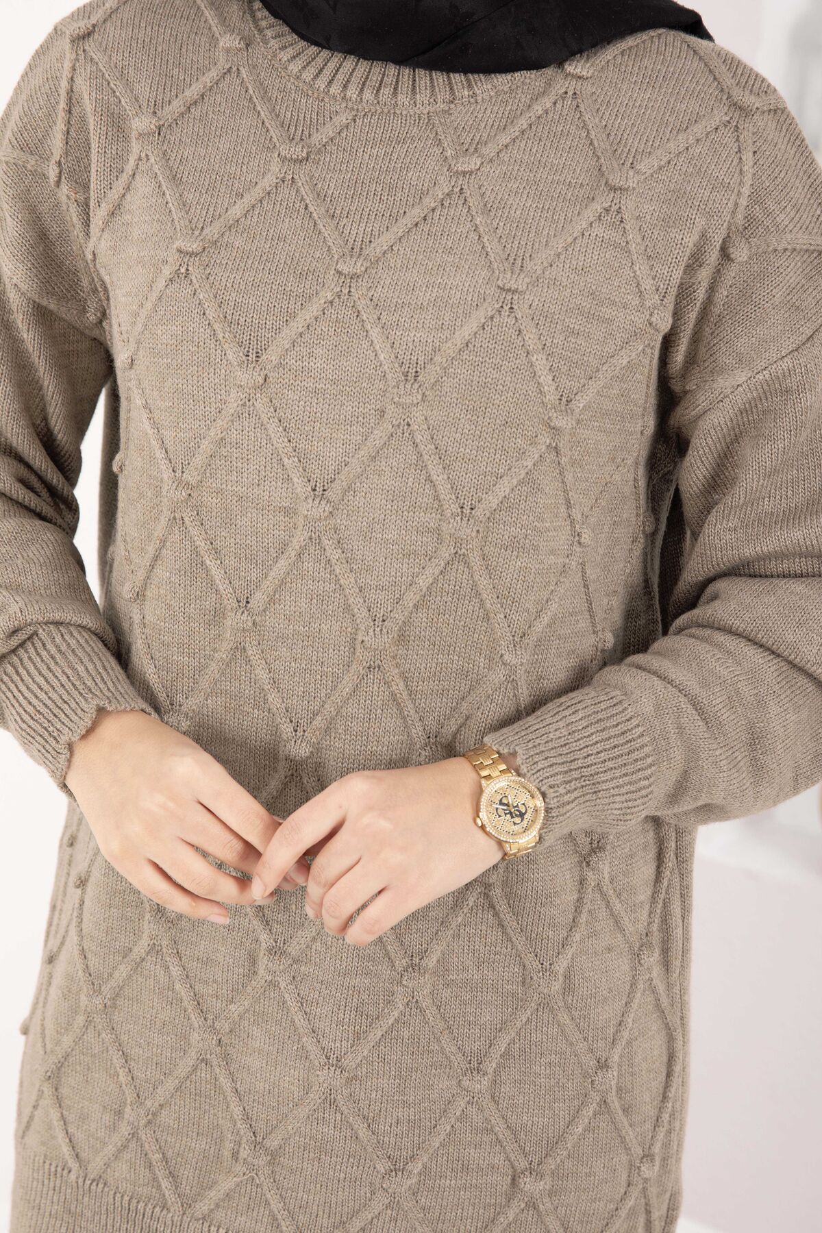 Baklava Desen Ponpon Detaylı Triko Kazak Vizon