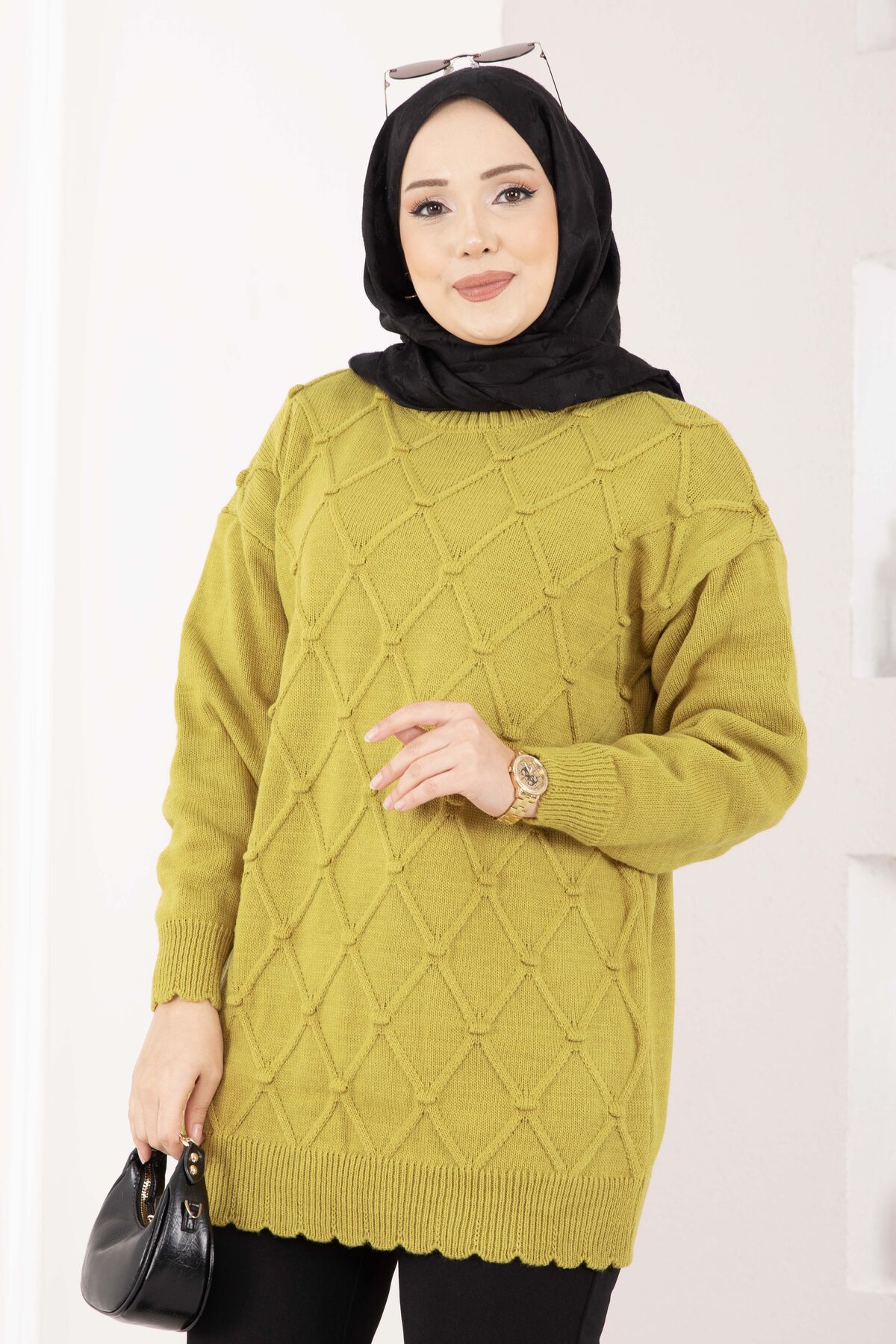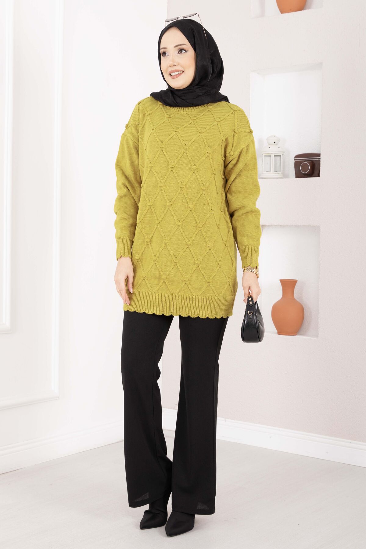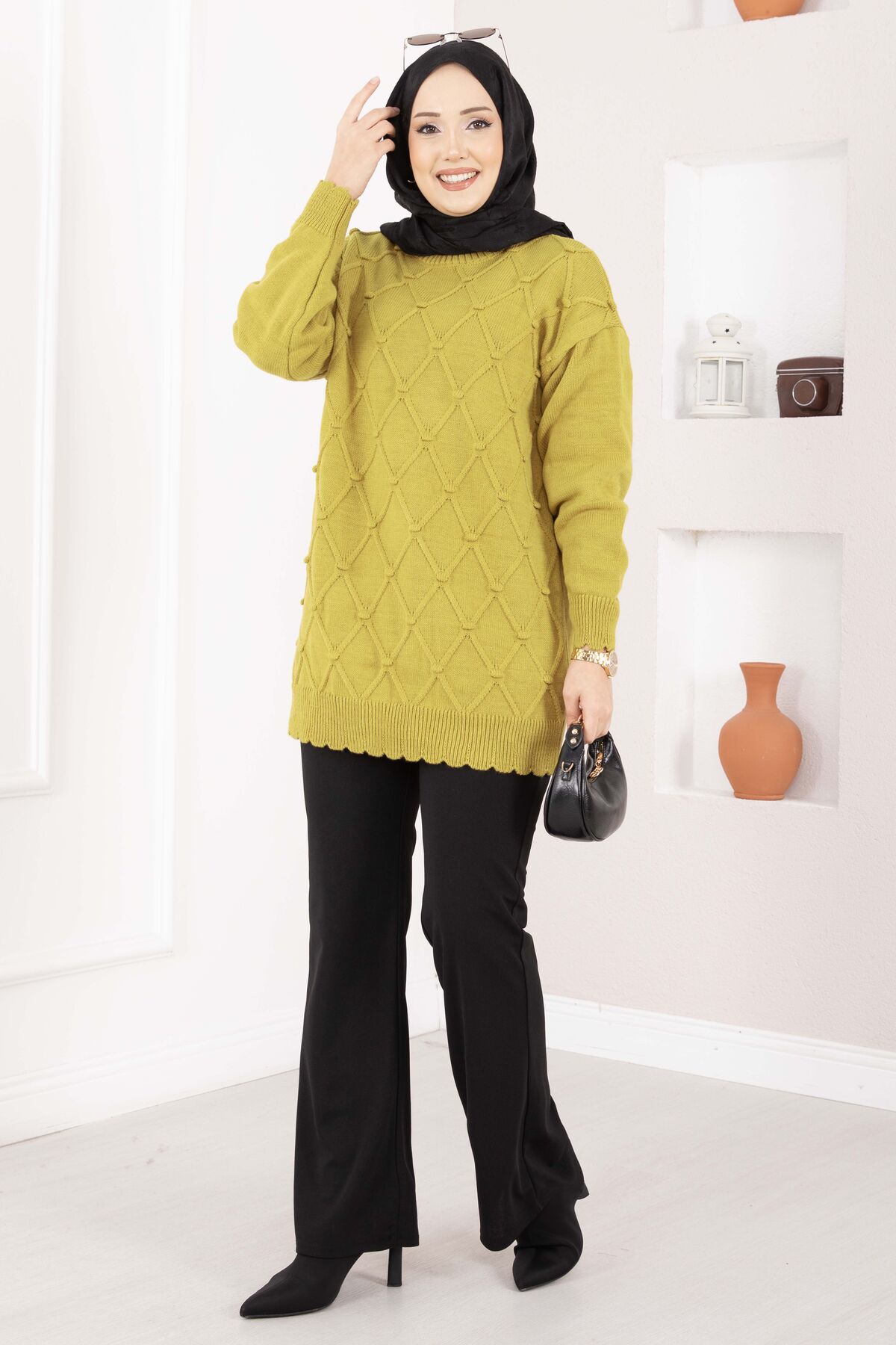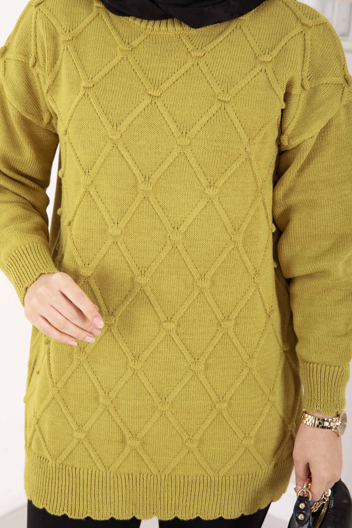 Baklava Desen Ponpon Detaylı Triko Kazak Yağ Yeşil