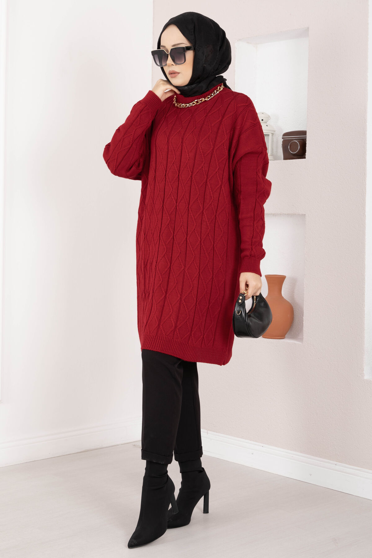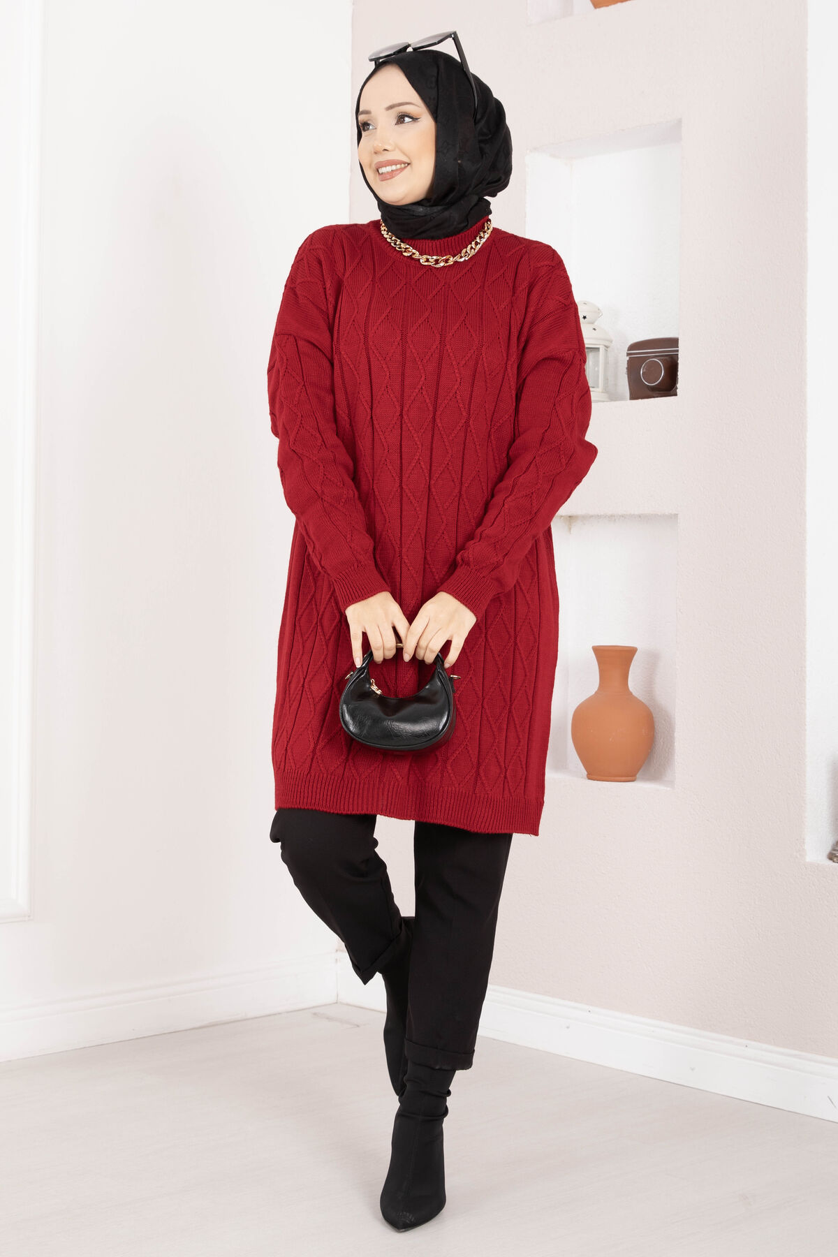 Baklava Örgü Triko Tunik Kırmızı