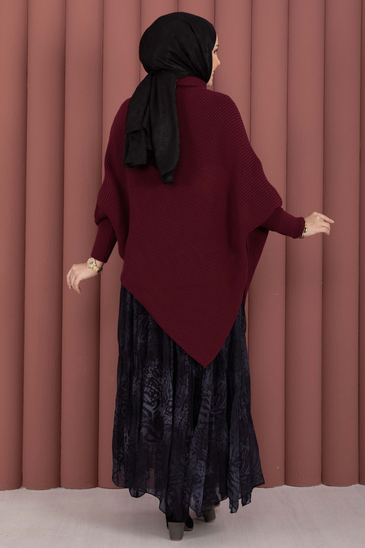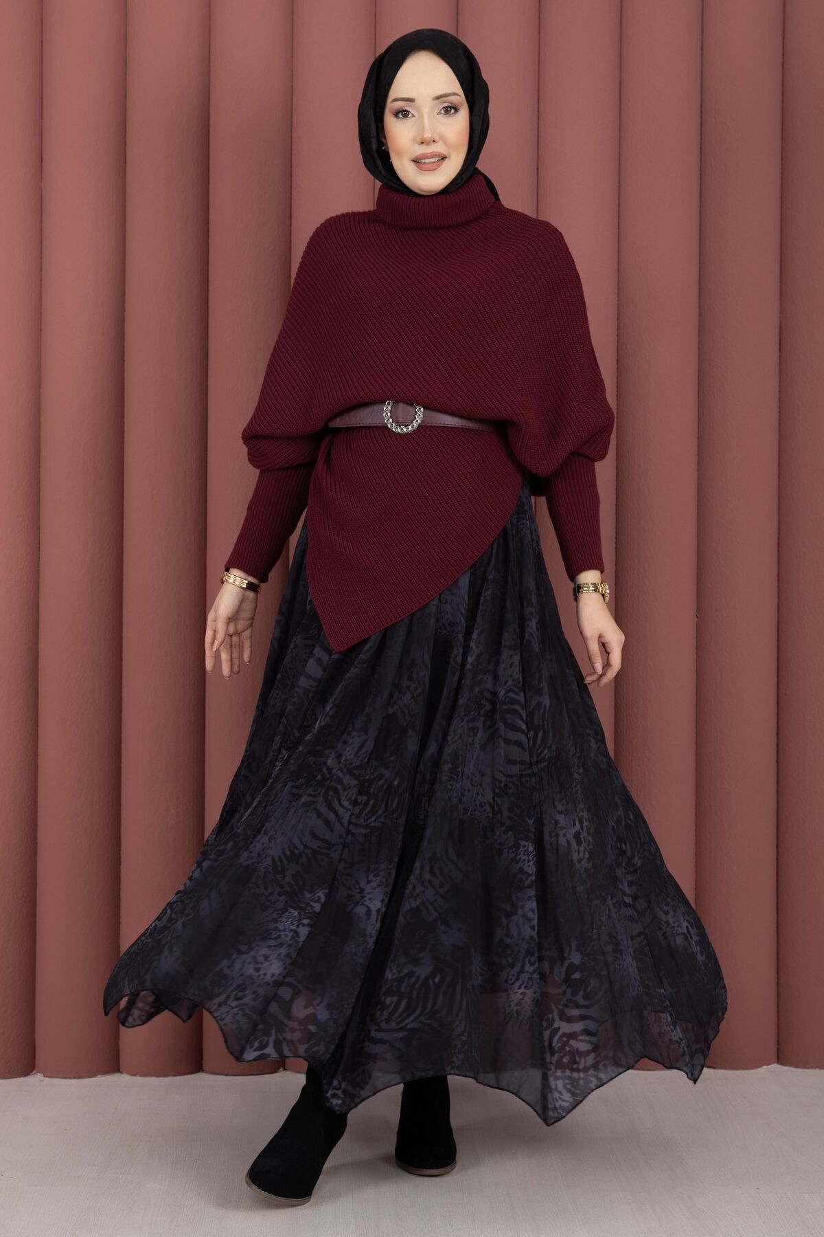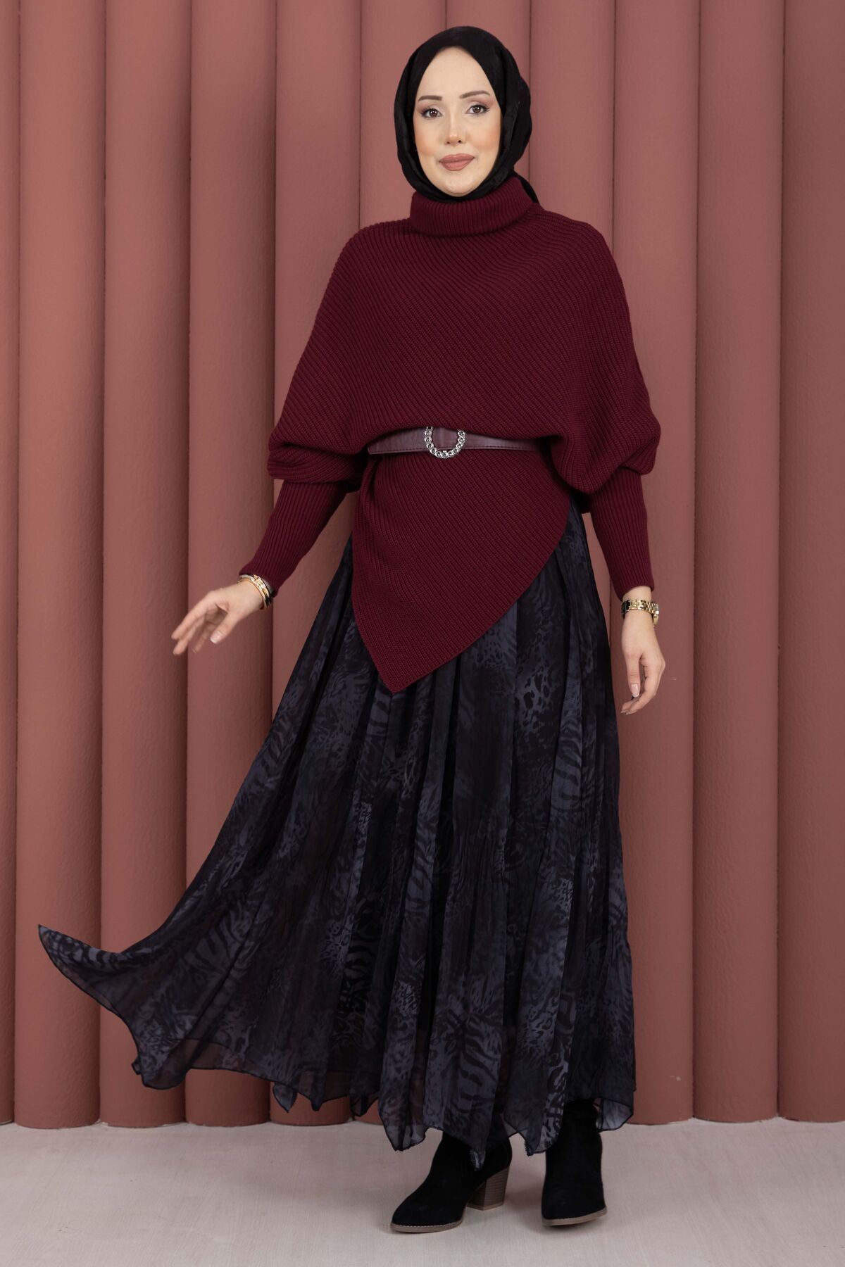 Balıkçı Yaka Asimetrik Triko Kazak Bordo