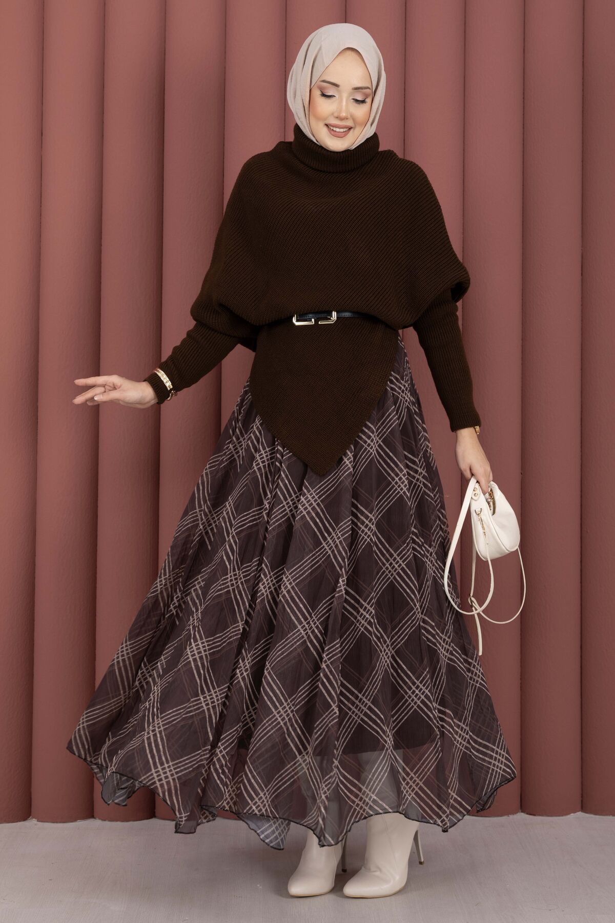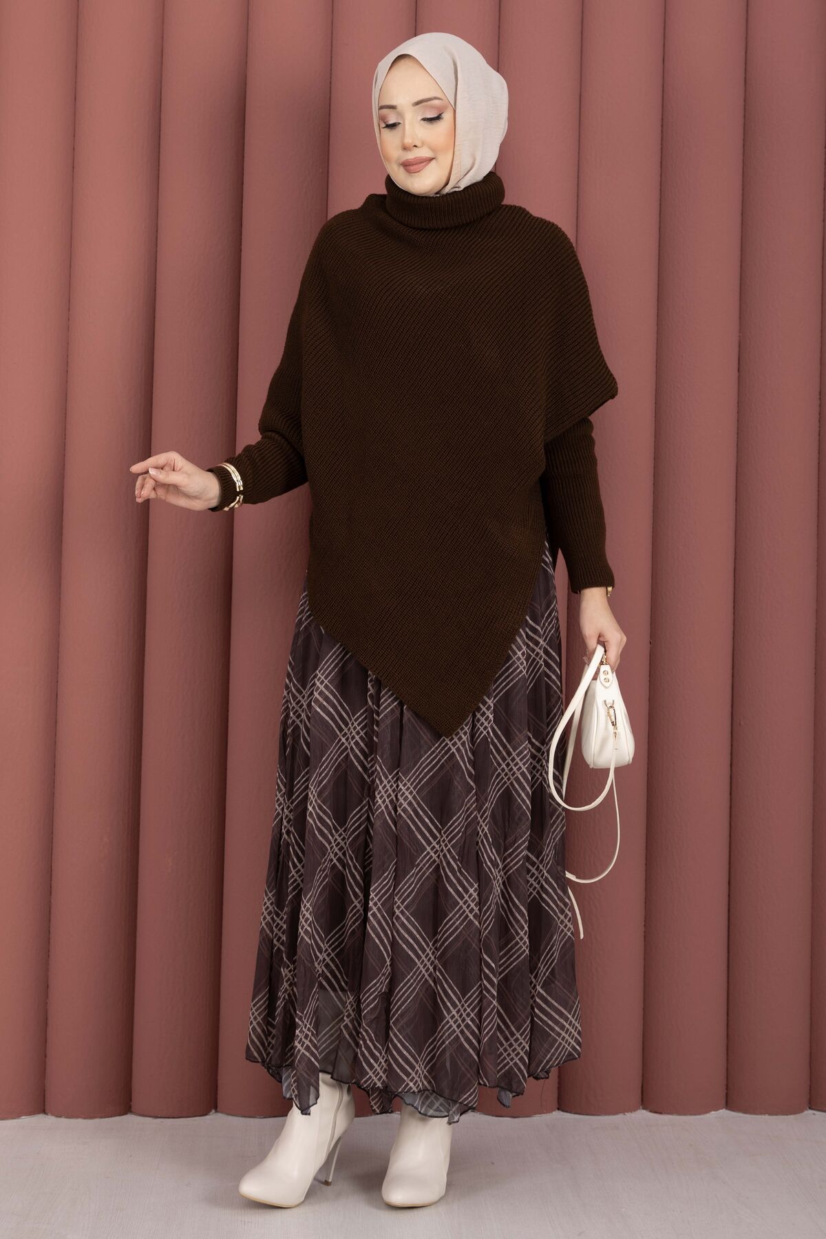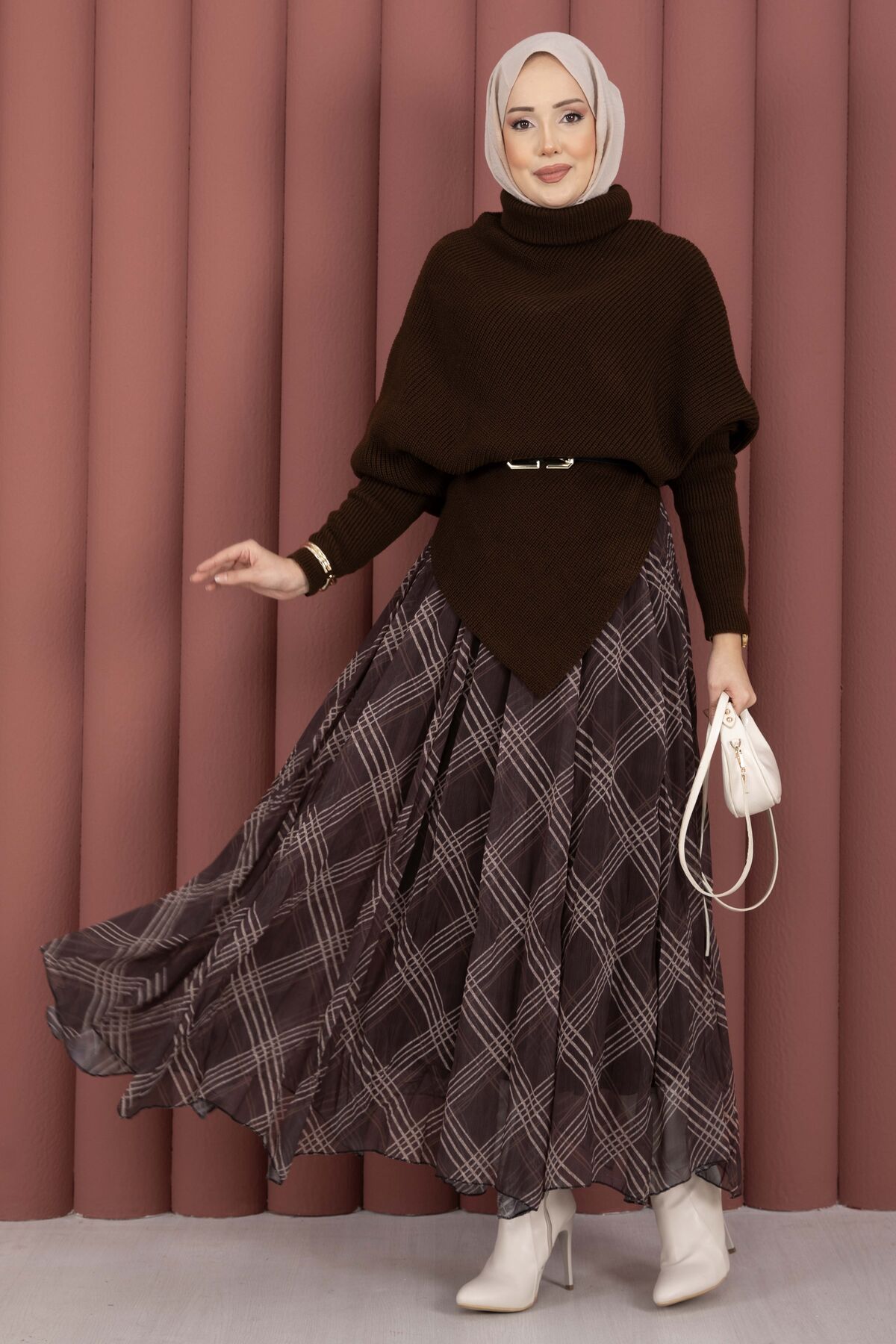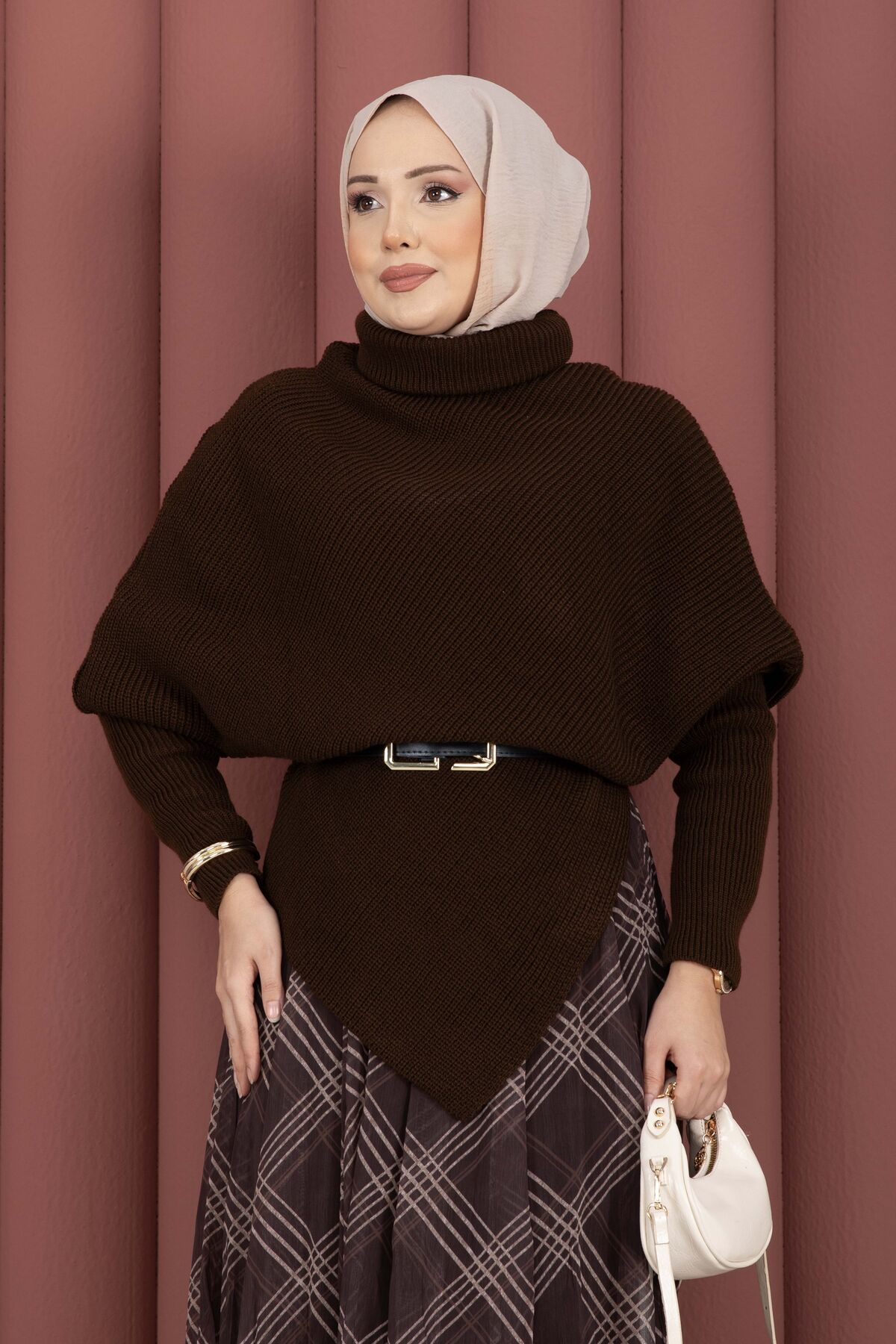 Balıkçı Yaka Asimetrik Triko Kazak Kahve