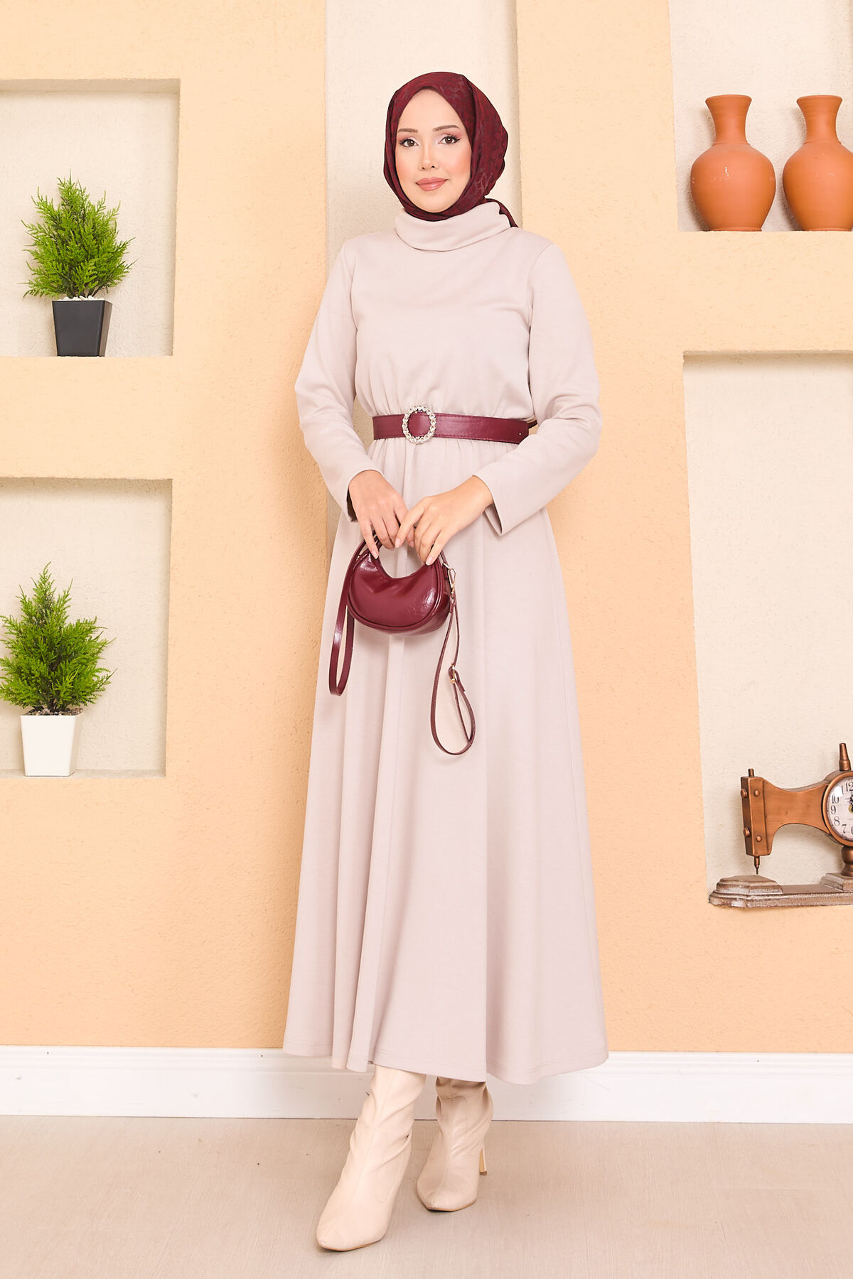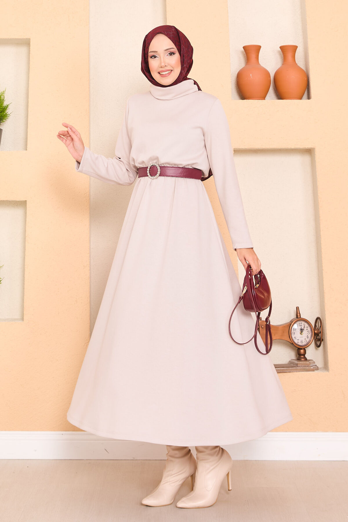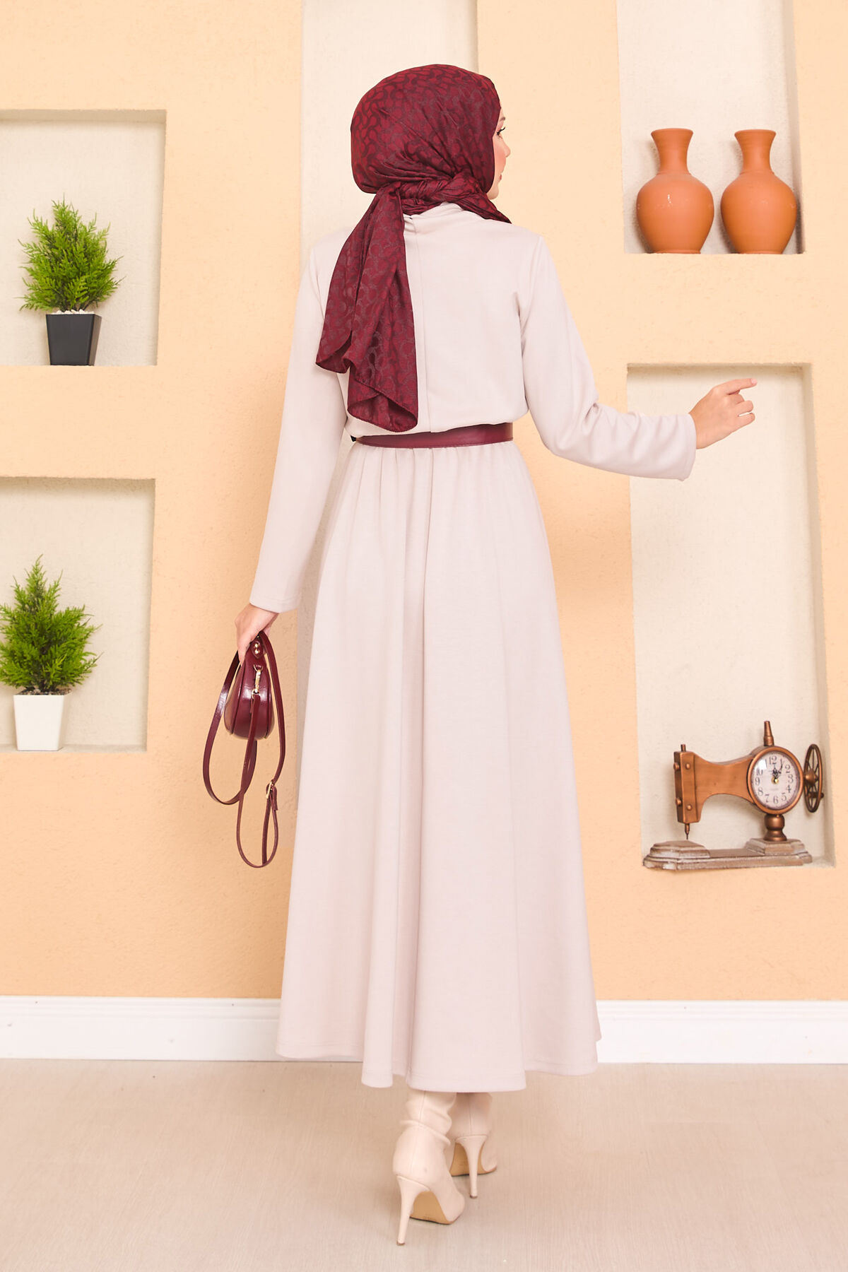 Balıkçı Yaka Beli Büzgülü Tesettür Elbise Bej