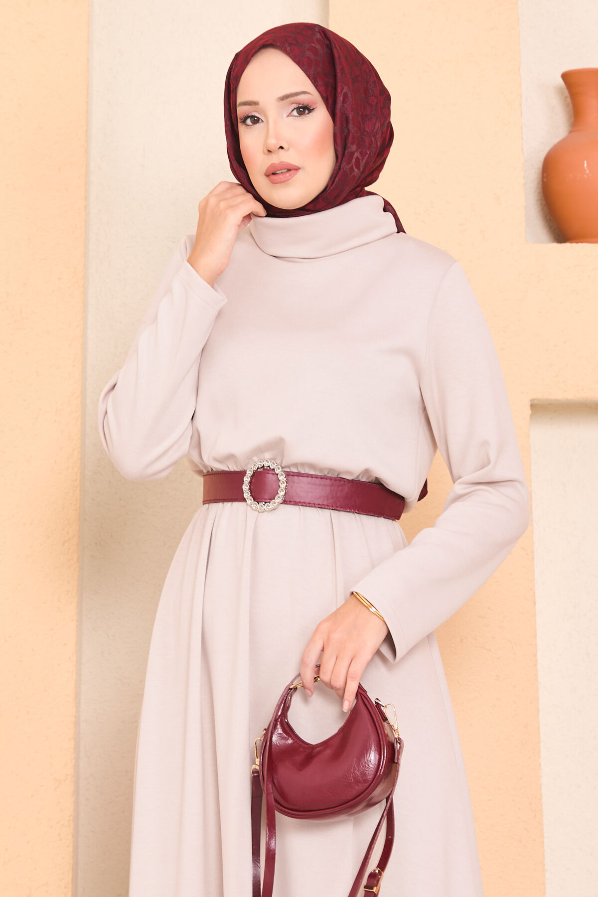Balıkçı Yaka Beli Büzgülü Tesettür Elbise Bej Yorumları