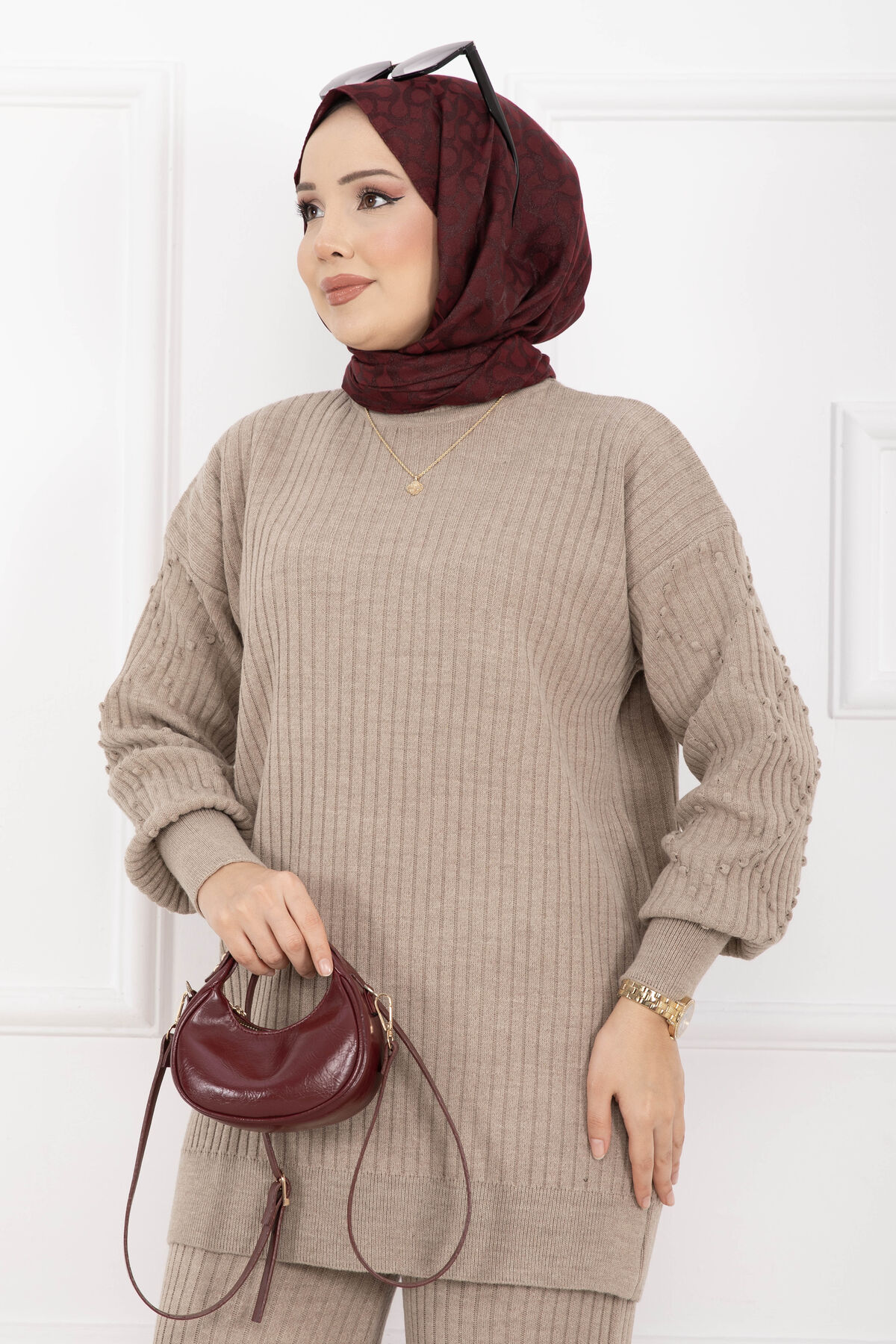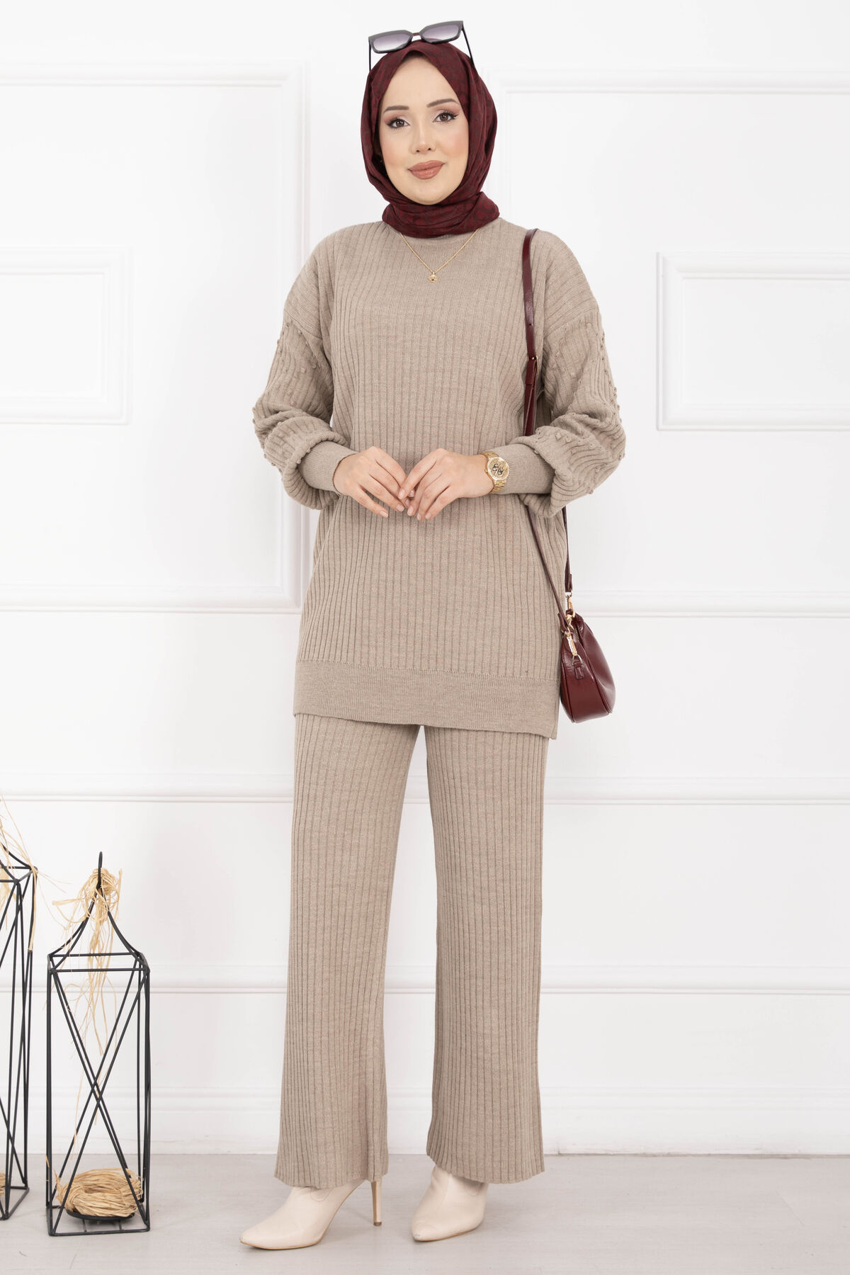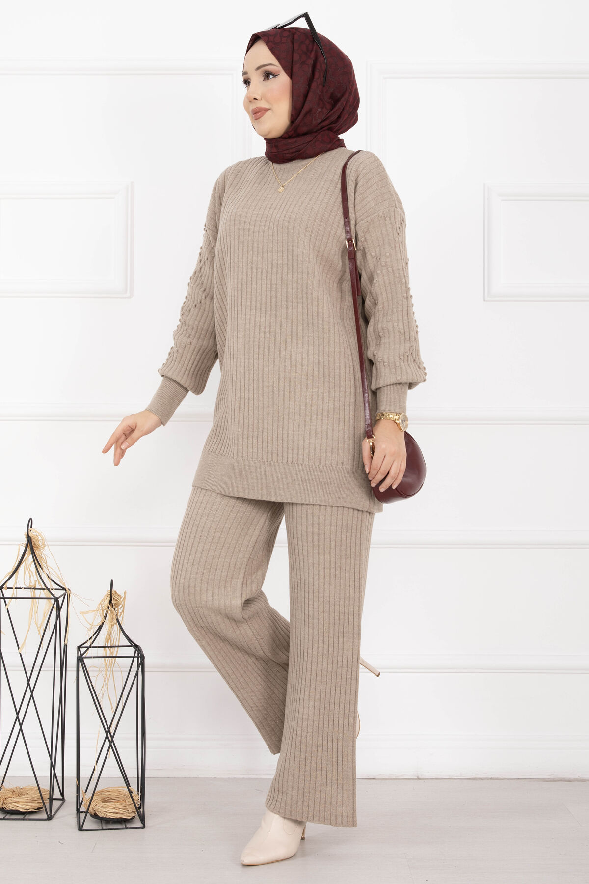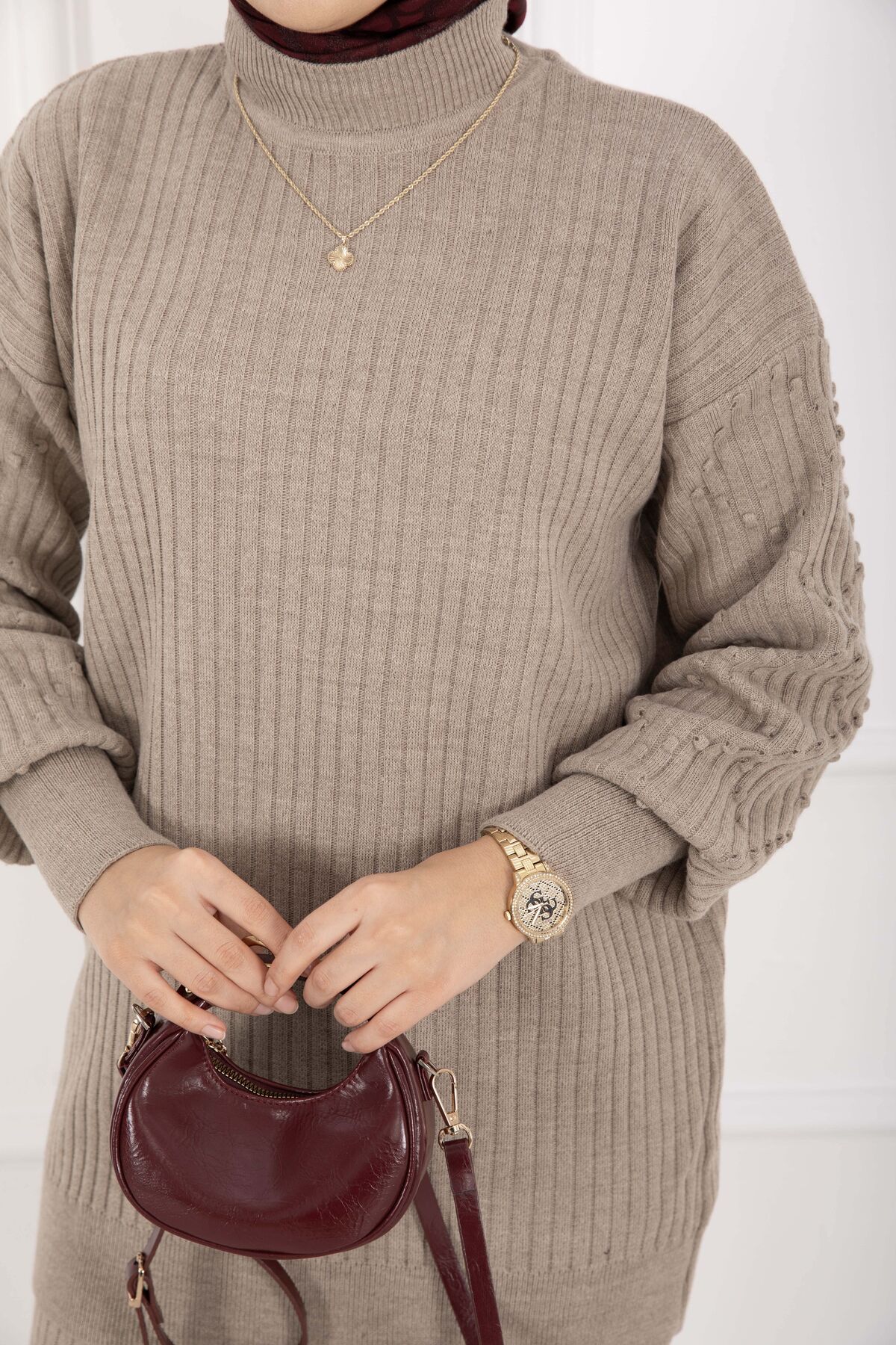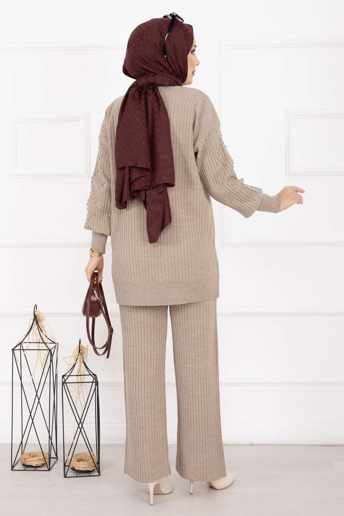 Balıkçı Yaka Fitilli Triko İkili Takım Vizon