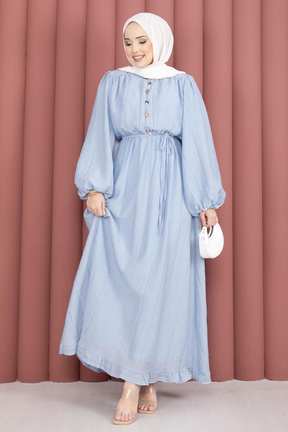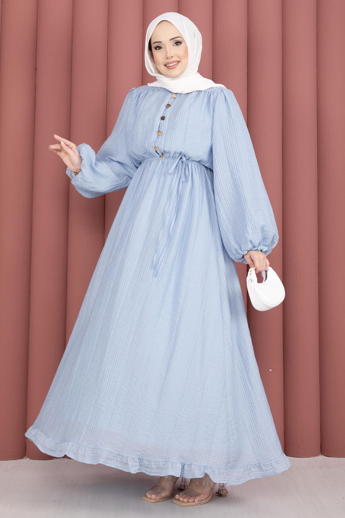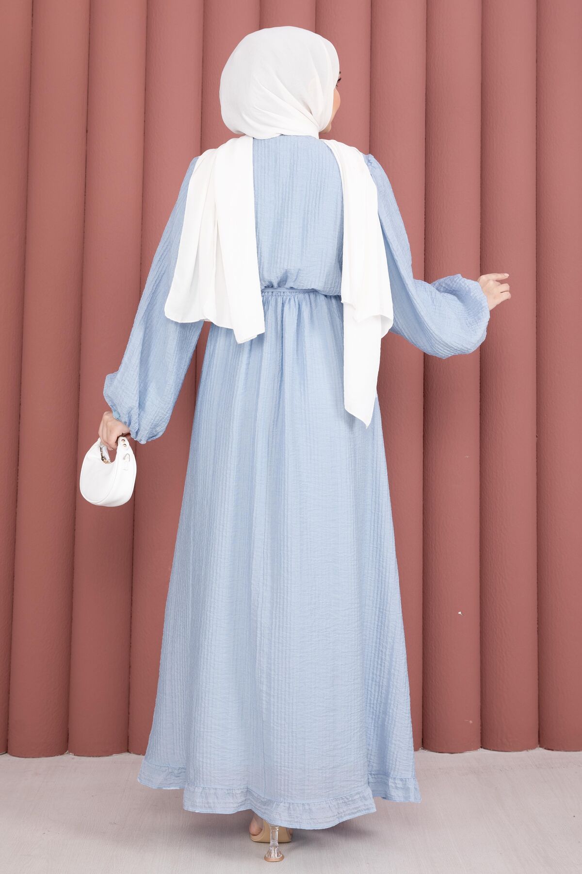 Balon Kol Eteği Fırfırlı Tesettür Elbise Bebe Mavisi