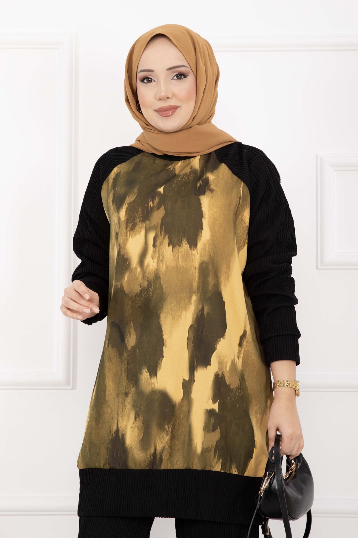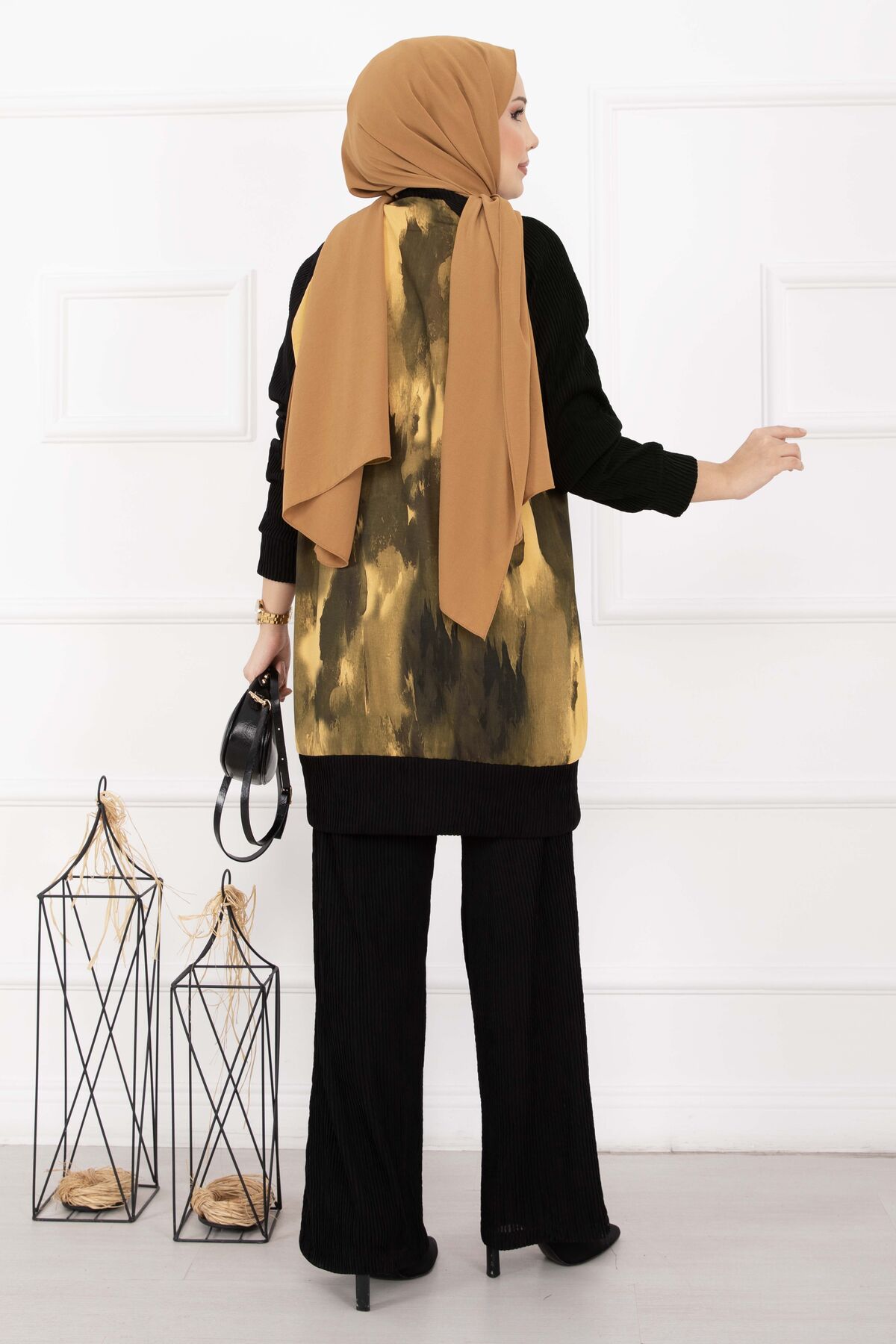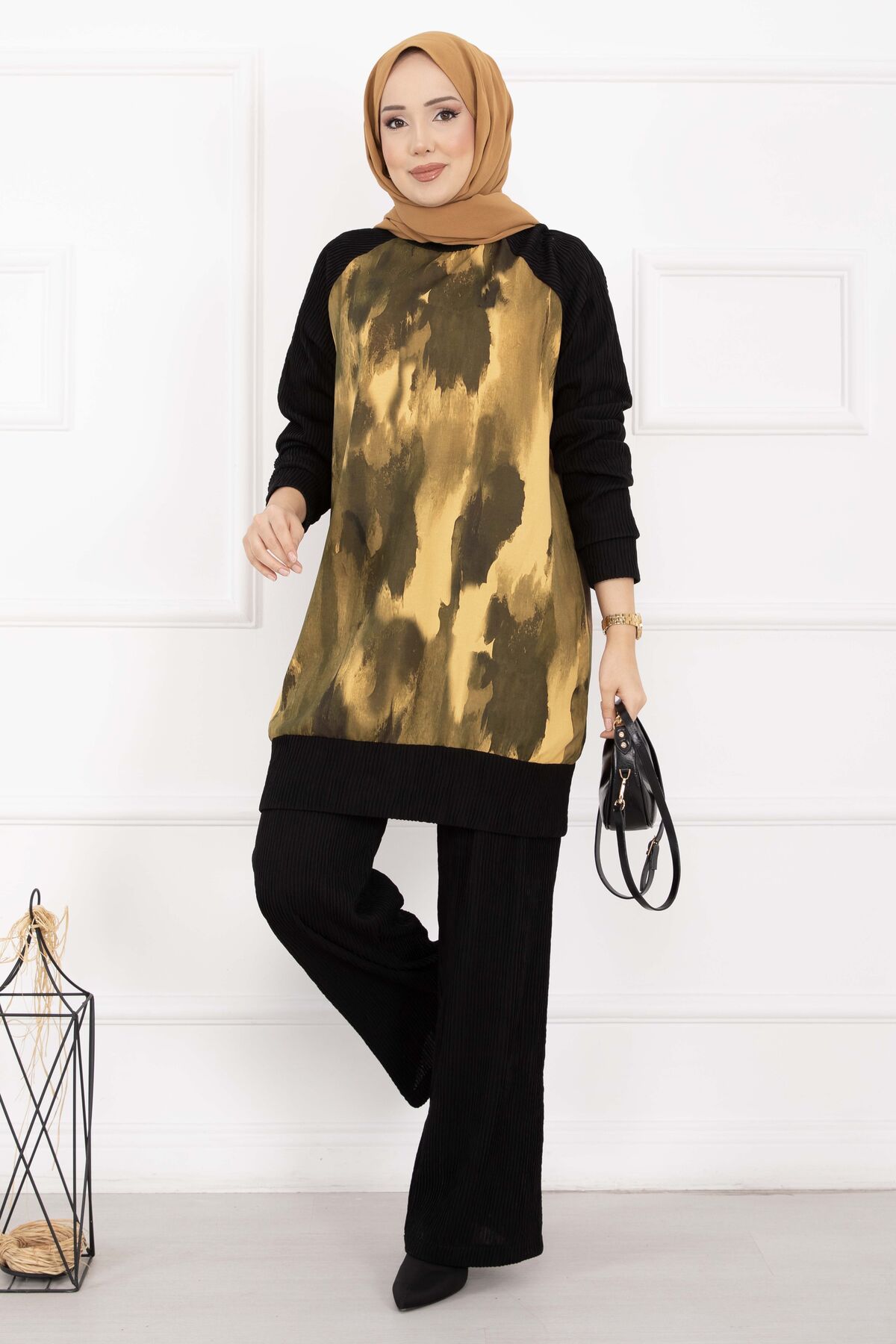 Batik Desen Ribanalı Tesettür İkili Takım Hardal