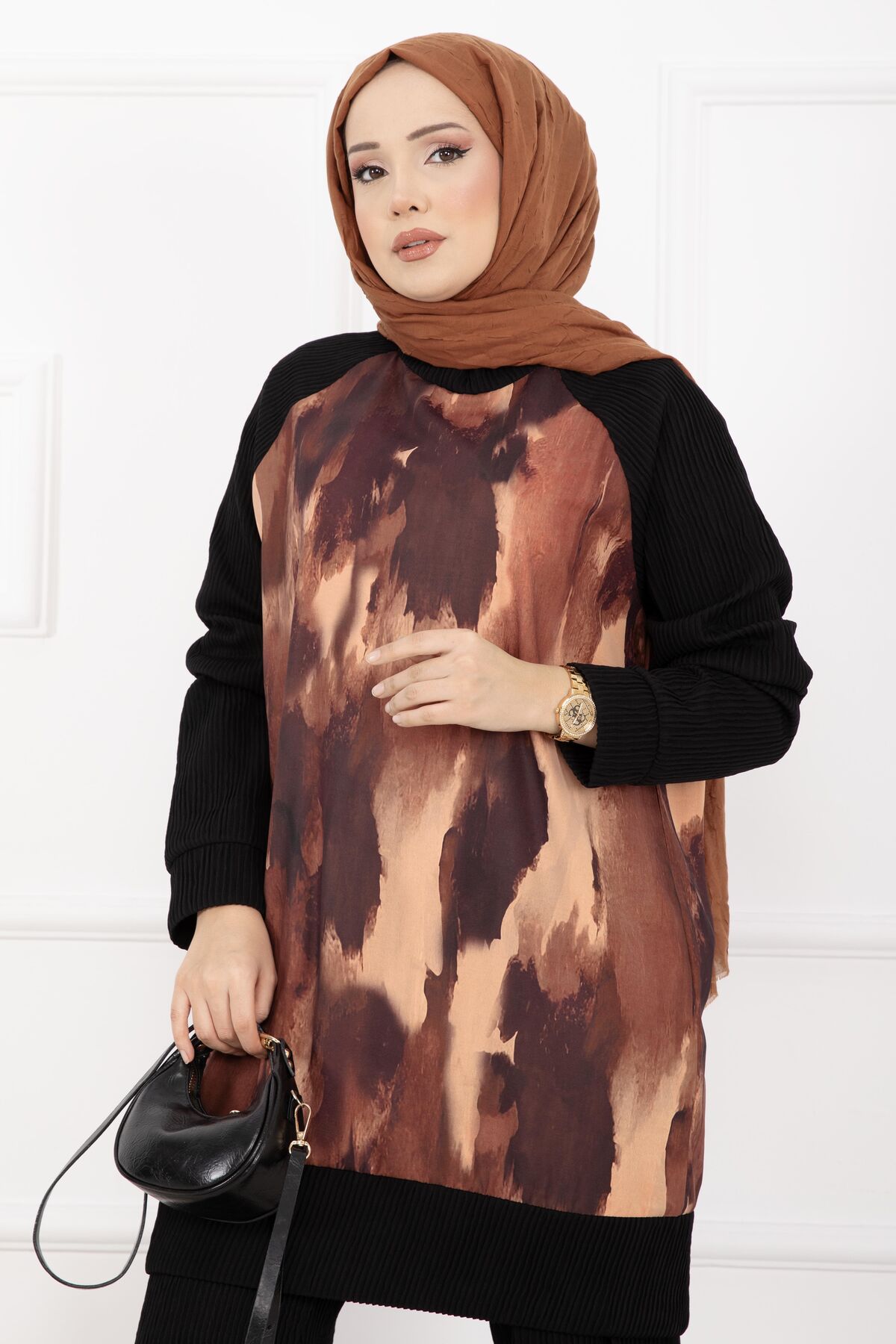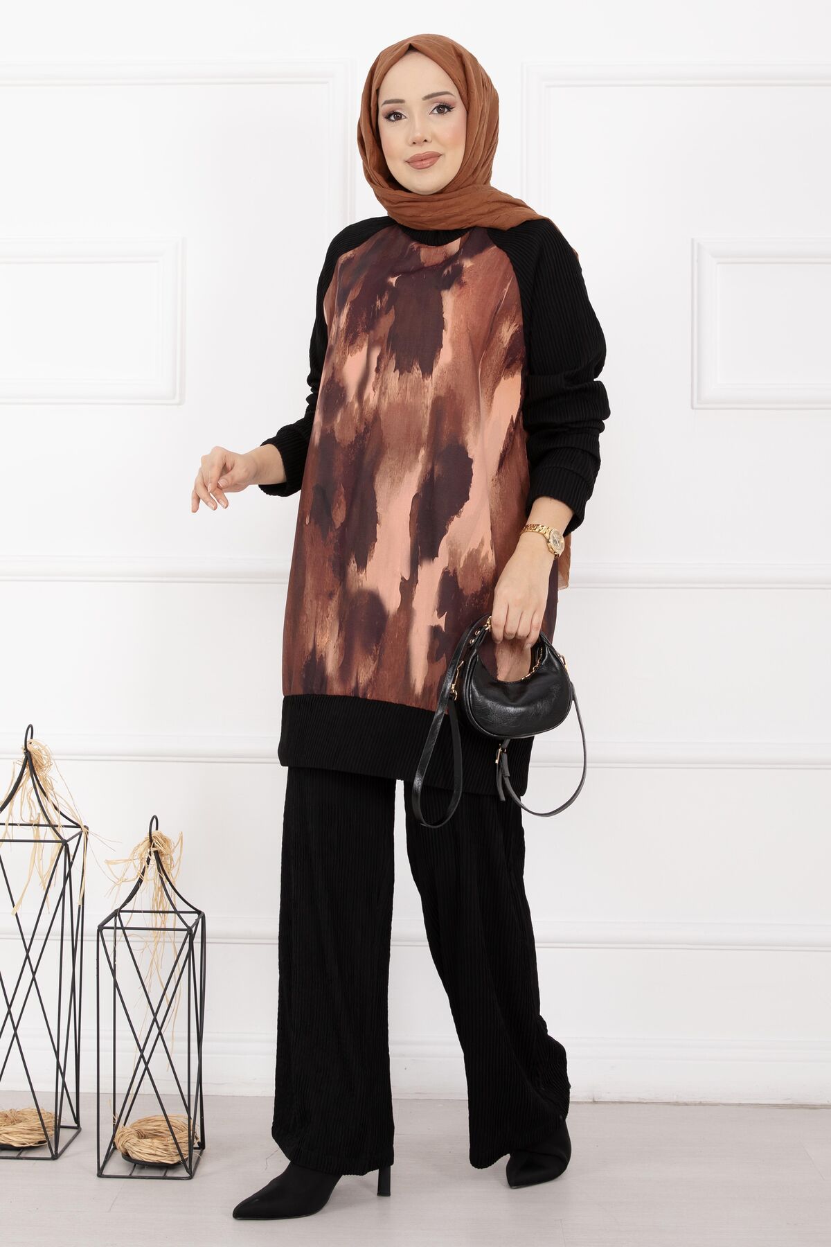 Zarif batik desenleri ve modern piliseli dokusuyla öne çıkan Batik Desen Ribanalı Tesettür İkili Takım, şıklık ve konforu bir arada sunar. Dijital baskı batik detayları sayesinde desenler canlılığını uzun süre korurken, örme kumaş yapısı gün boyu rahat bir kullanım sağlar. Ribanalı tasarımı ve dik yaka detayı, takıma hem sportif hem de şık bir duruş kazandırır. Lastikli bel yapısına sahip pantolonu ise hareket özgürlüğü sunarak günlük kullanımdan özel kombinlere kadar geniş bir kullanım alanı sağlar.