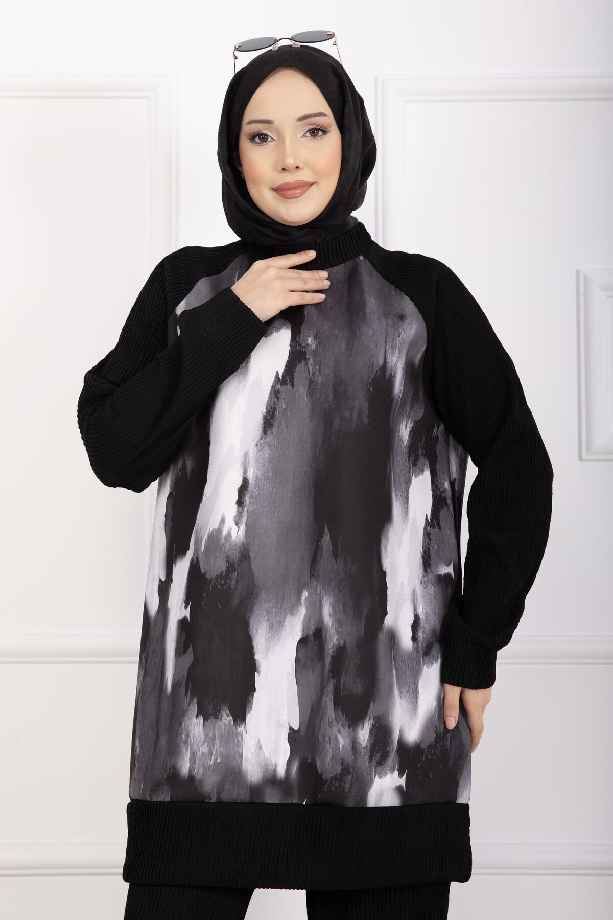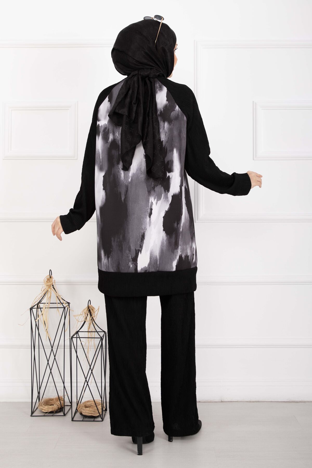 Batik Desen Ribanalı Tesettür İkili Takım Siyah