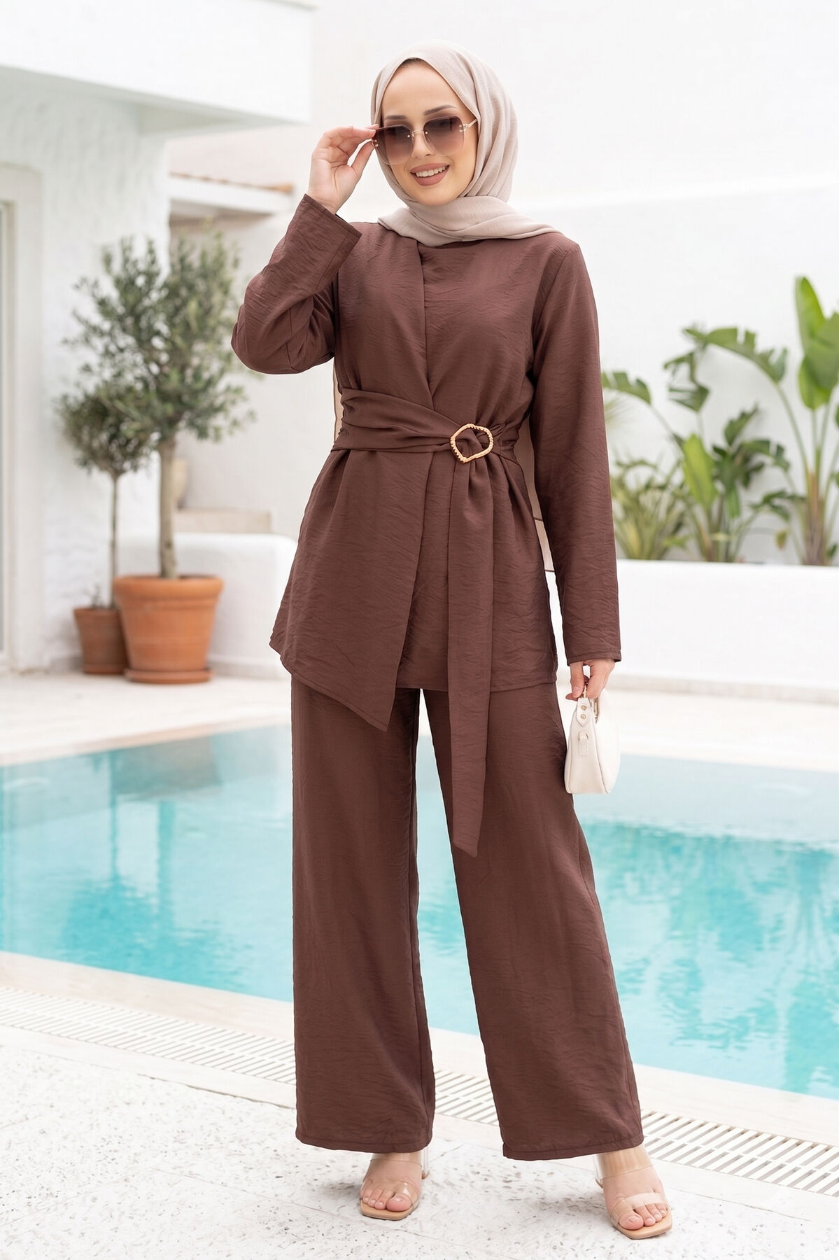 Bel Aksesuar Detaylı Tunik Pantolon İkili Takım Kahve