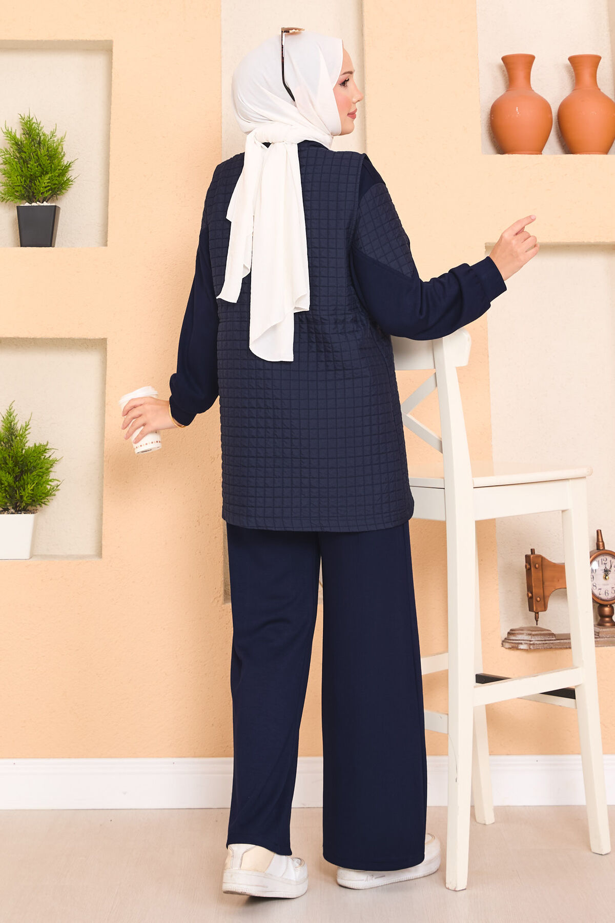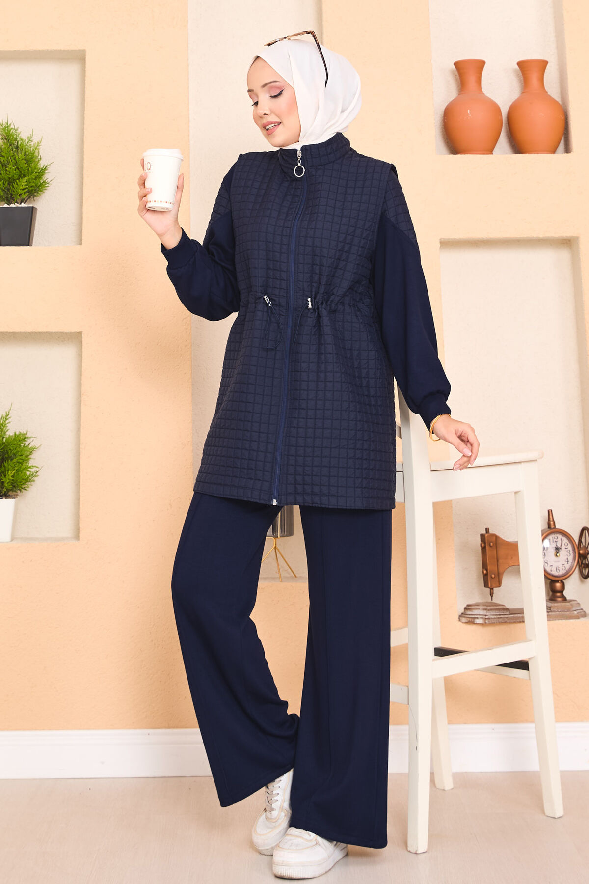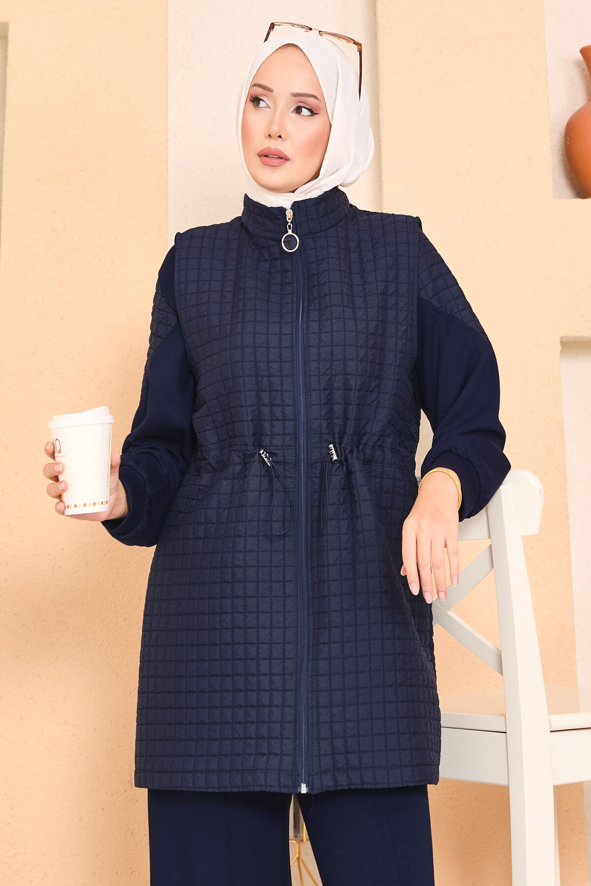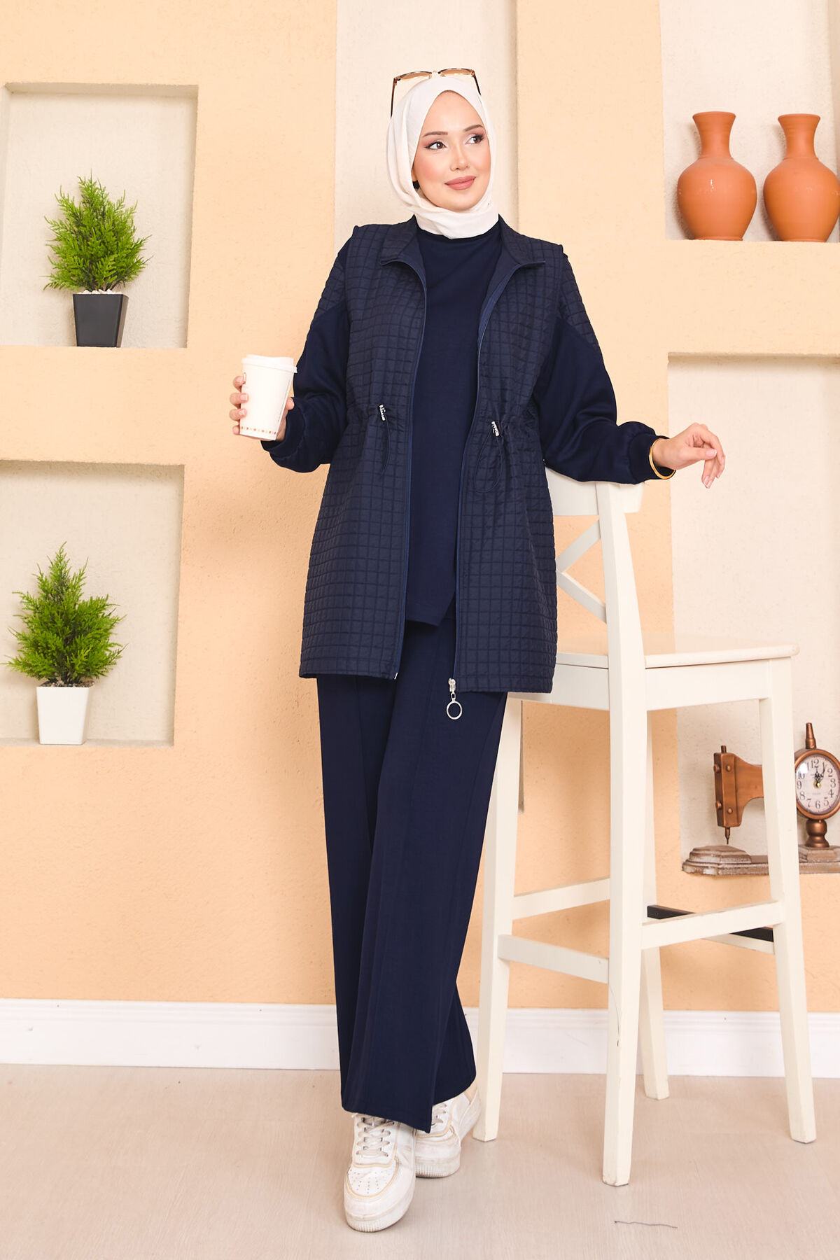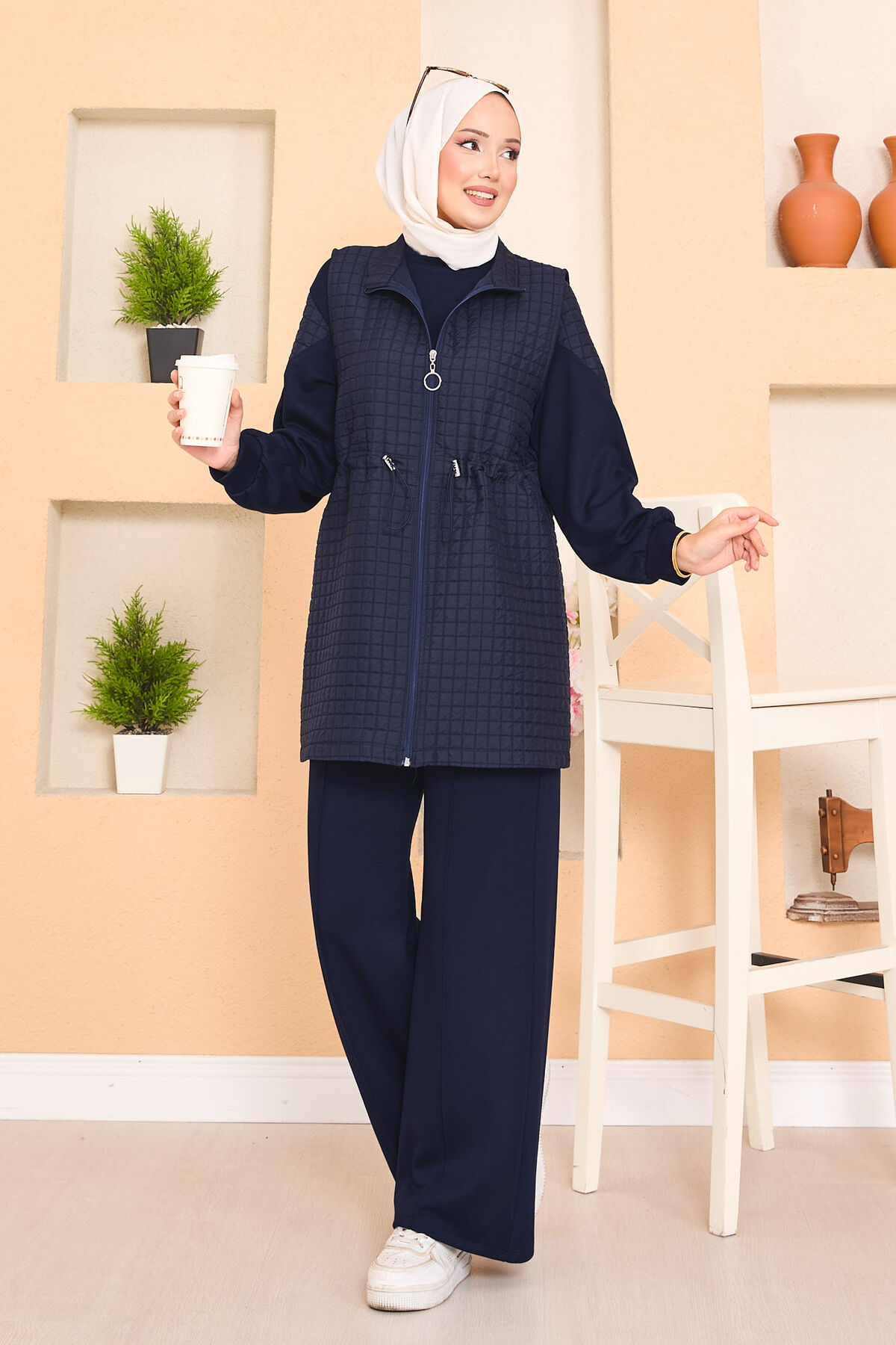 Beli Ayarlanabilir Kapitone Yelekli Üçlü Tesettür Takım Lacivert