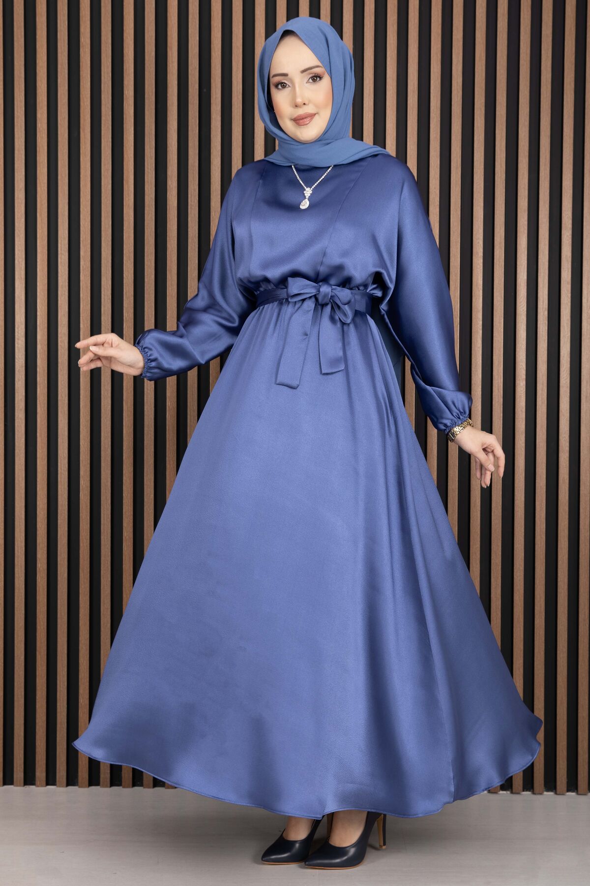 Şık ve zarif duruşuyla öne çıkan Beli Büzgülü Kuşaklı Tesettür Elbise, saten kumaşın parlak ve akıcı yapısıyla özel günlerde ve davetlerde göz alıcı bir görünüm sunar. Rahat kalıbı ve feminen detaylarıyla konfor ve şıklığı bir arada sunar.