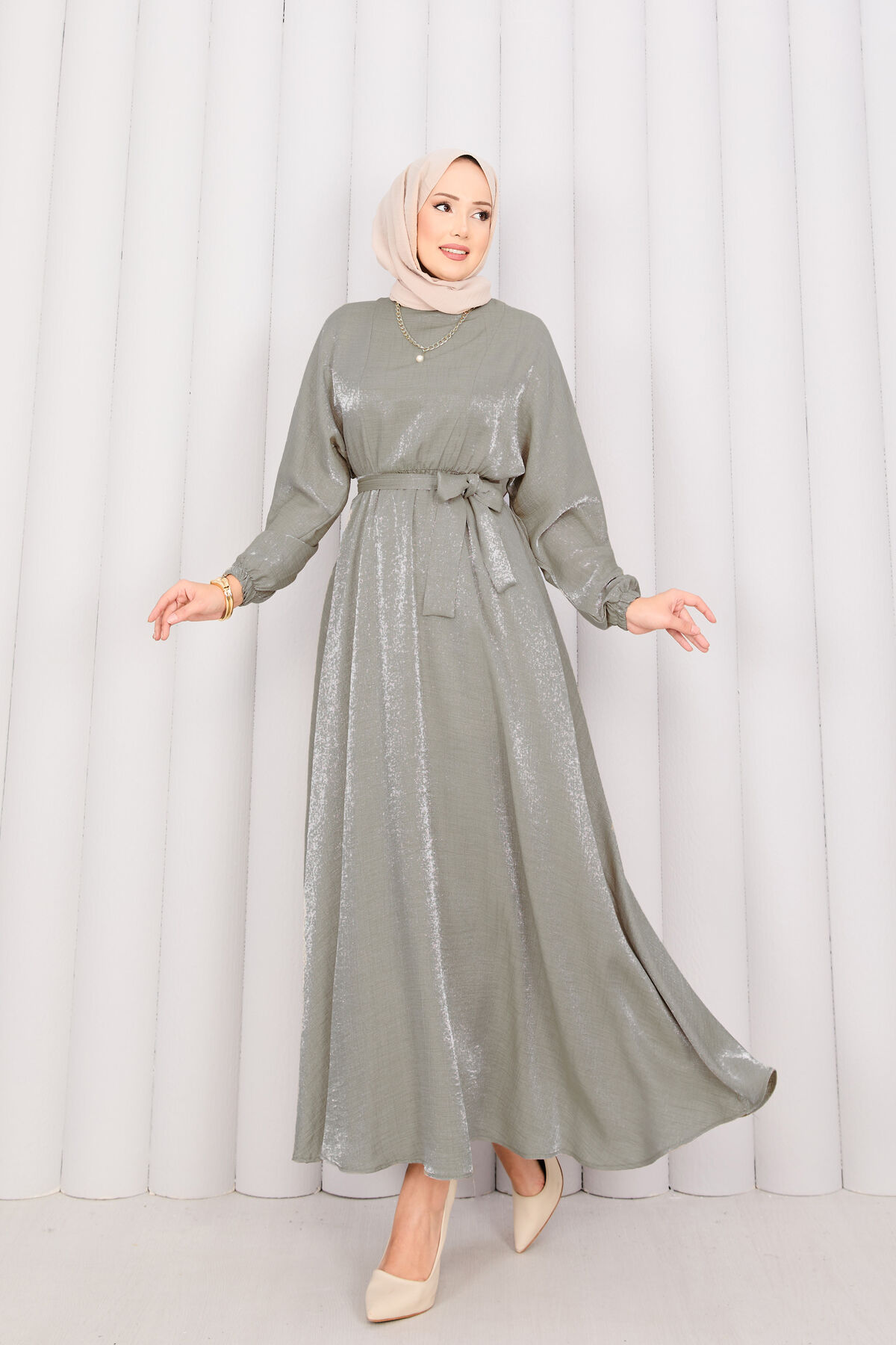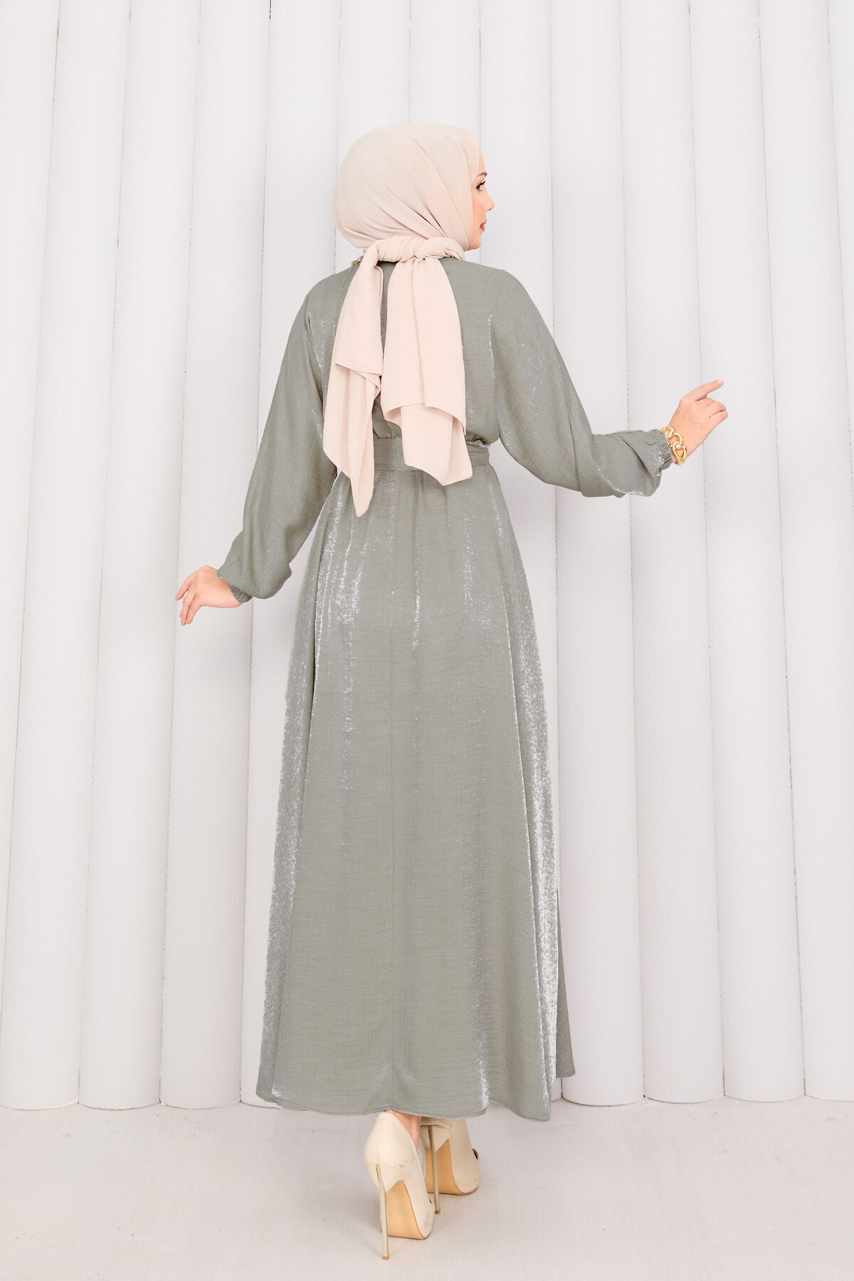 Beli Büzgülü Seyyar Kuşaklı Yarasa Kol Tesettür Elbise Haki