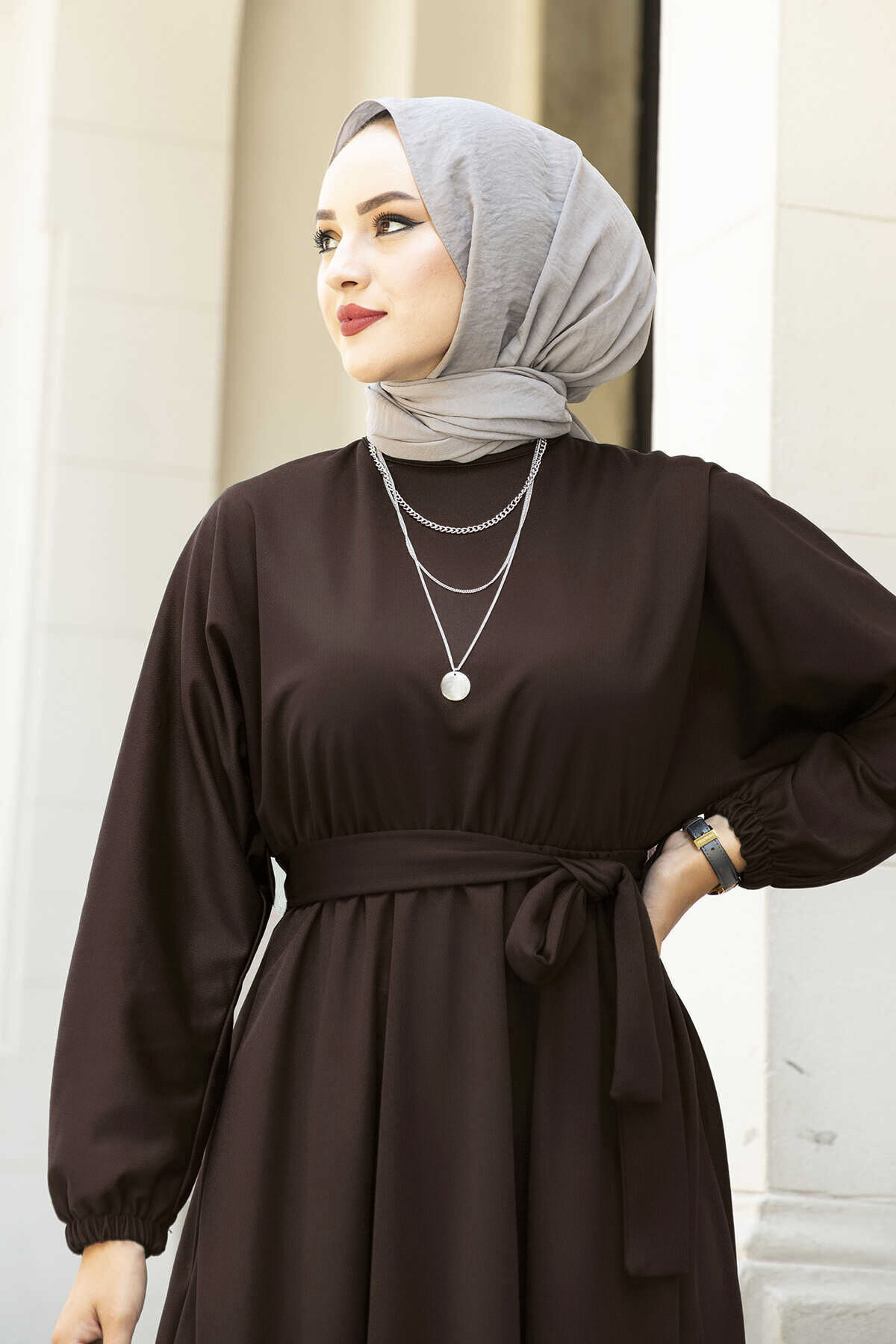 Beli Kuşaklı Tesettür Elbise 100MD-10528 Kahve