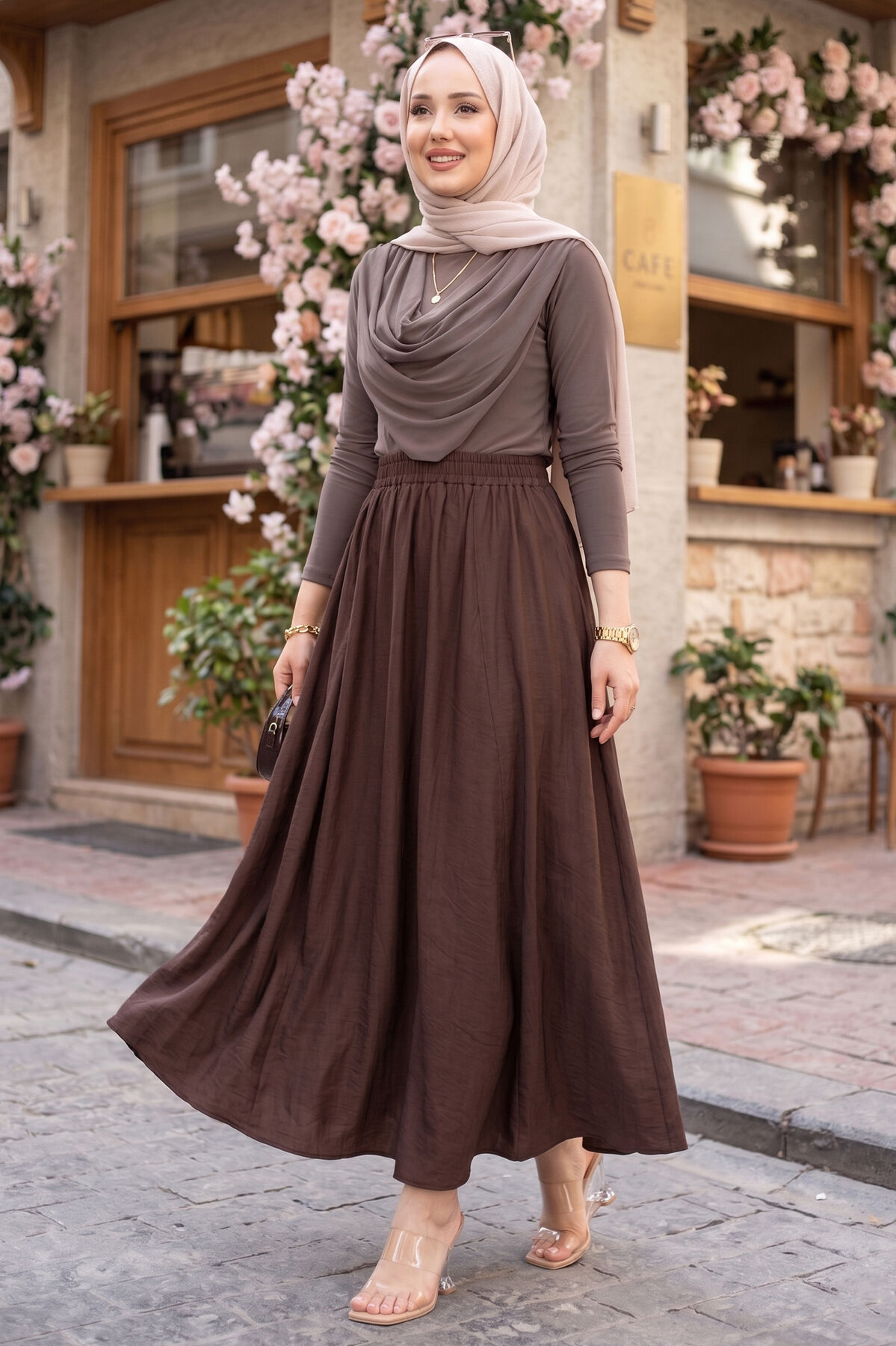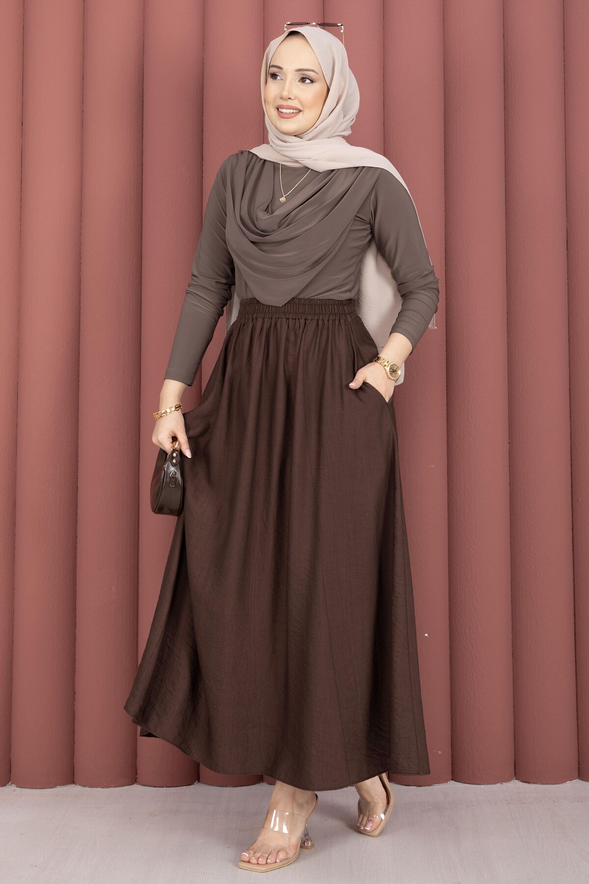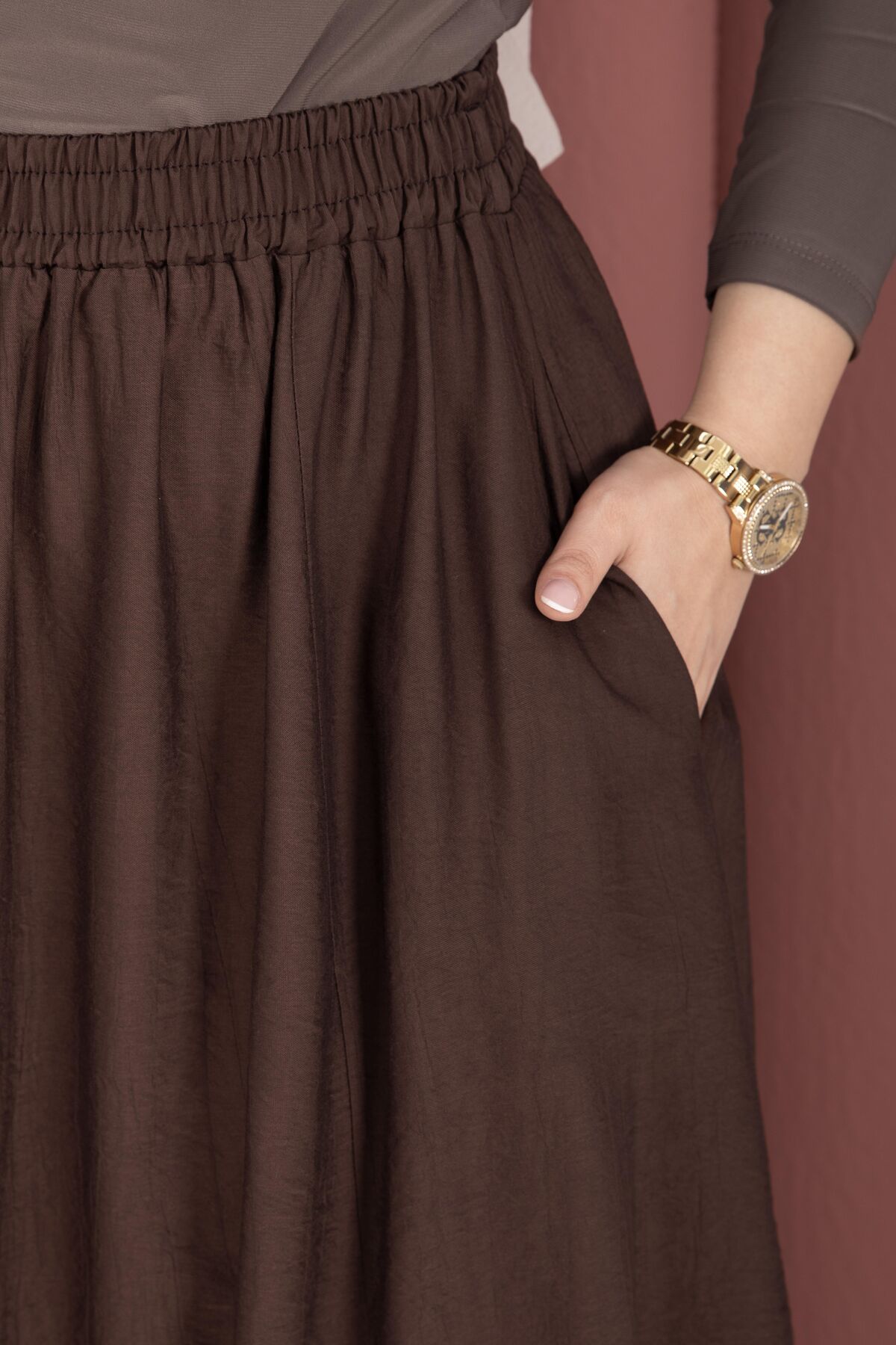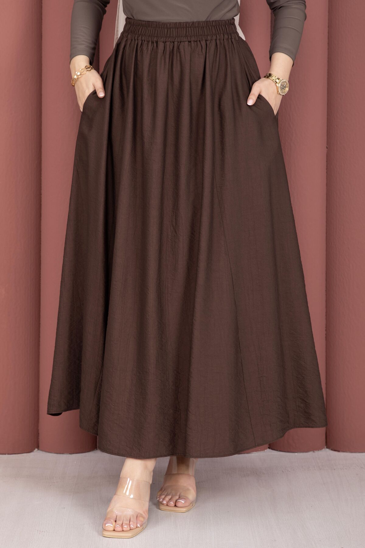 Beli Lastikli Cep Detaylı Etek Kahve