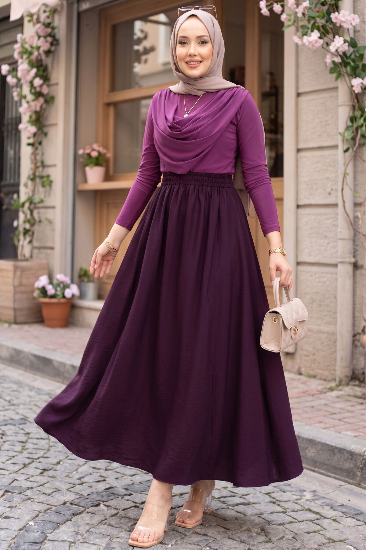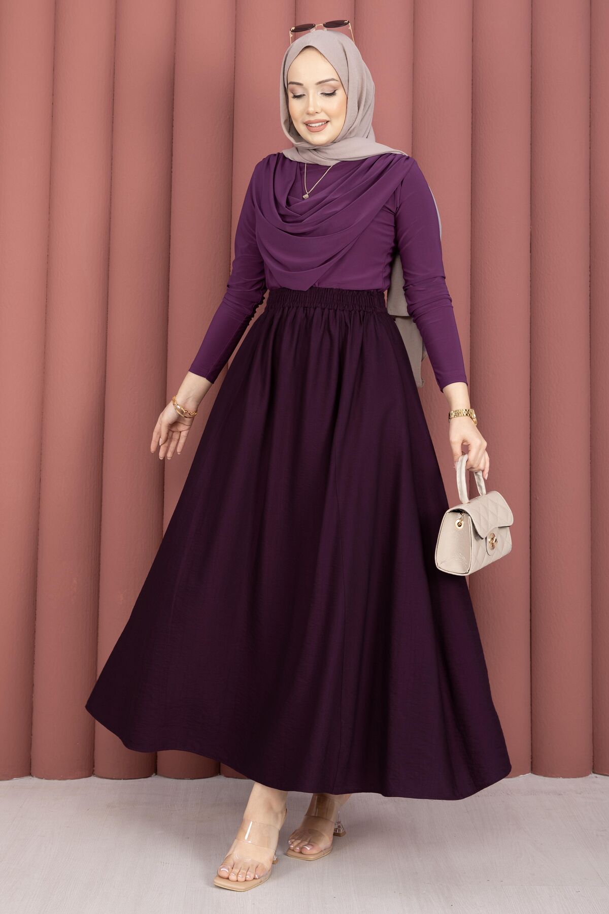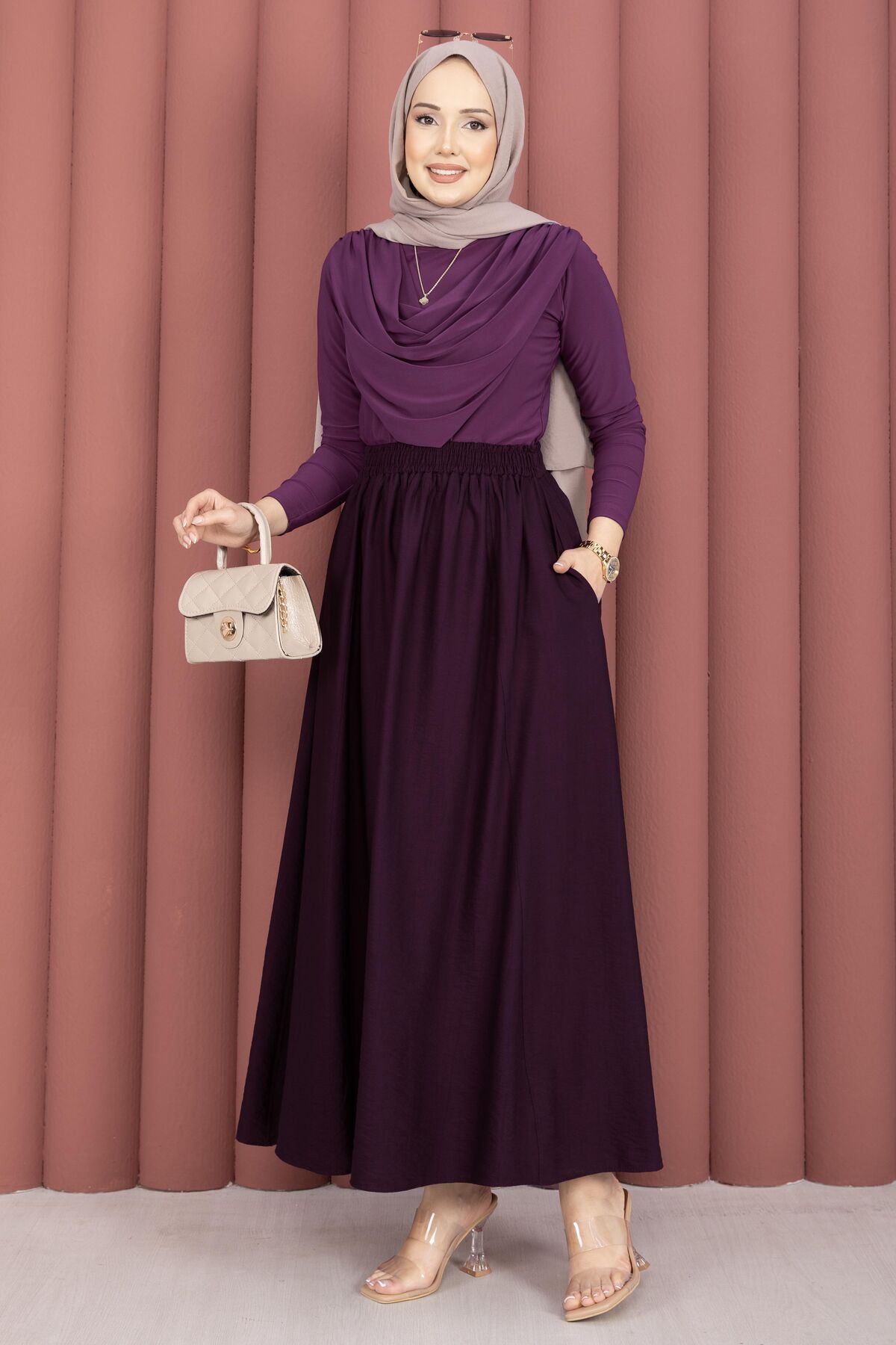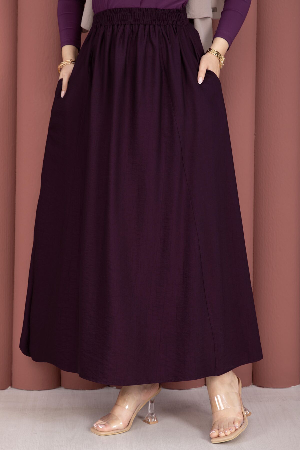 Beli Lastikli Cep Detaylı Etek Mürdüm