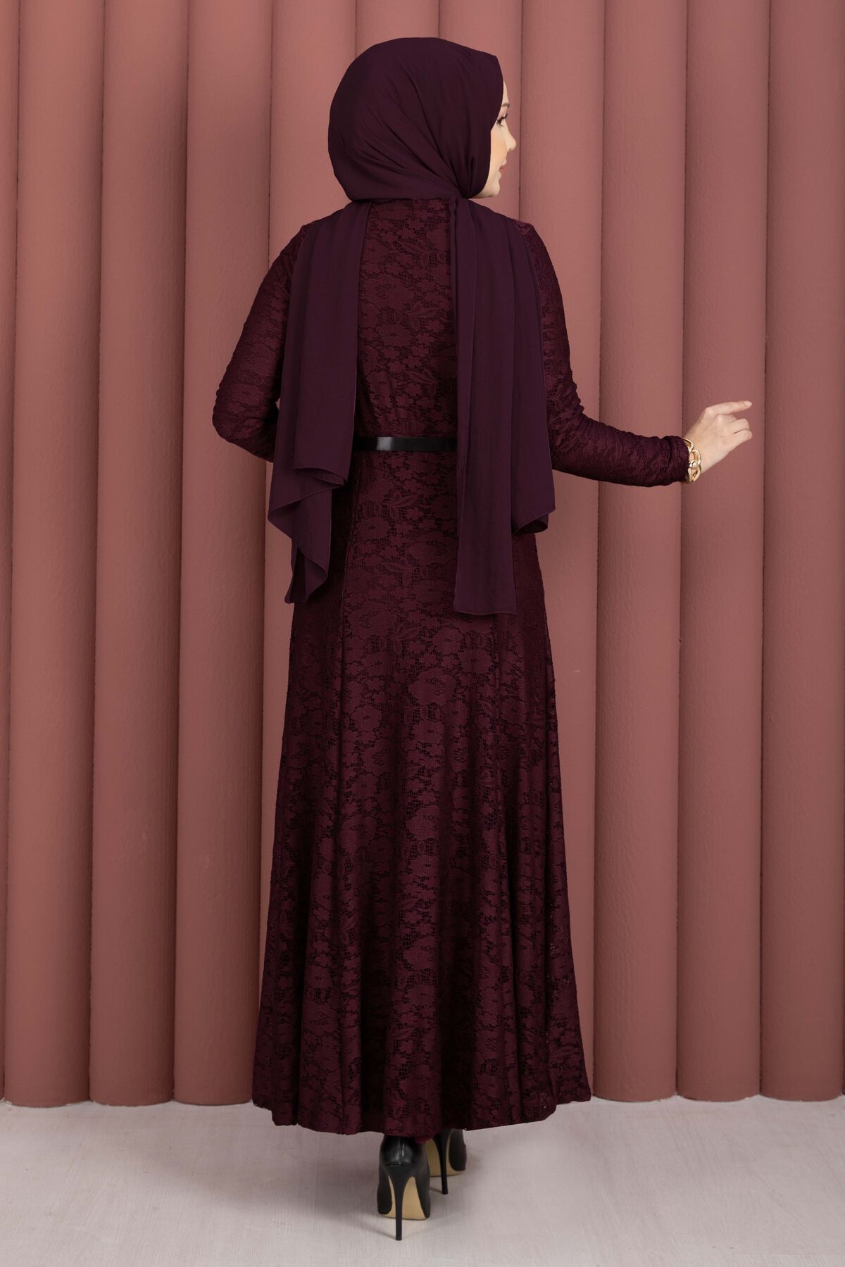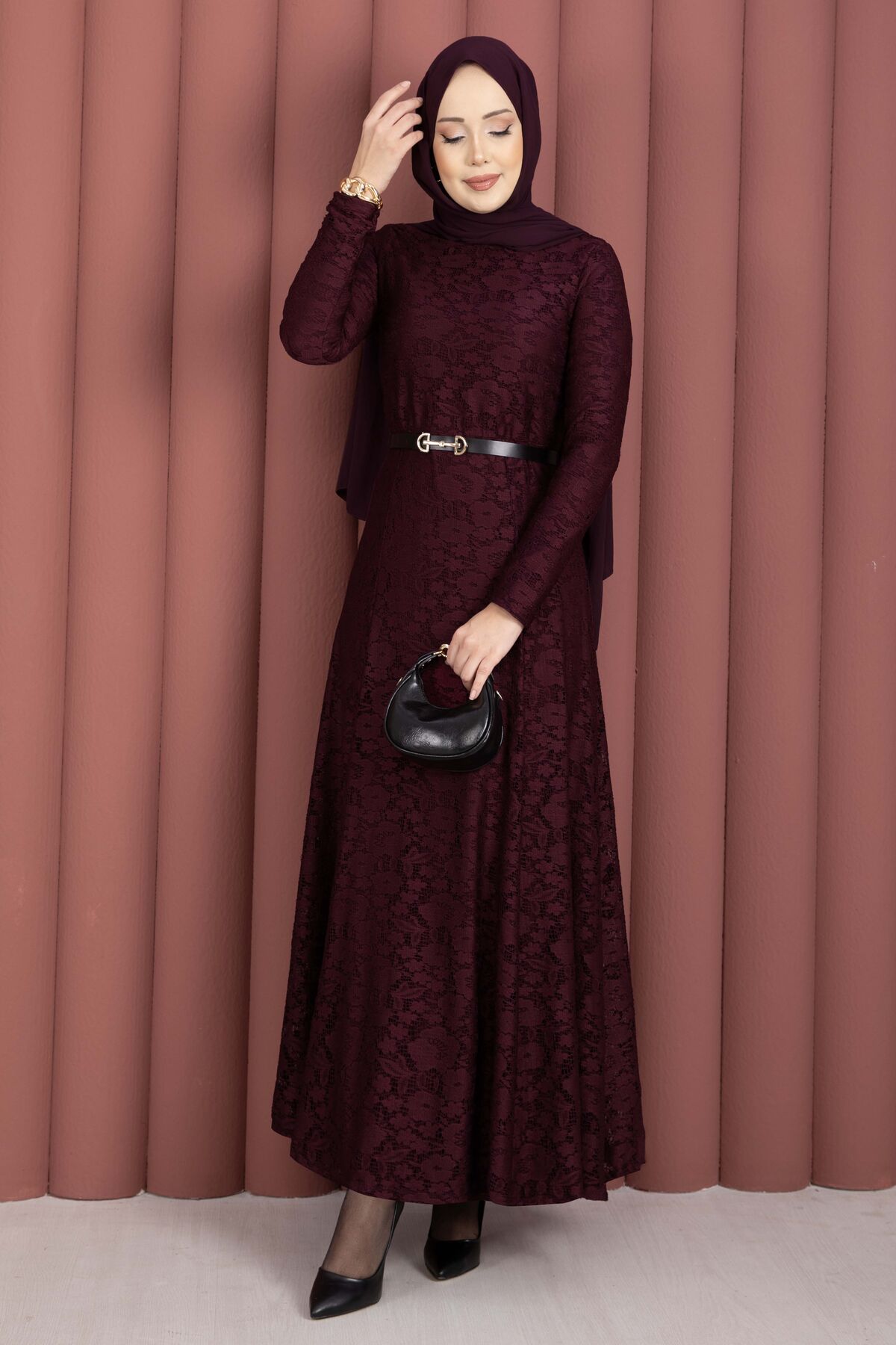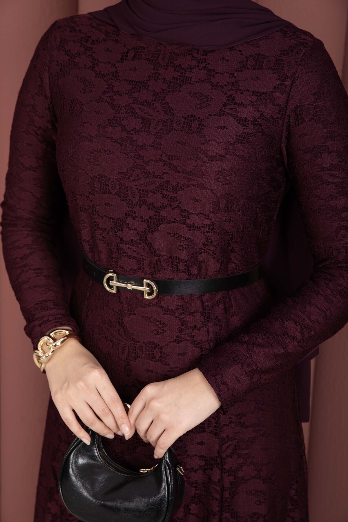 Bella Dantel Detaylı Kemerli Tesettür Elbise Bordo