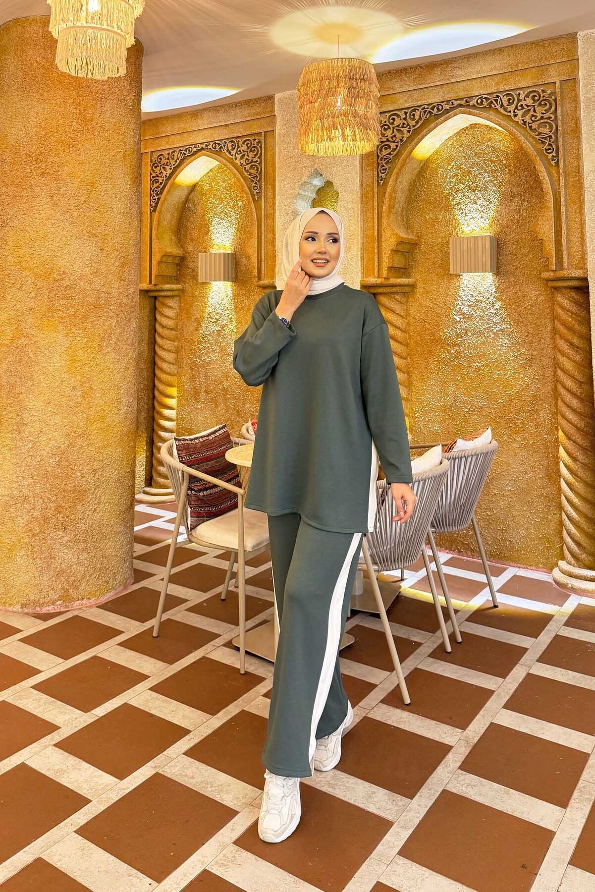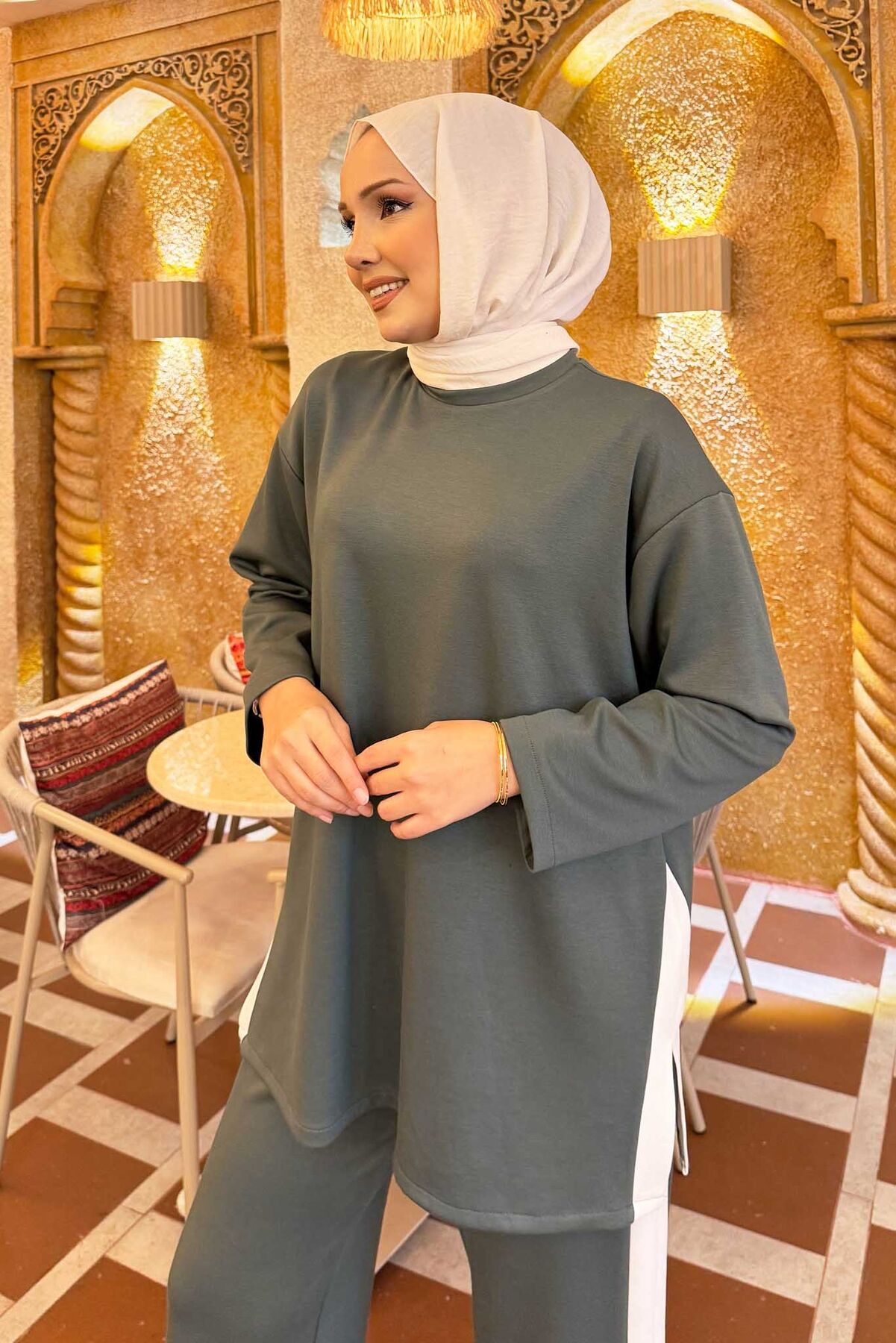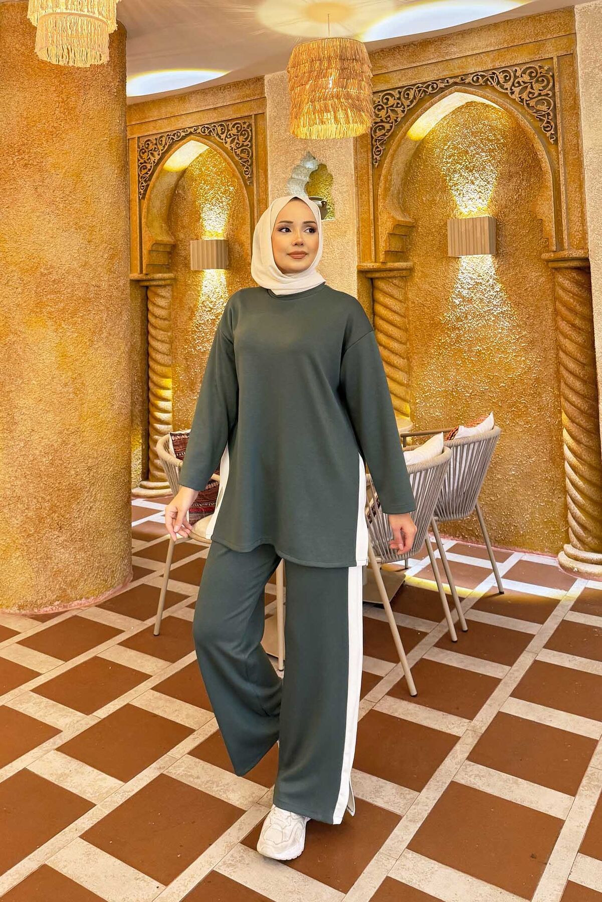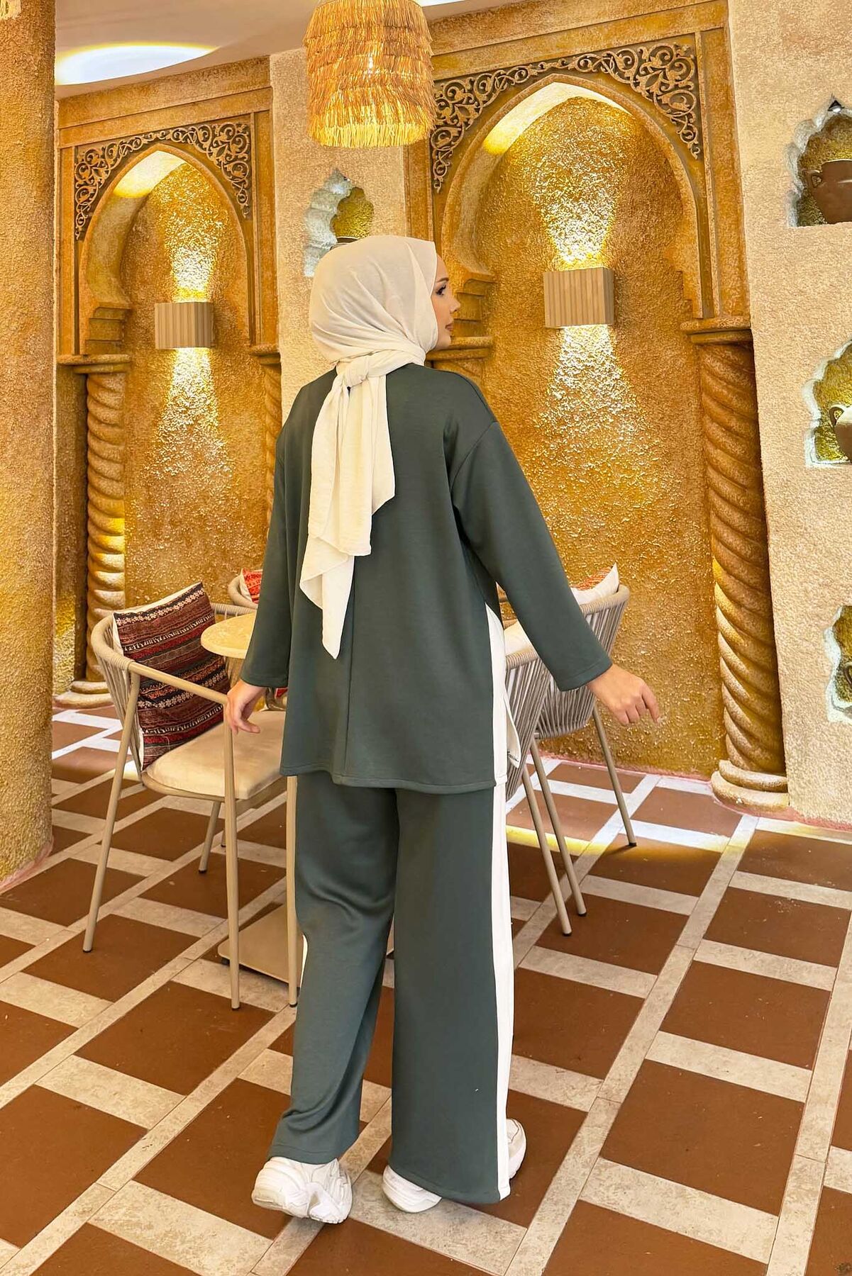 Beyaz Şeritli Yırtmaç Detaylı İkili Takım Çağla Yeşili
