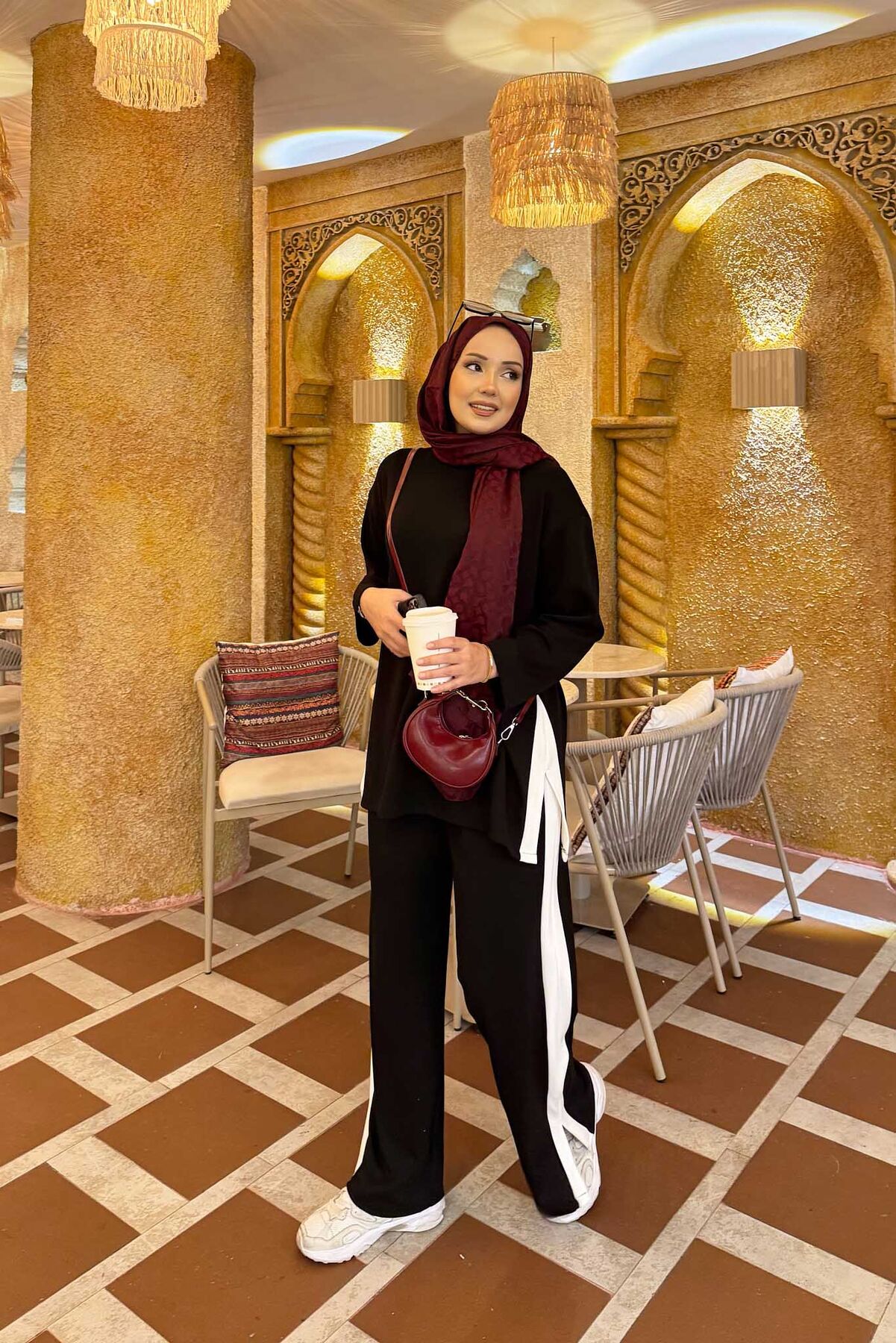 Beyaz Şeritli Yırtmaç Detaylı İkili Takım Siyah Yorumları