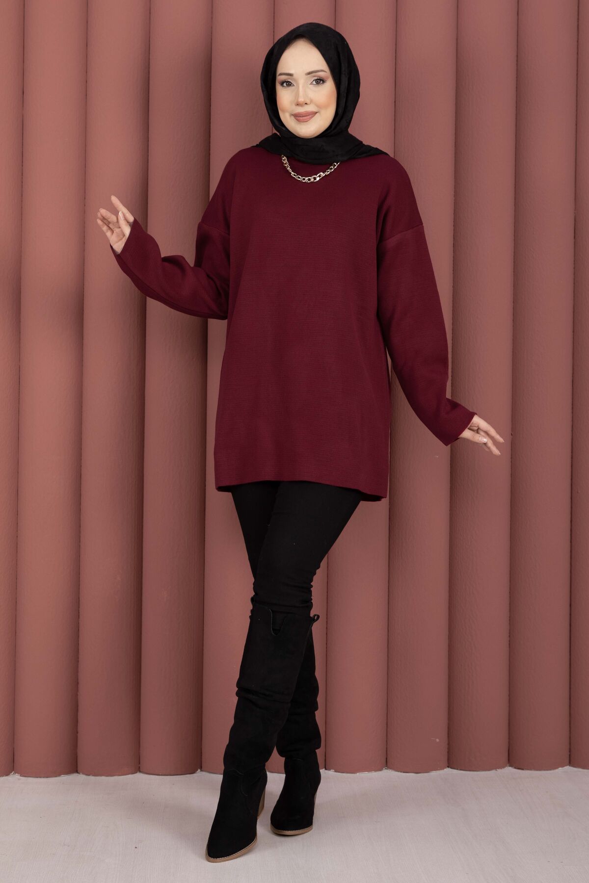Bisiklet Yaka Salaş Triko Tunik Bordo