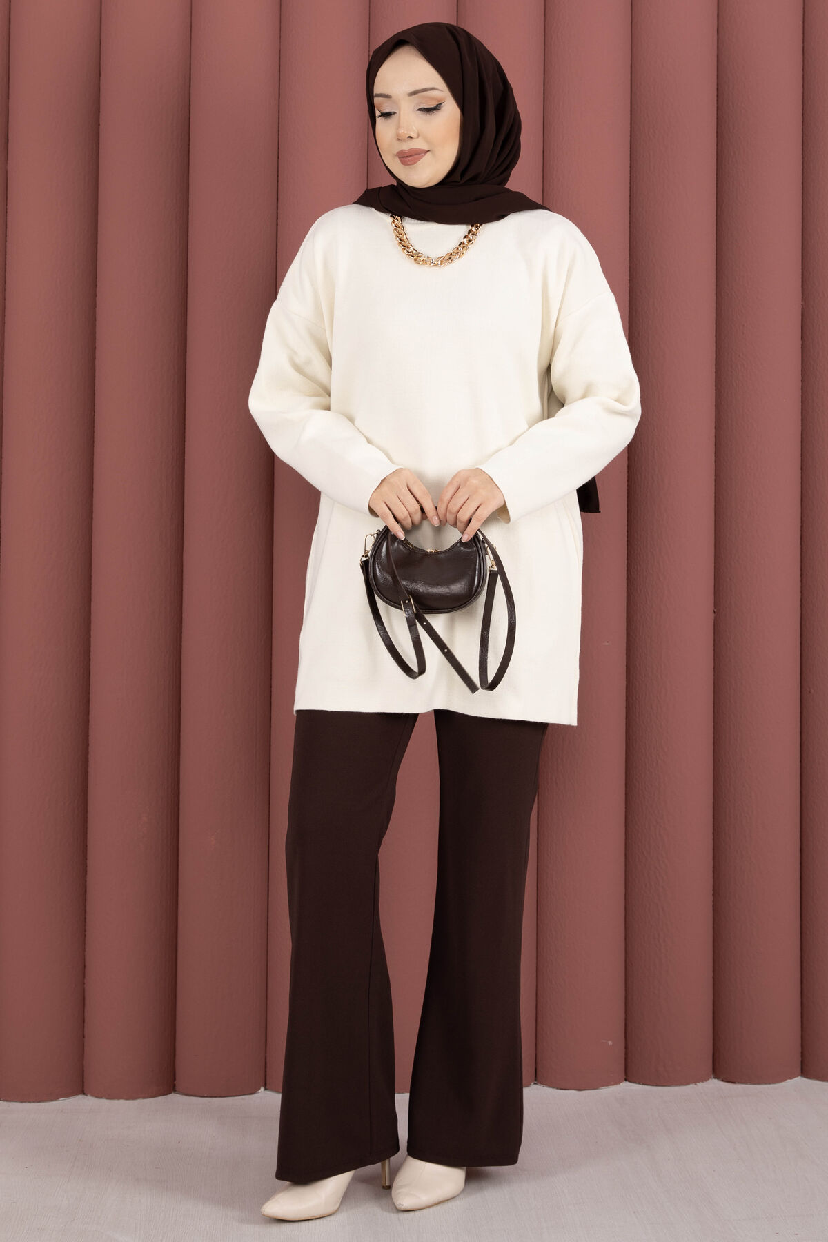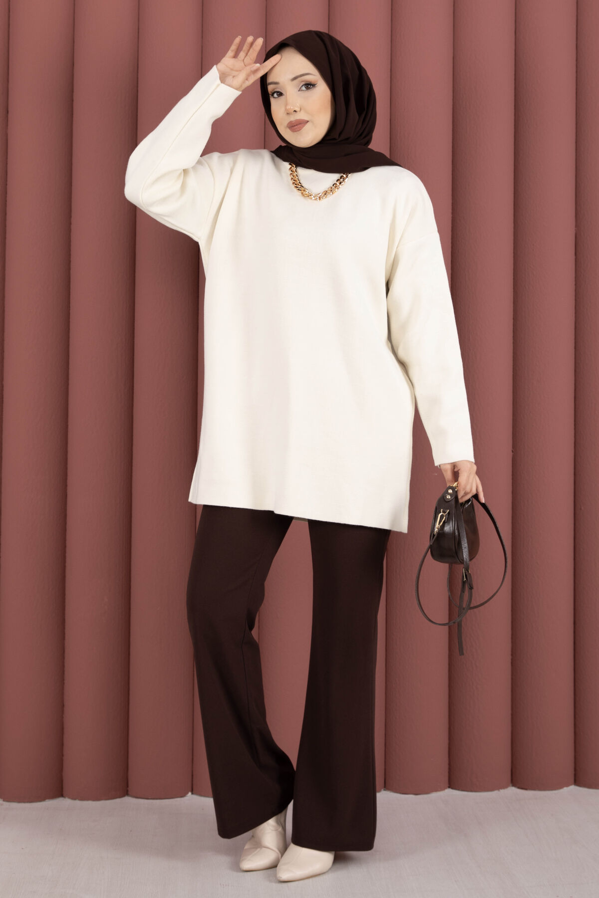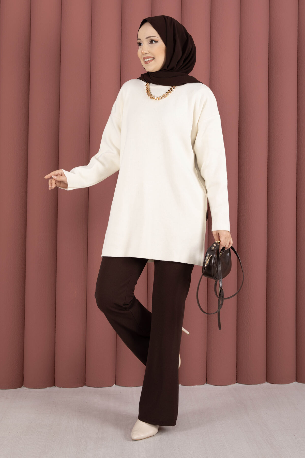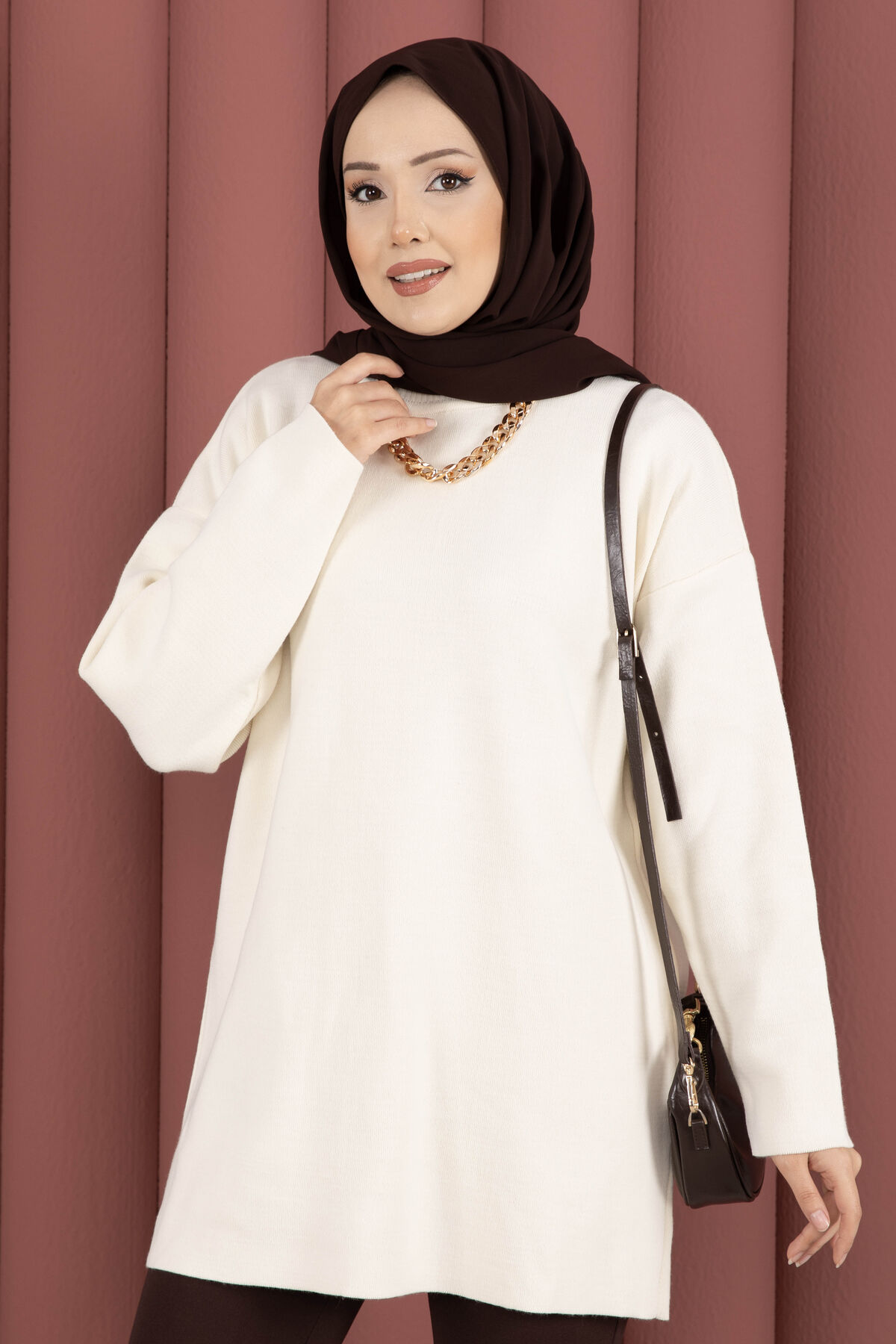 Bisiklet Yaka Salaş Triko Tunik Krem