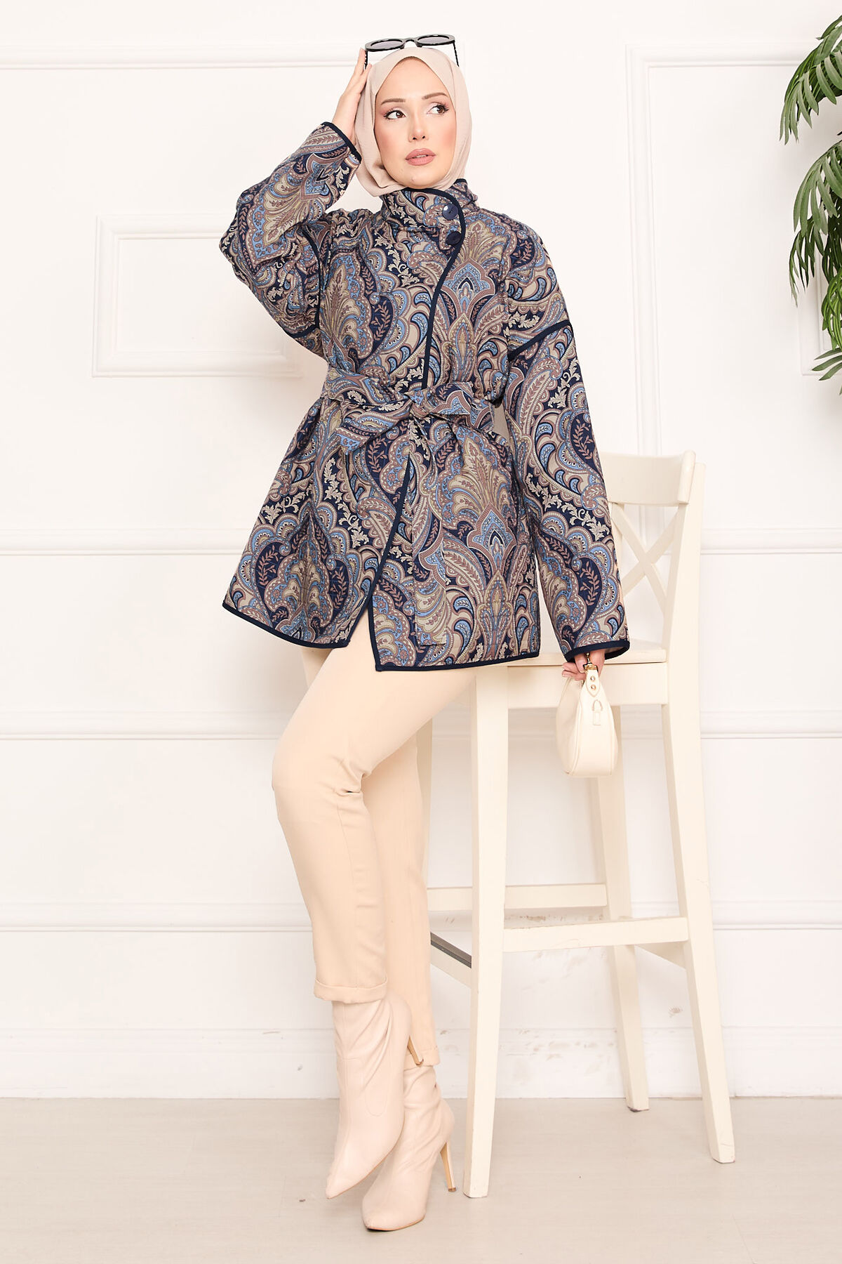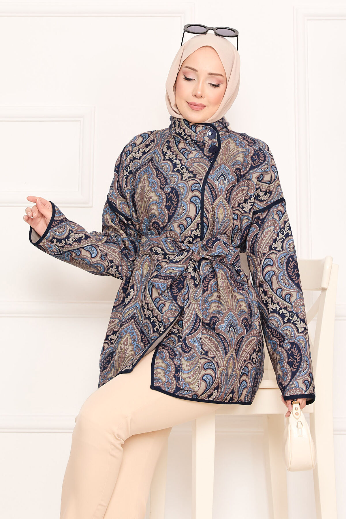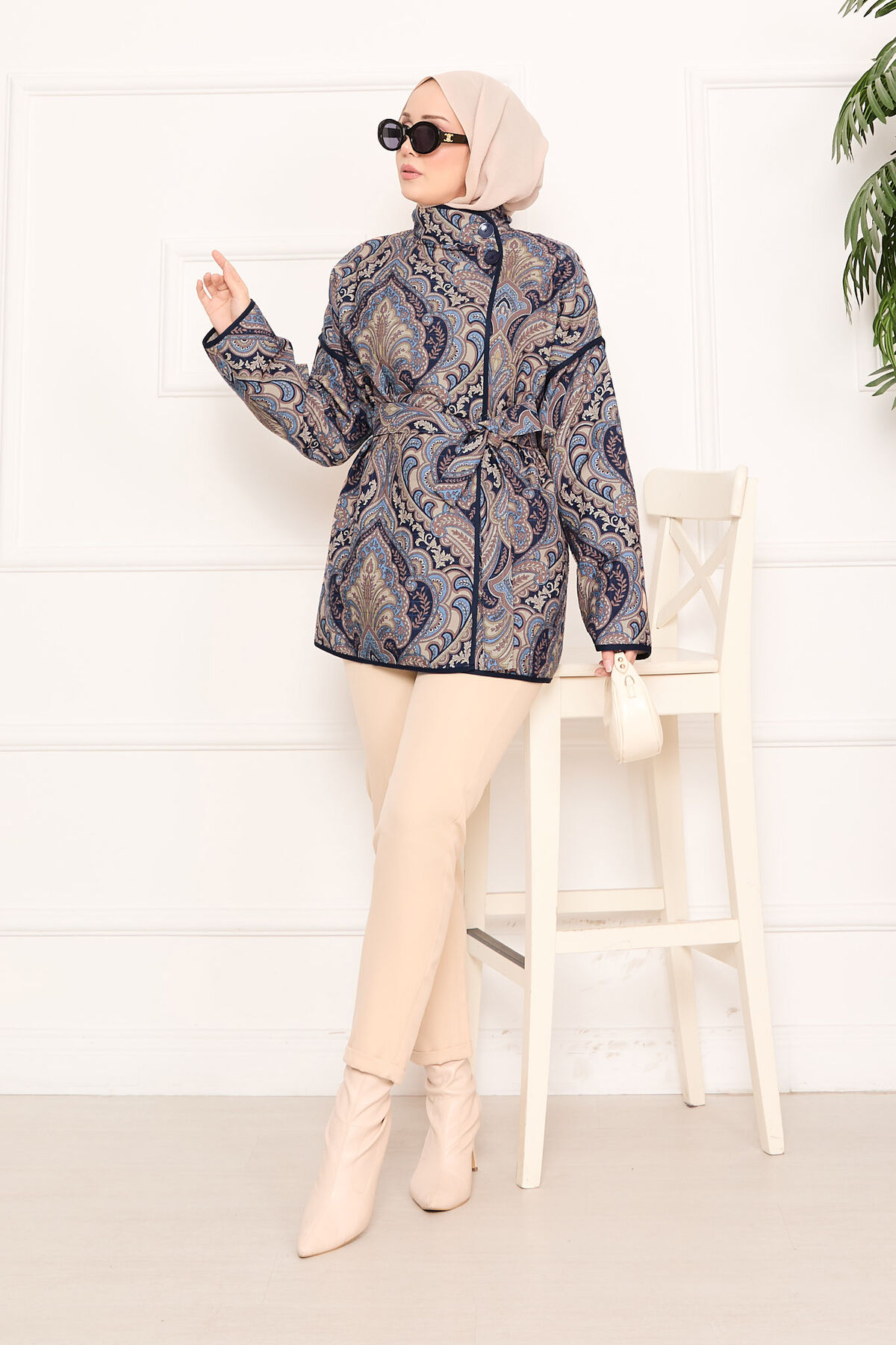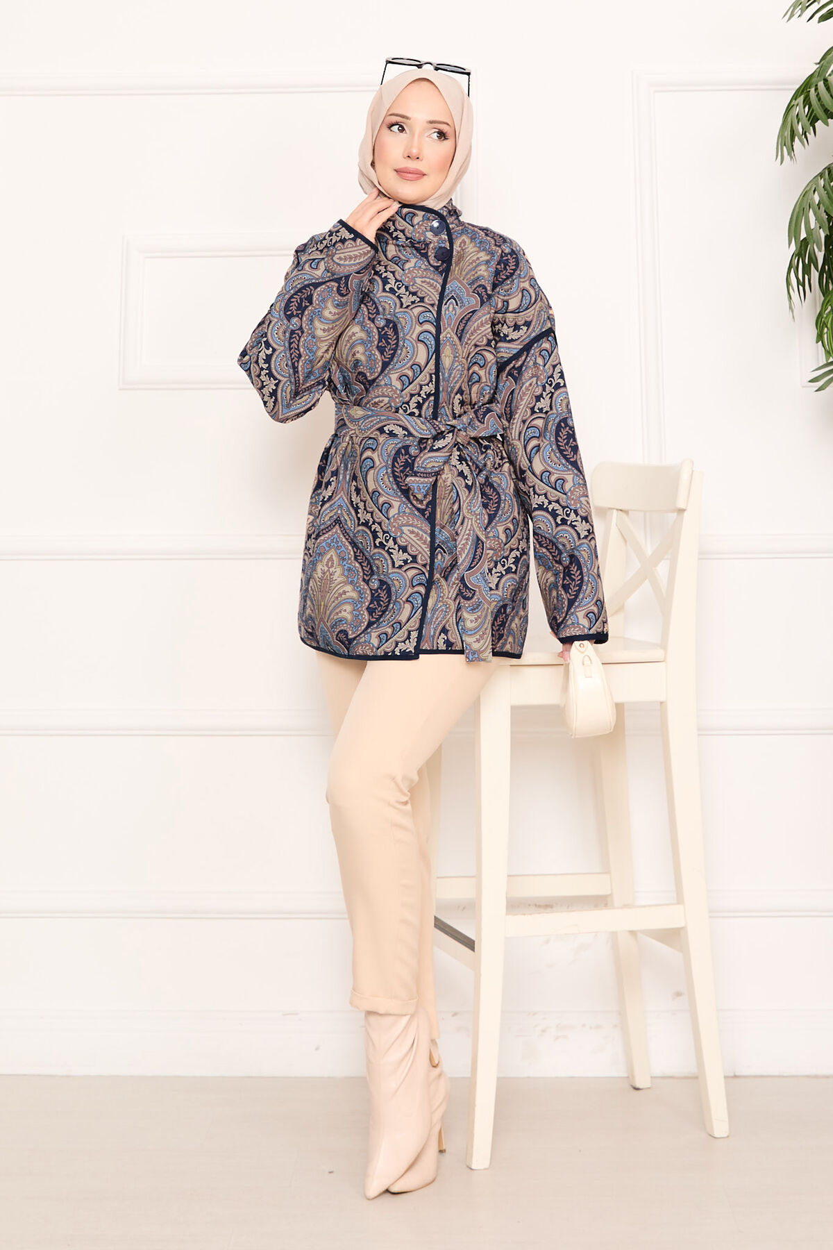 - Ürün Sonbahar & Kış modasıdır. Seyyar kemerli ve yakasında düğme detayı vardır. Etnik desenli kapitone ceket.