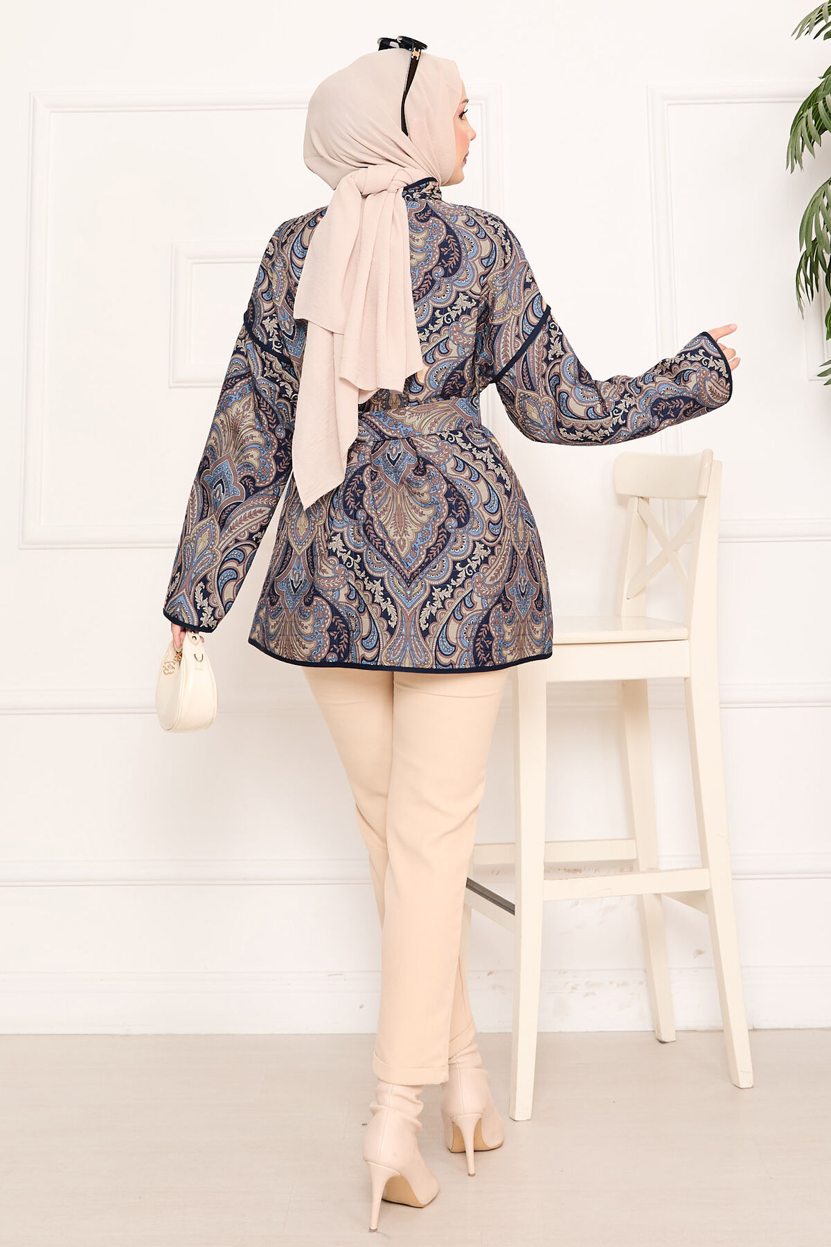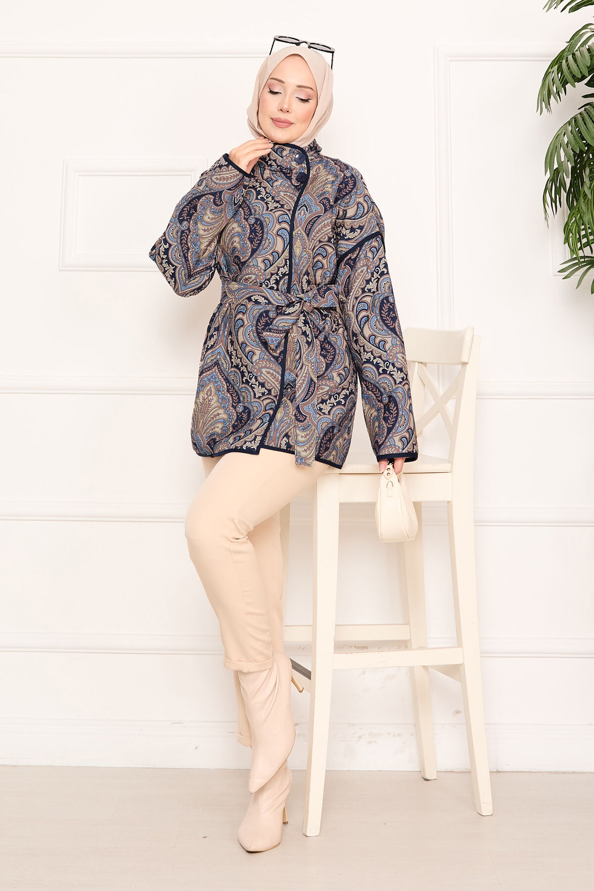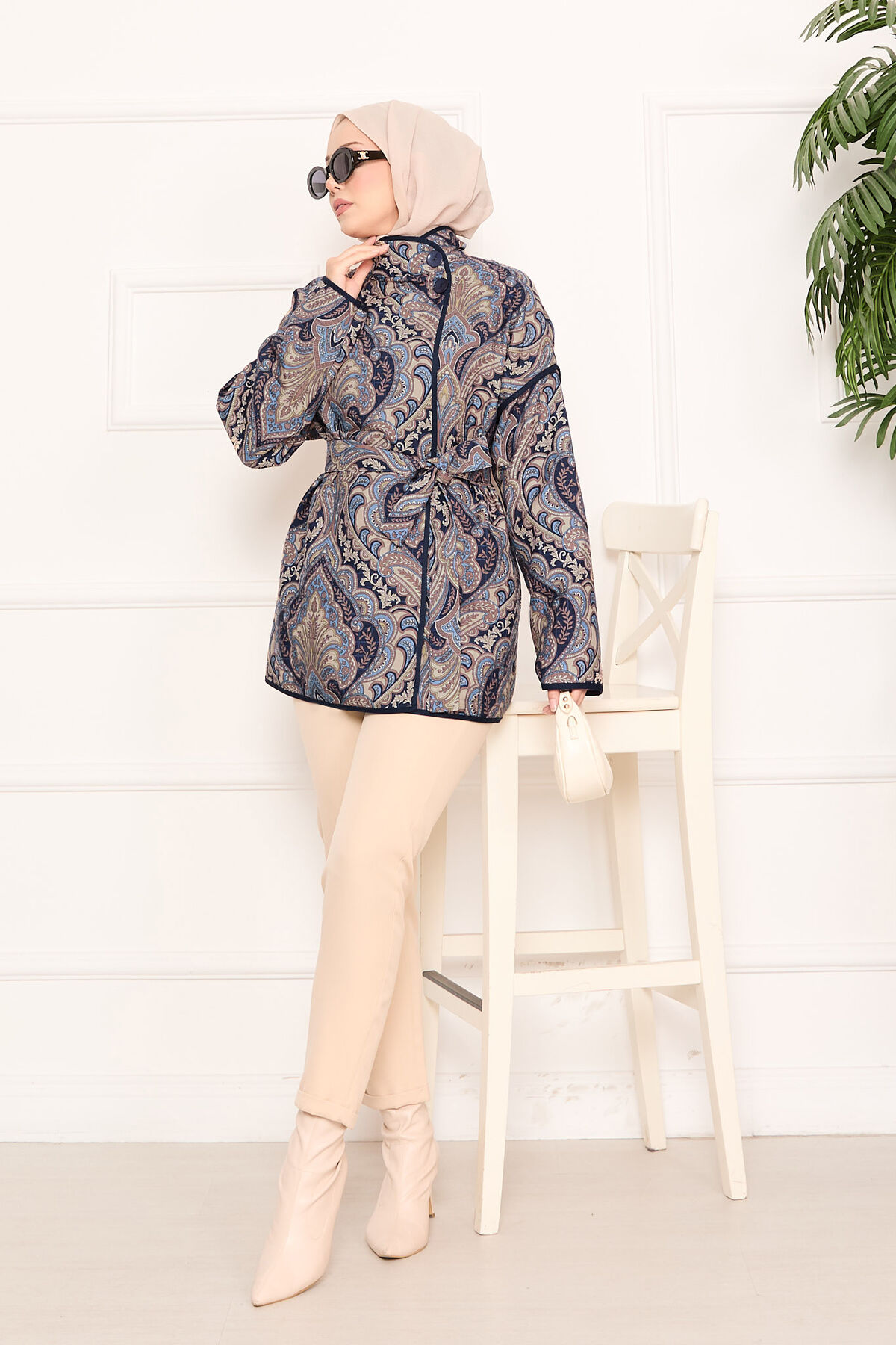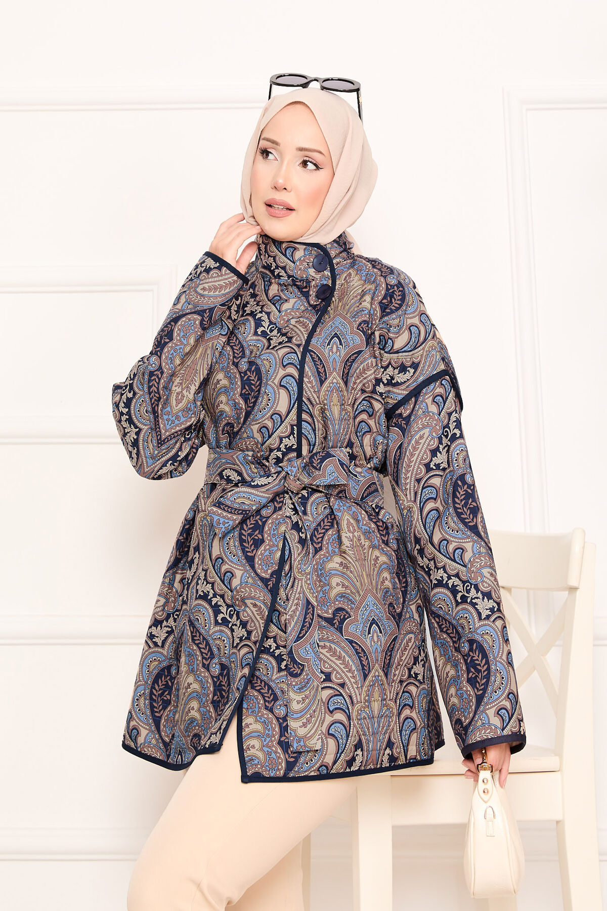 - Ürün Sonbahar & Kış modasıdır. Seyyar kemerli ve yakasında düğme detayı vardır. Etnik desenli kapitone ceket.