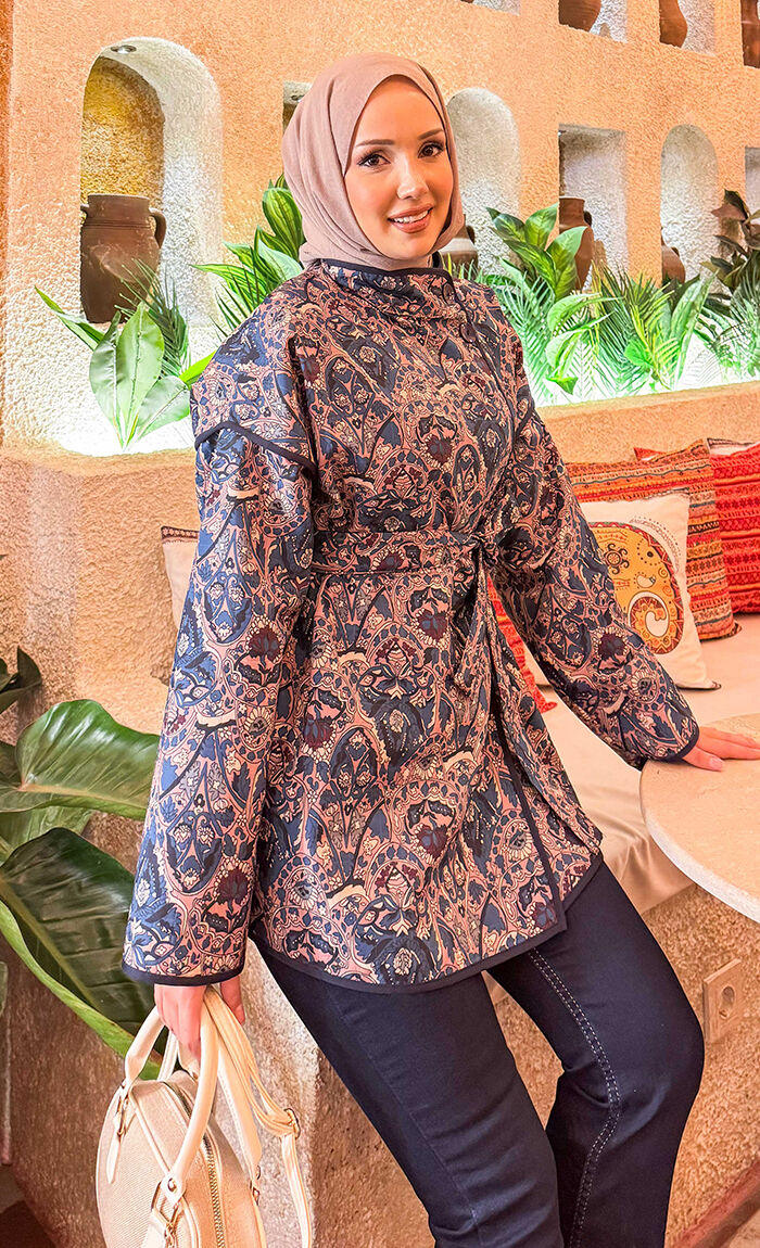 - Ürün Sonbahar & Kış modasıdır. Seyyar kemerli ve yakasında düğme detayı vardır. Etnik desenli kapitone ceket.