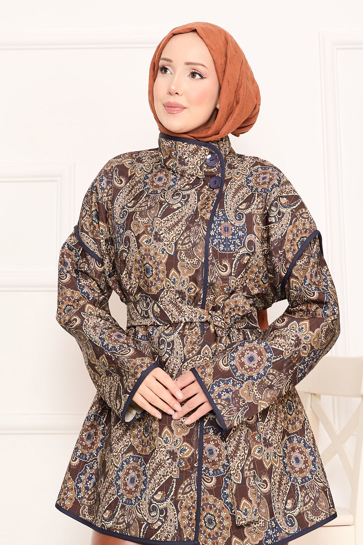 - Ürün Sonbahar & Kış modasıdır. Seyyar kemerli ve yakasında düğme detayı vardır. Etnik desenli kapitone ceket.