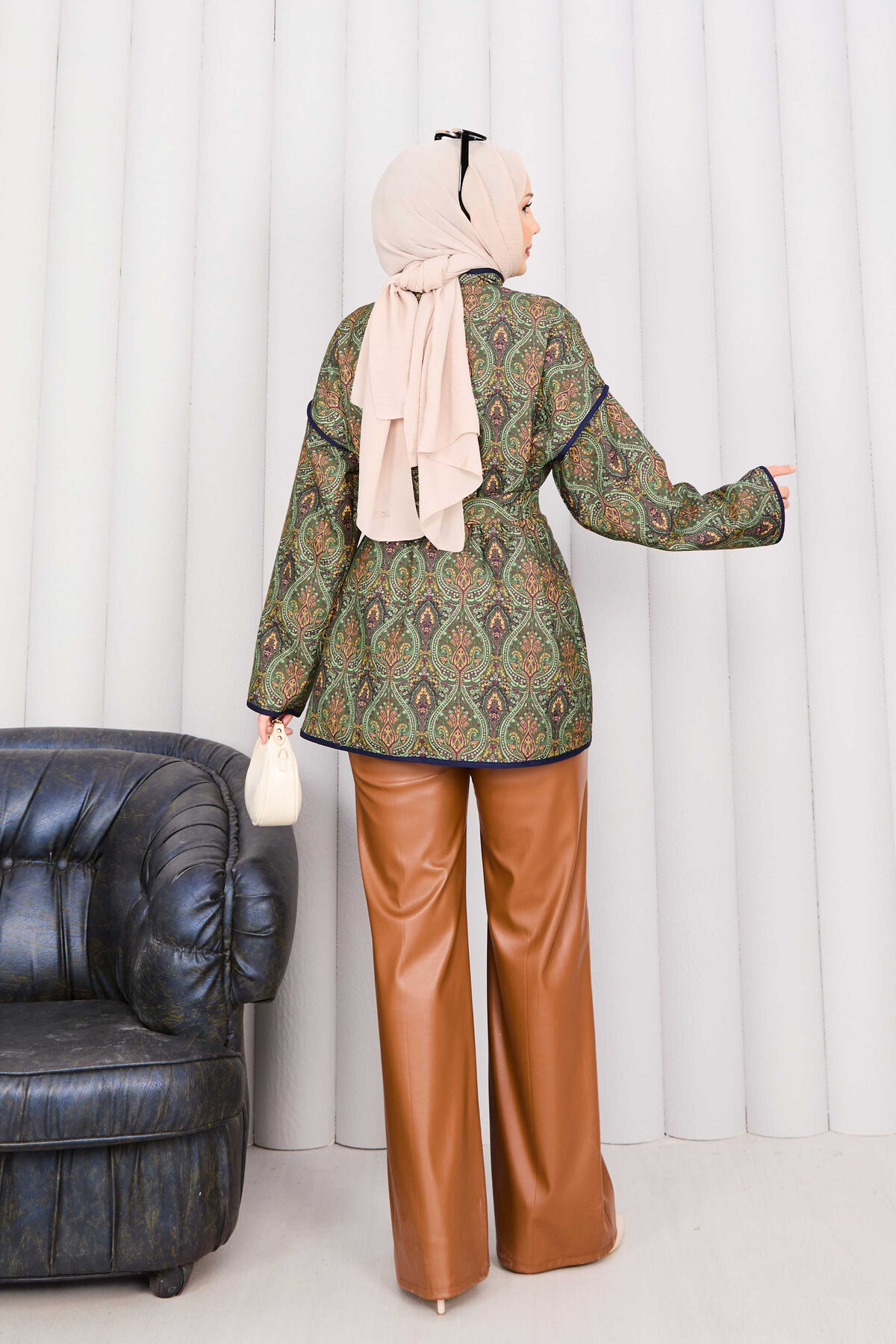 - Ürün Sonbahar & Kış modasıdır. Seyyar kemerli ve yakasında düğme detayı vardır. Etnik desenli kapitone ceket.