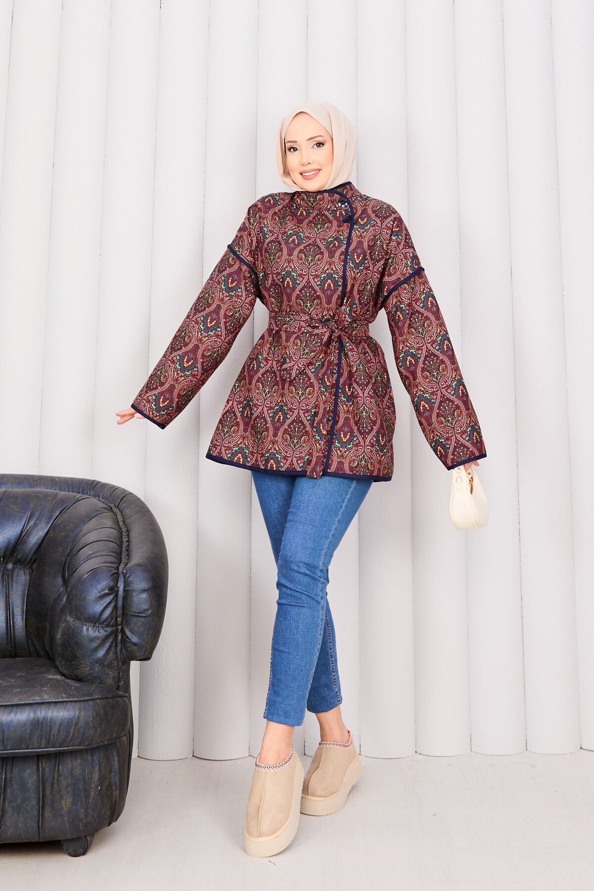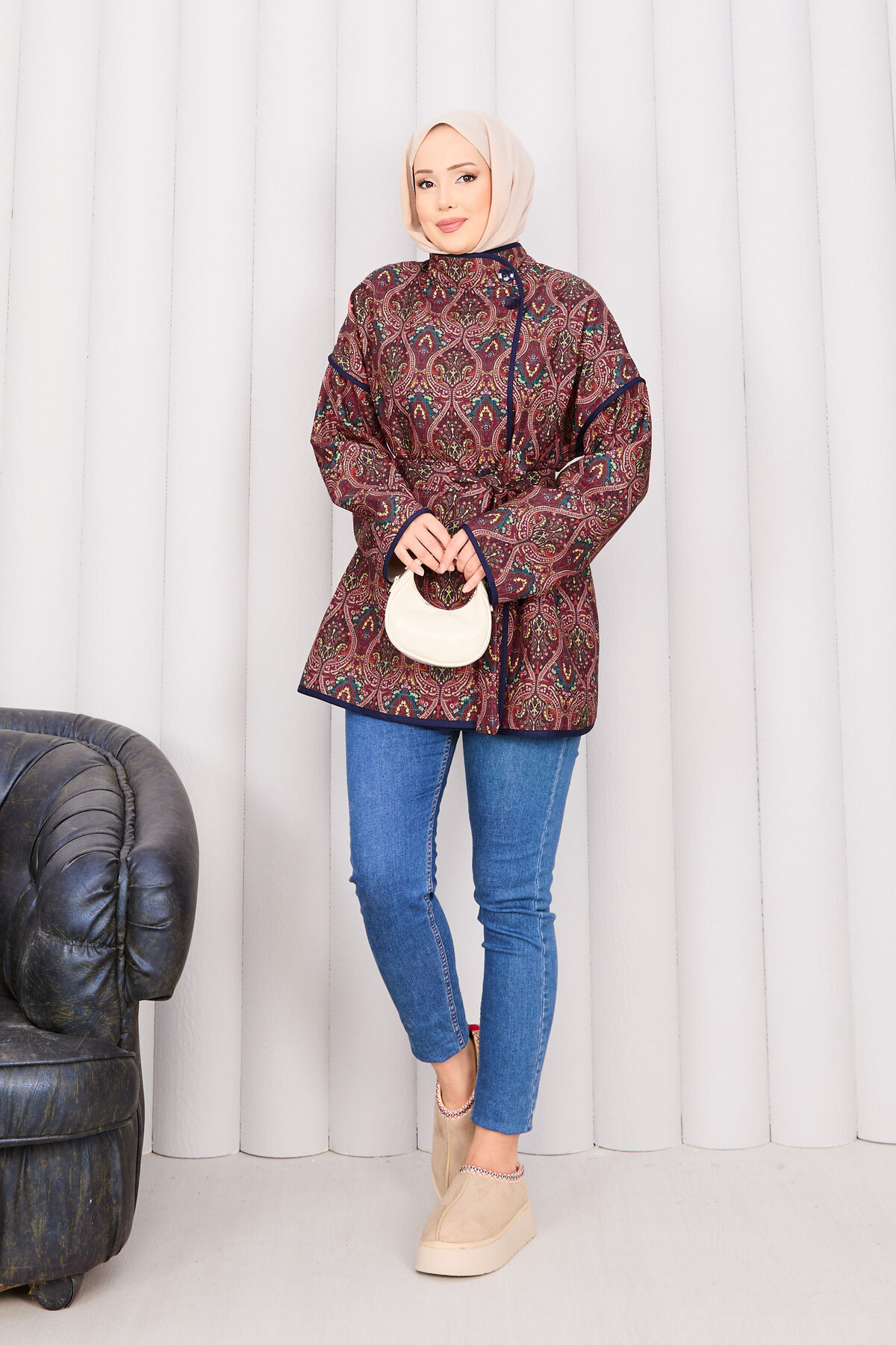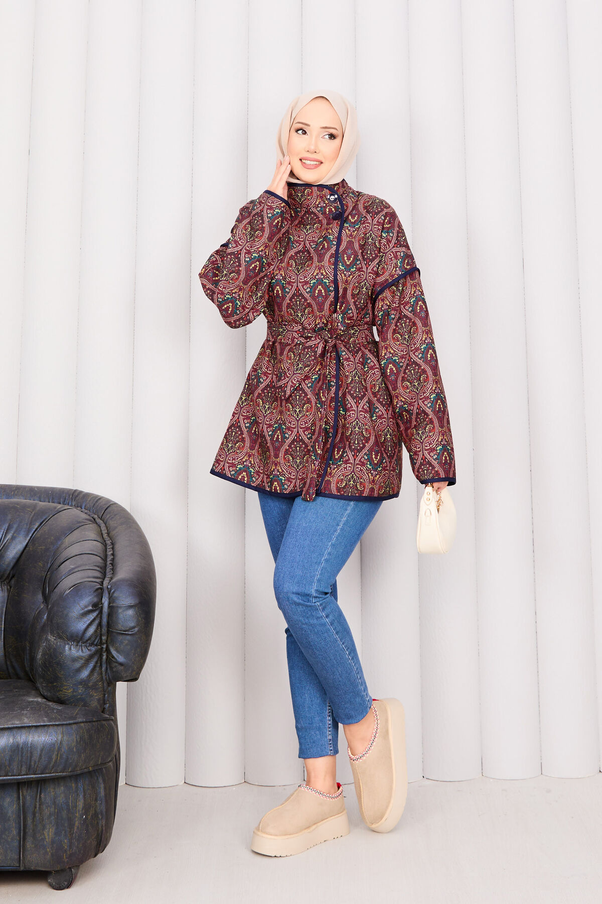 - Ürün Sonbahar & Kış modasıdır. Seyyar kemerli ve yakasında düğme detayı vardır. Etnik desenli kapitone ceket.