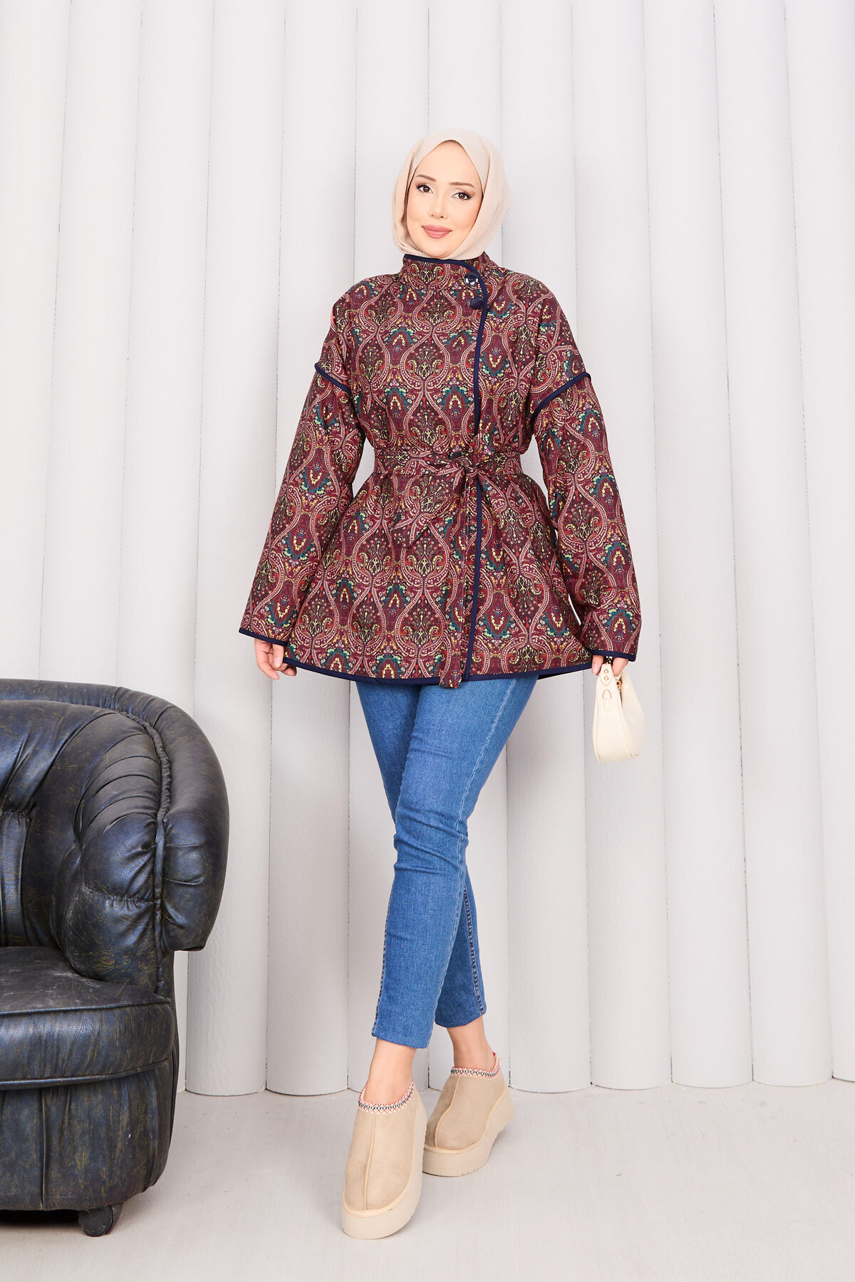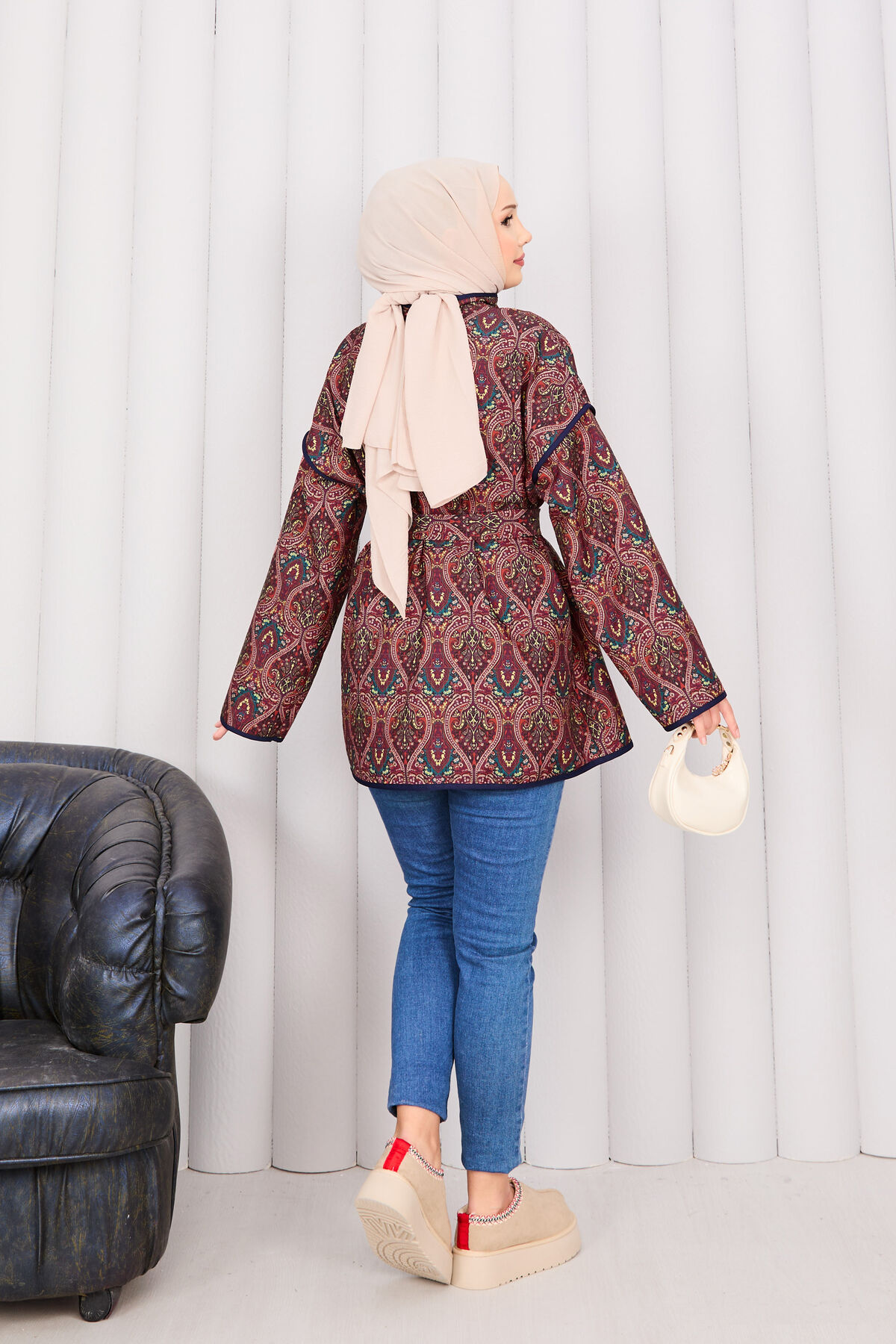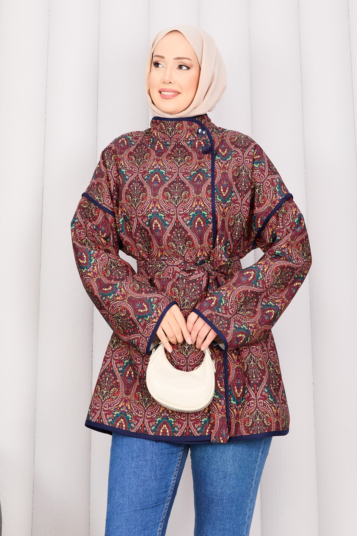 - Ürün Sonbahar & Kış modasıdır. Seyyar kemerli ve yakasında düğme detayı vardır. Etnik desenli kapitone ceket.
