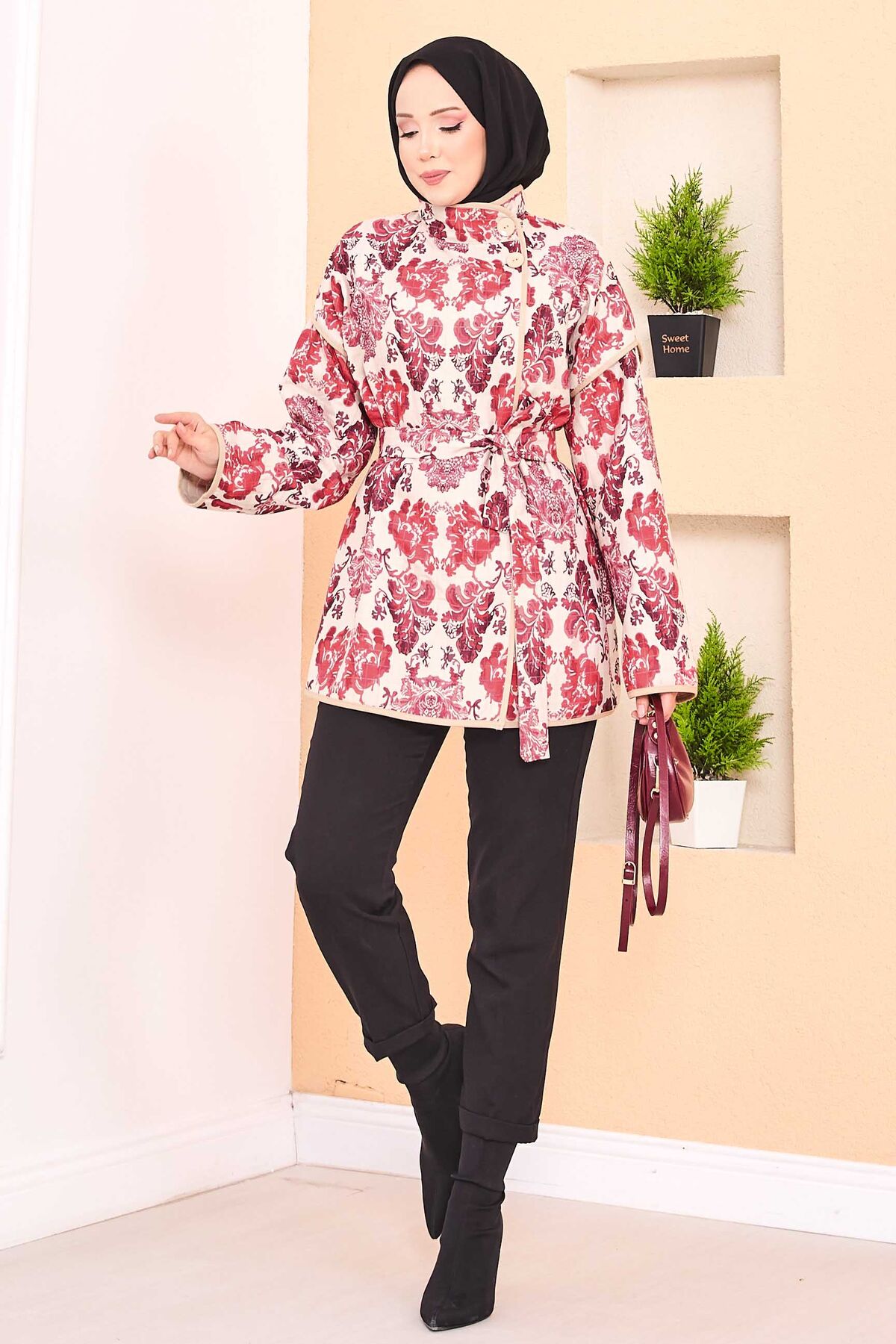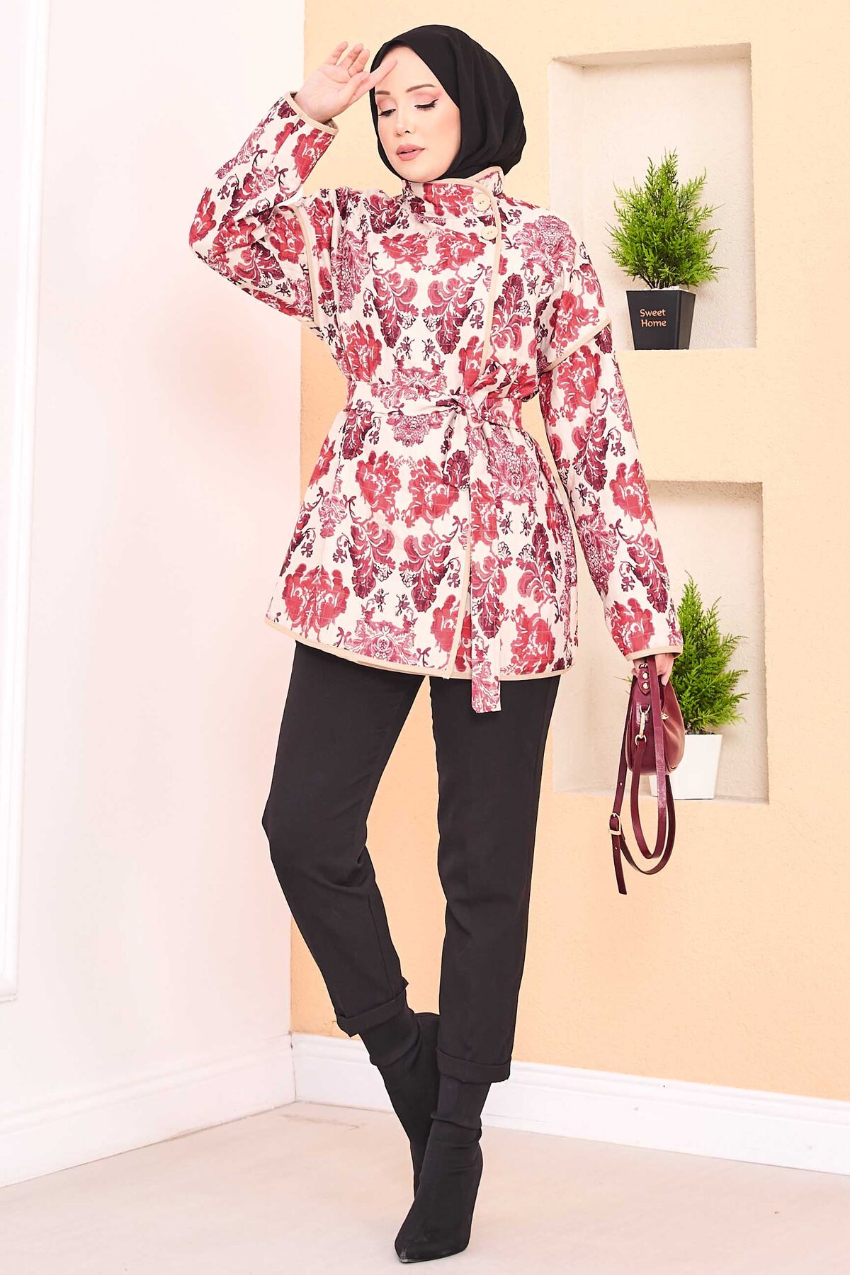 - Ürün Sonbahar & Kış modasıdır. Seyyar kemerli ve yakasında düğme detayı vardır. Etnik desenli kapitone ceket.